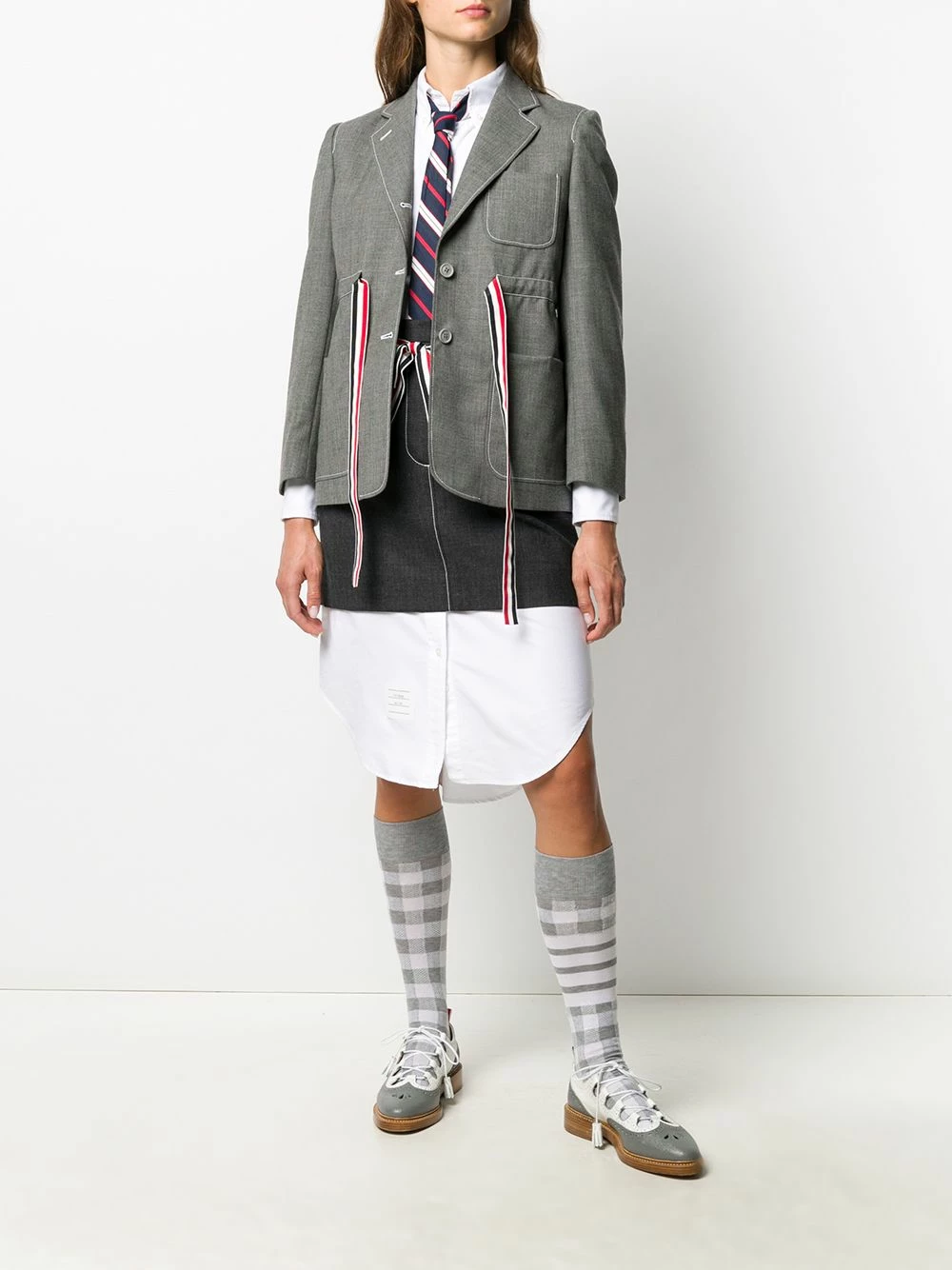 Saved by the bell! This tie waist mini sack skirt will fulfil all your fashion fantasies; with a tricolour stripe waist tie to add that final Thom Browne flourish. What’s not to love?