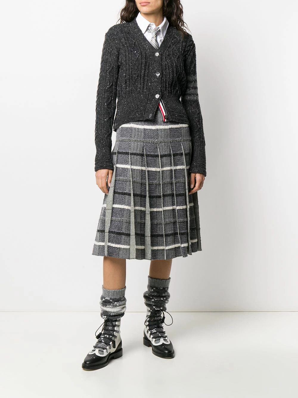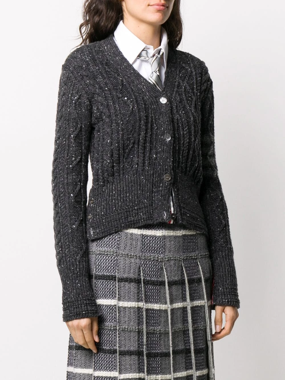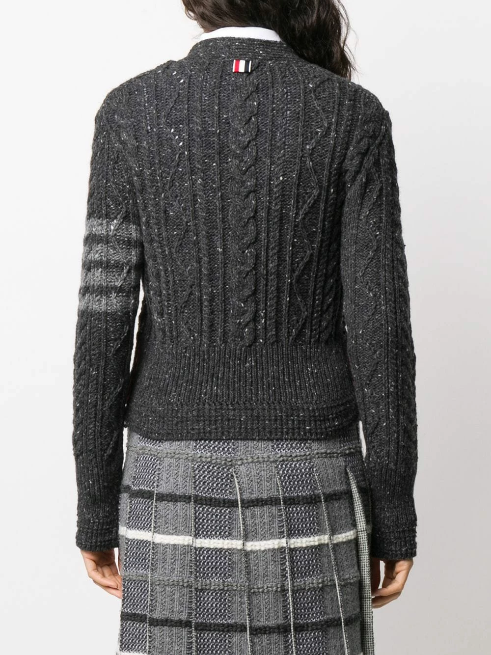Protect yourself from the cold days in style with this dark grey wool/mohair 4-bar cable cardigan from Thom Browne. Designed with a v-neck, this piece will add an elegant touch to any look you wear. Super comfy. Super stylish. Featuring a v-neck, a front button fastening, a stripe detail to the side, long sleeves and a ribbed hem and cuffs.