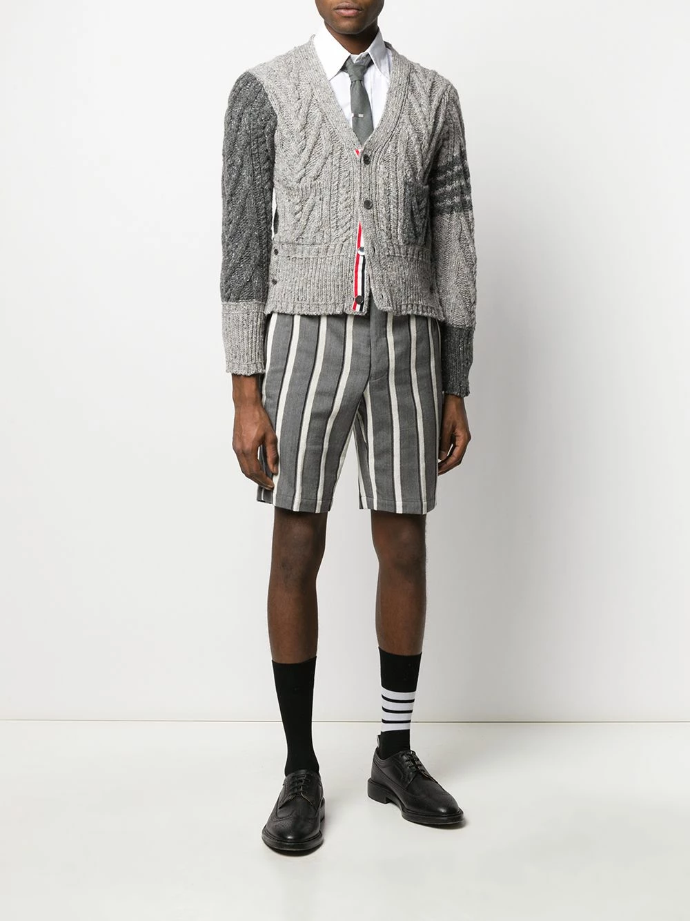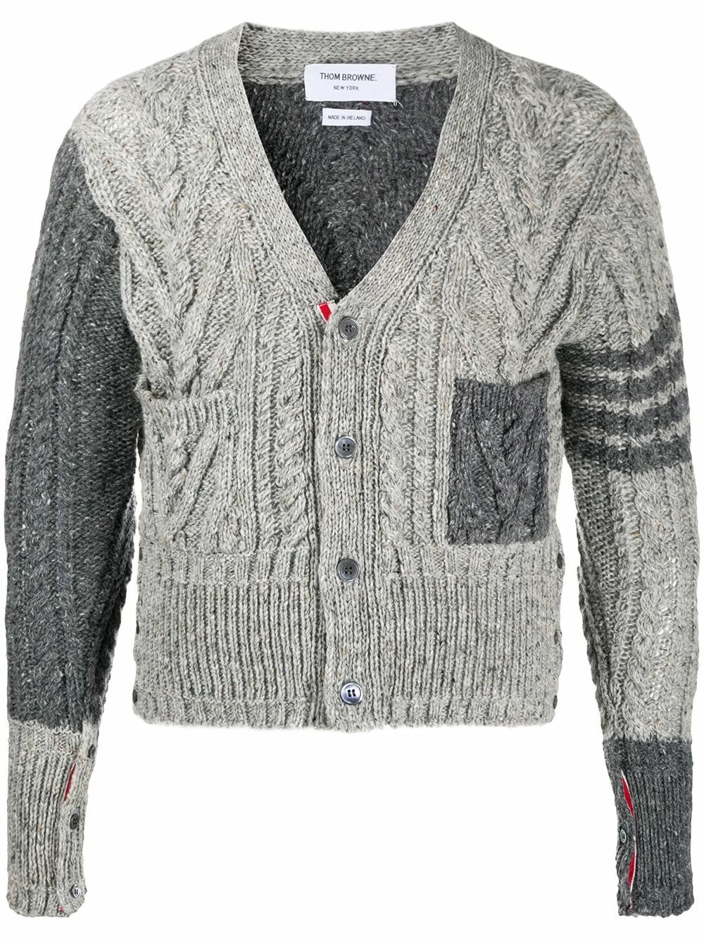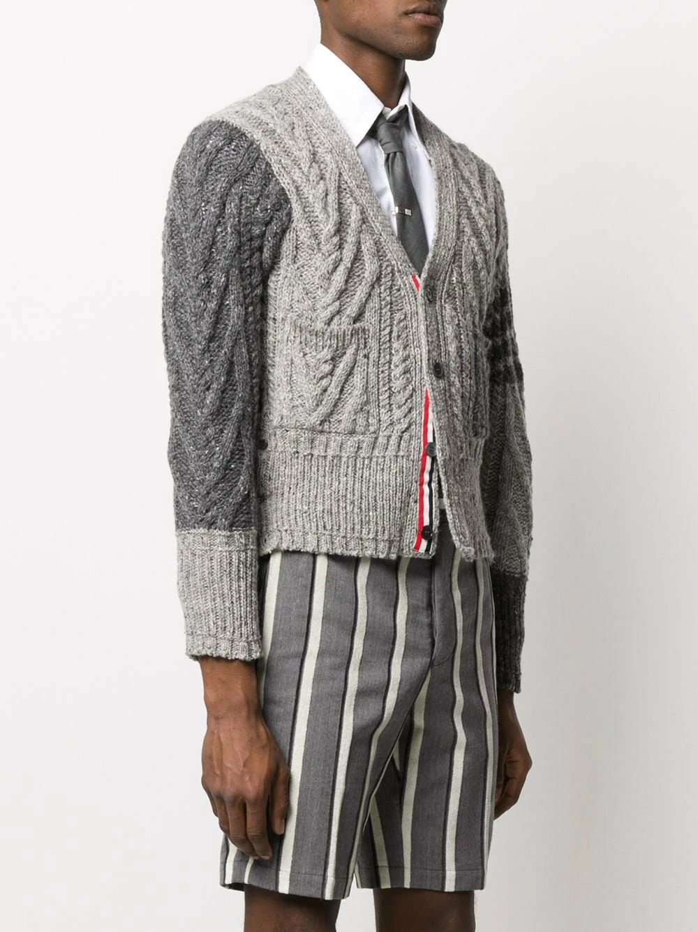 Four strikes and you’re Thom Browne. Crafted from tonal grey wool, this Aran knit cardigan from Thom Browne is unique in its shrunken design and 4-Bar stripe detailing to the left arm. Elevate your knitwear game. Featuring a v-neck, a front button fastening, an aran knit, a side button fastening and two front pockets.