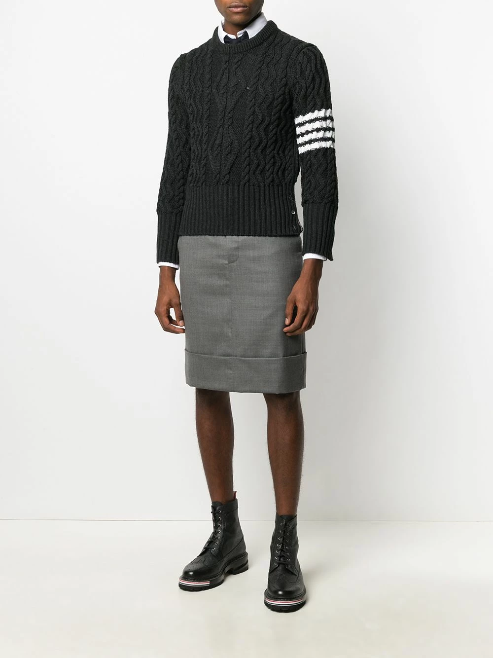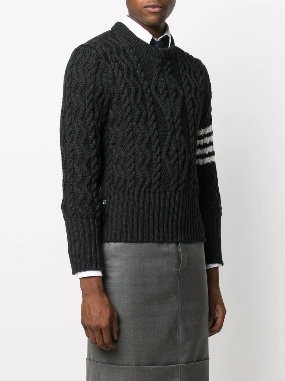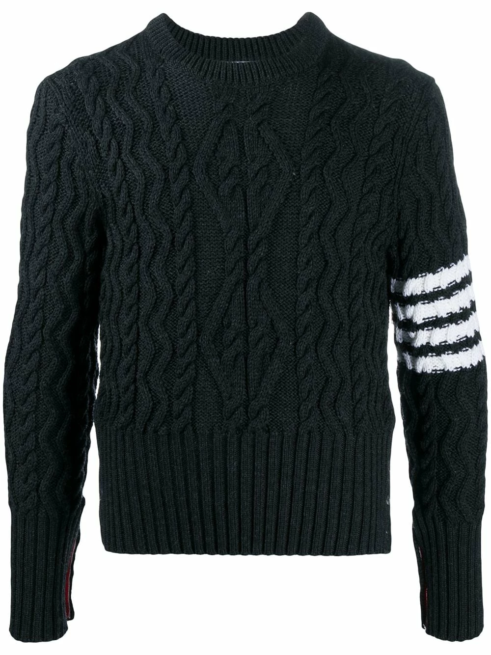 Something about this Thom Browne jumper makes us want to sail away. Maybe it’s the classic cable knit, cosily crafted from merino wool. We can envision ourselves on a yacht, looking out at the horizon.