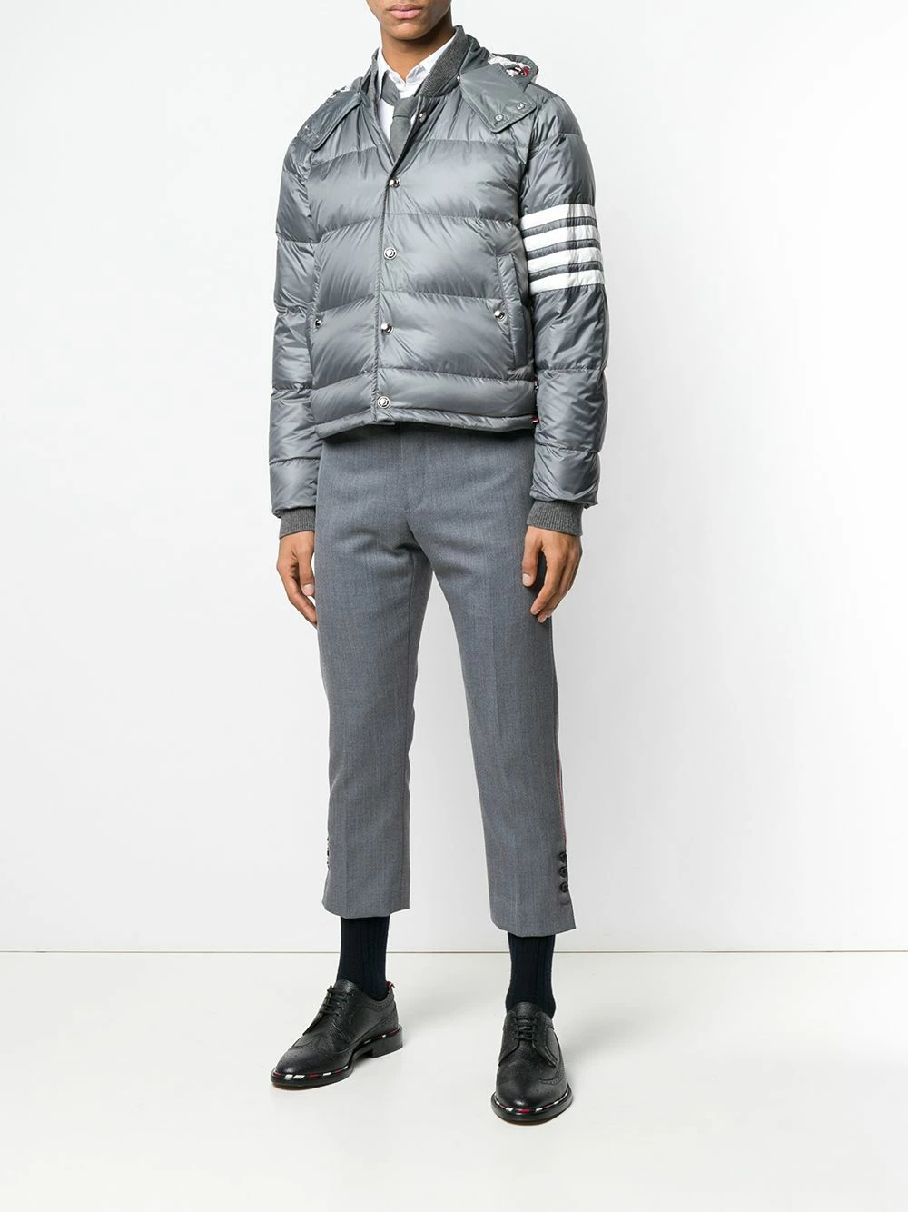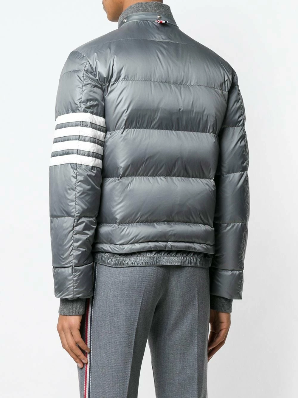 Bundle up, Thom Browne style. This quilted jacket is inspired by classic bomber jackets and is detailed with the signature 4-Bar stripe on the sleeve. Keep cosy in style.