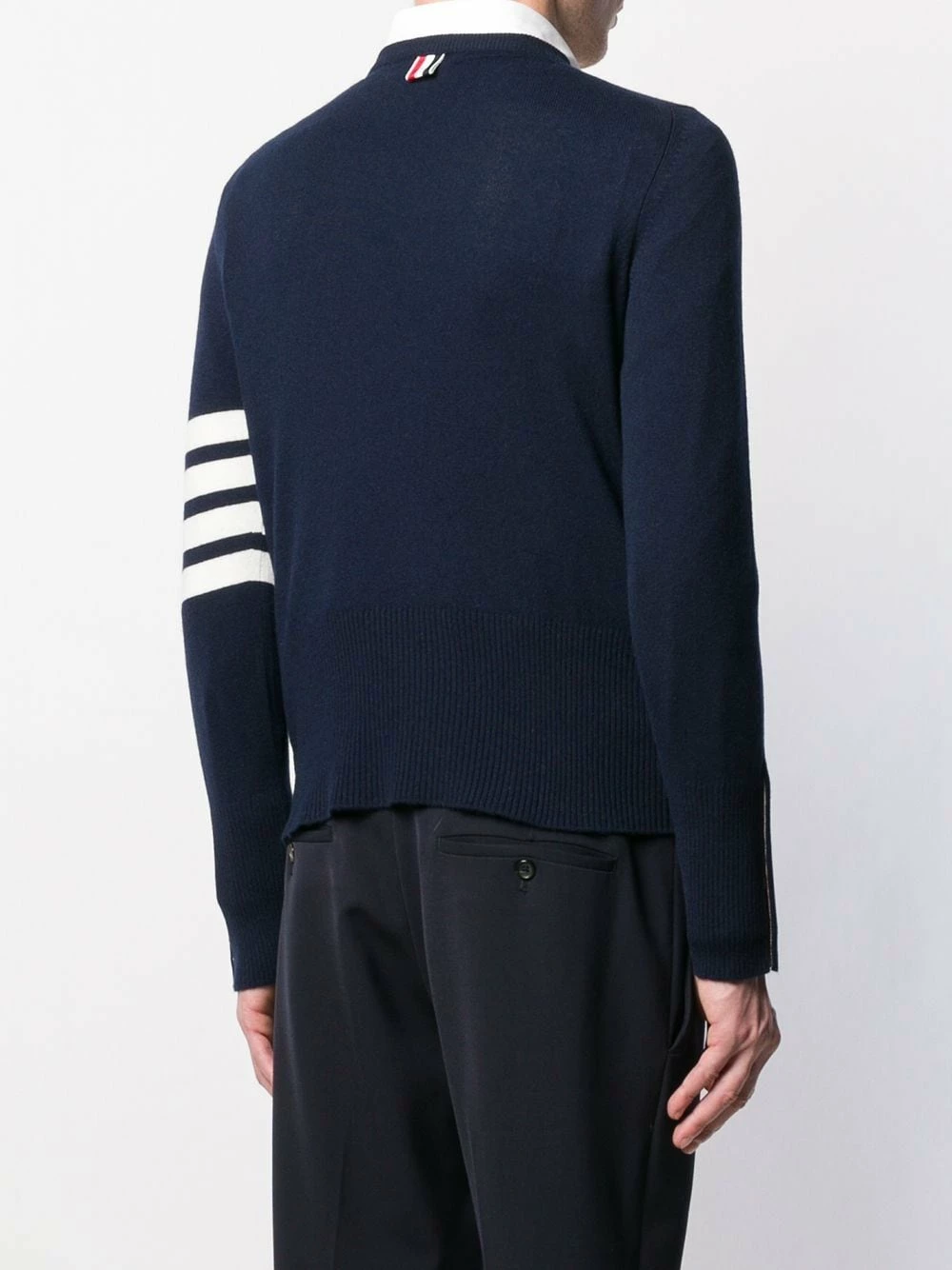Casual and comfortable. This knitted jumper from Thom Browne is crafted from soft navy cashmere for an elegant take on everyday dressing. Layer up and look great.