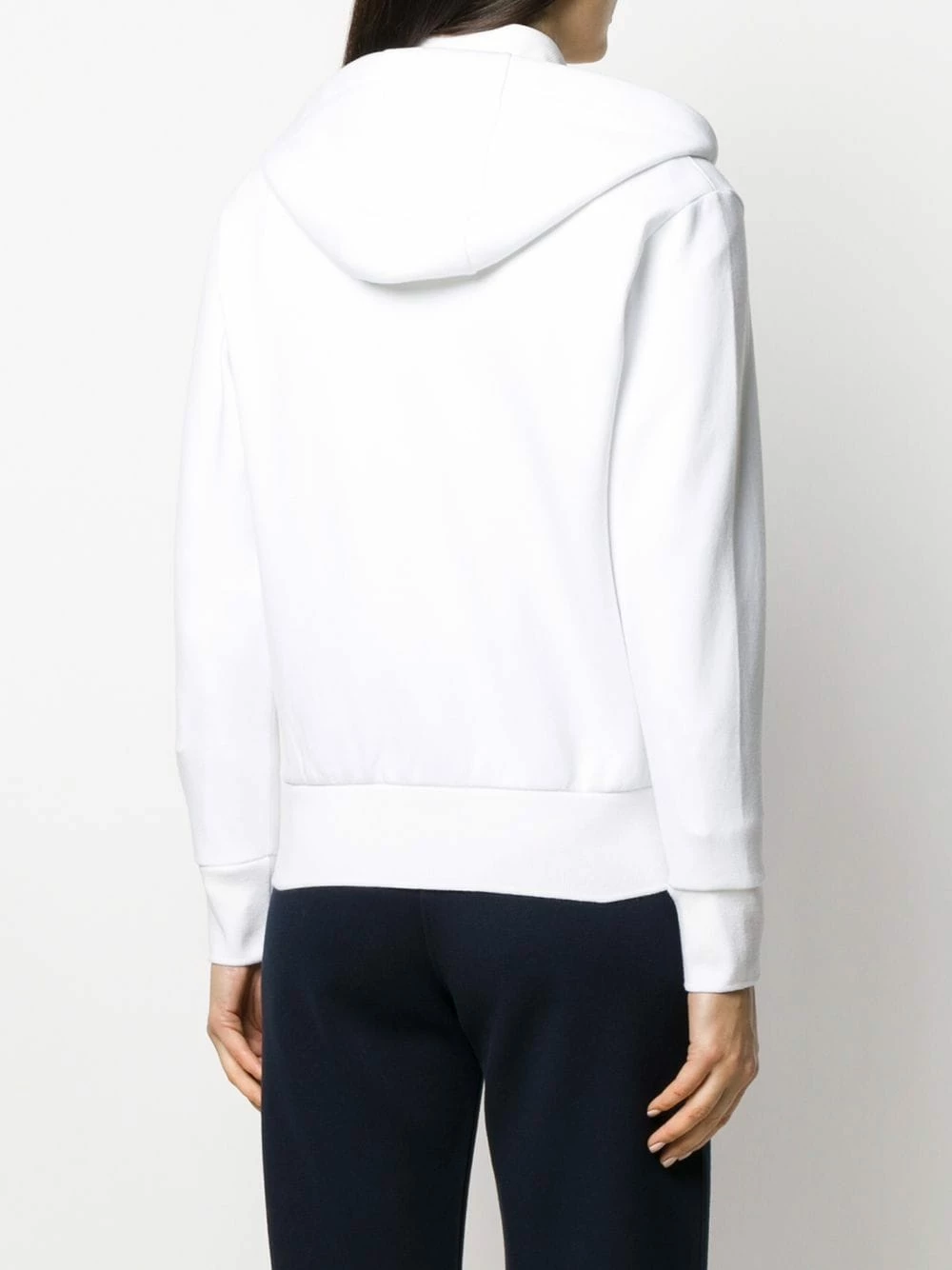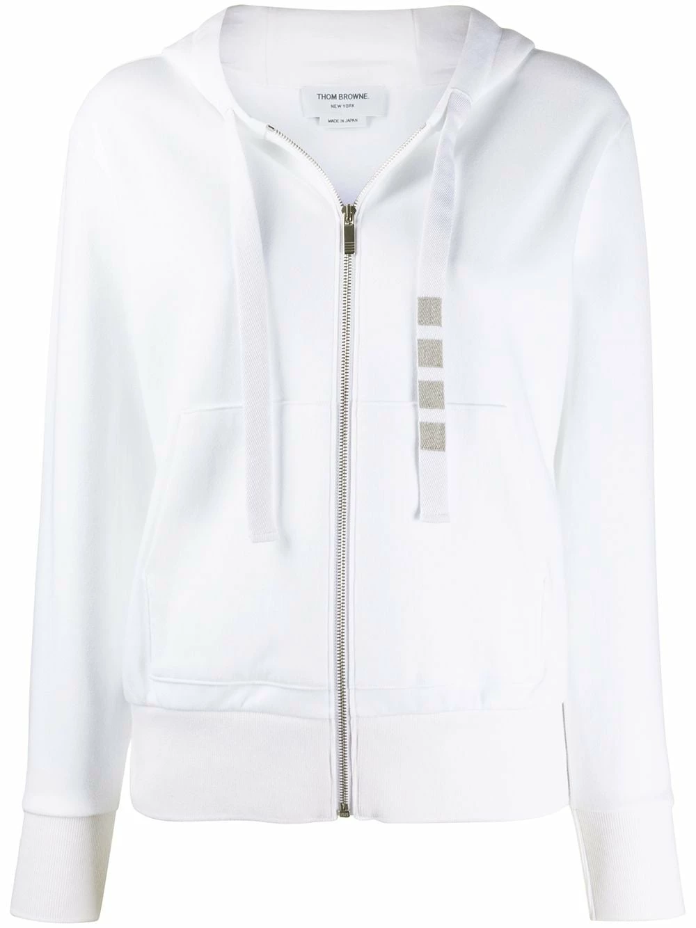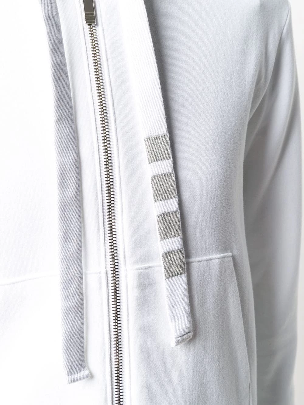 Cut yourself some slack. Made from white, this zip-up hoodie in compact double knit cotton with 4-bar twill drawcord from Thom Browne is meant to simplify your life. Take advantage of that. Featuring a hood with drawstring tie fastenings, long sleeves, a kangaroo pocket, ribbed knit detailing, a straight hem and a tricolour grosgrain tab on the rear.