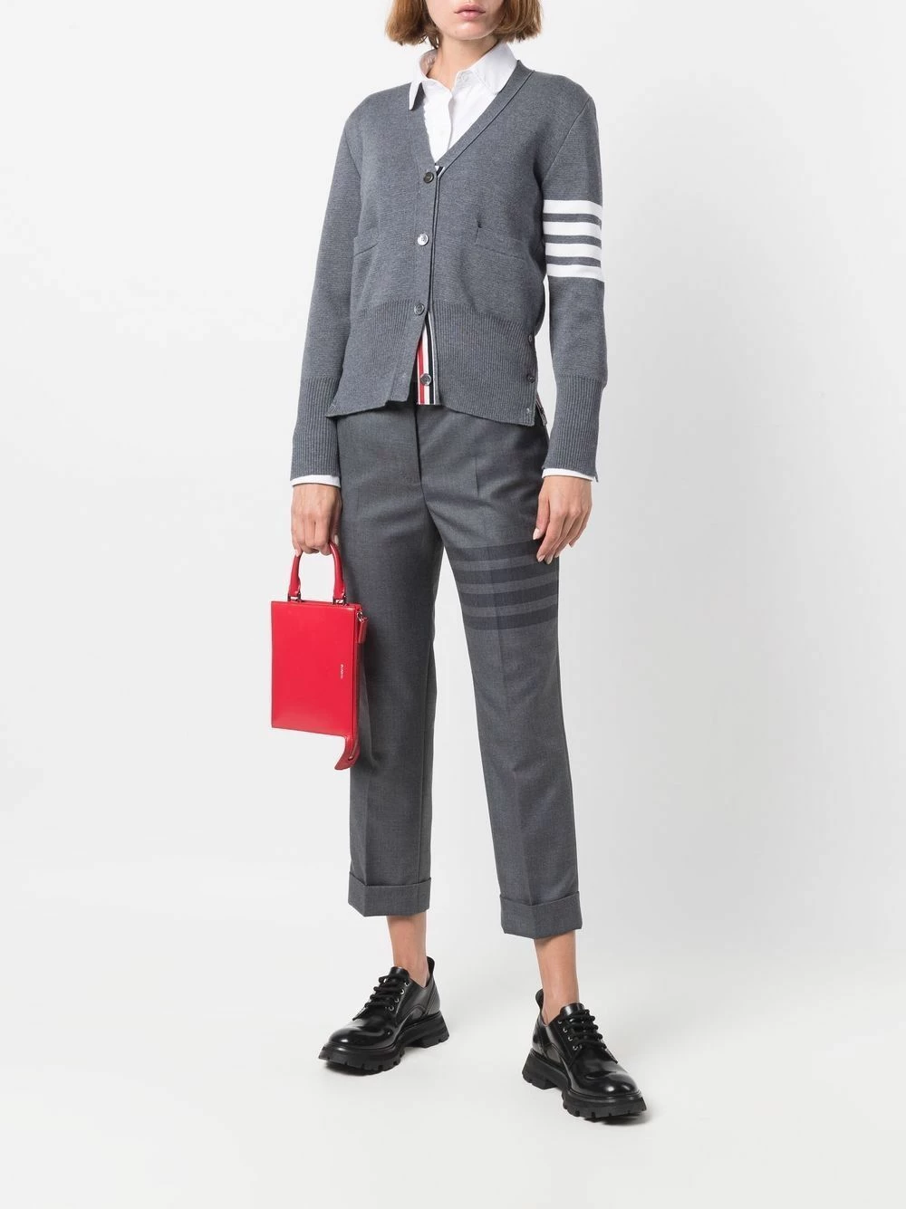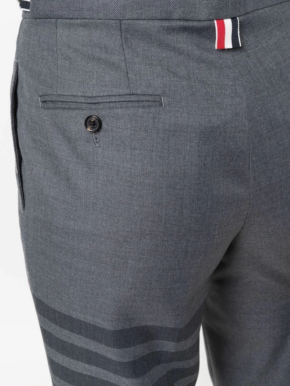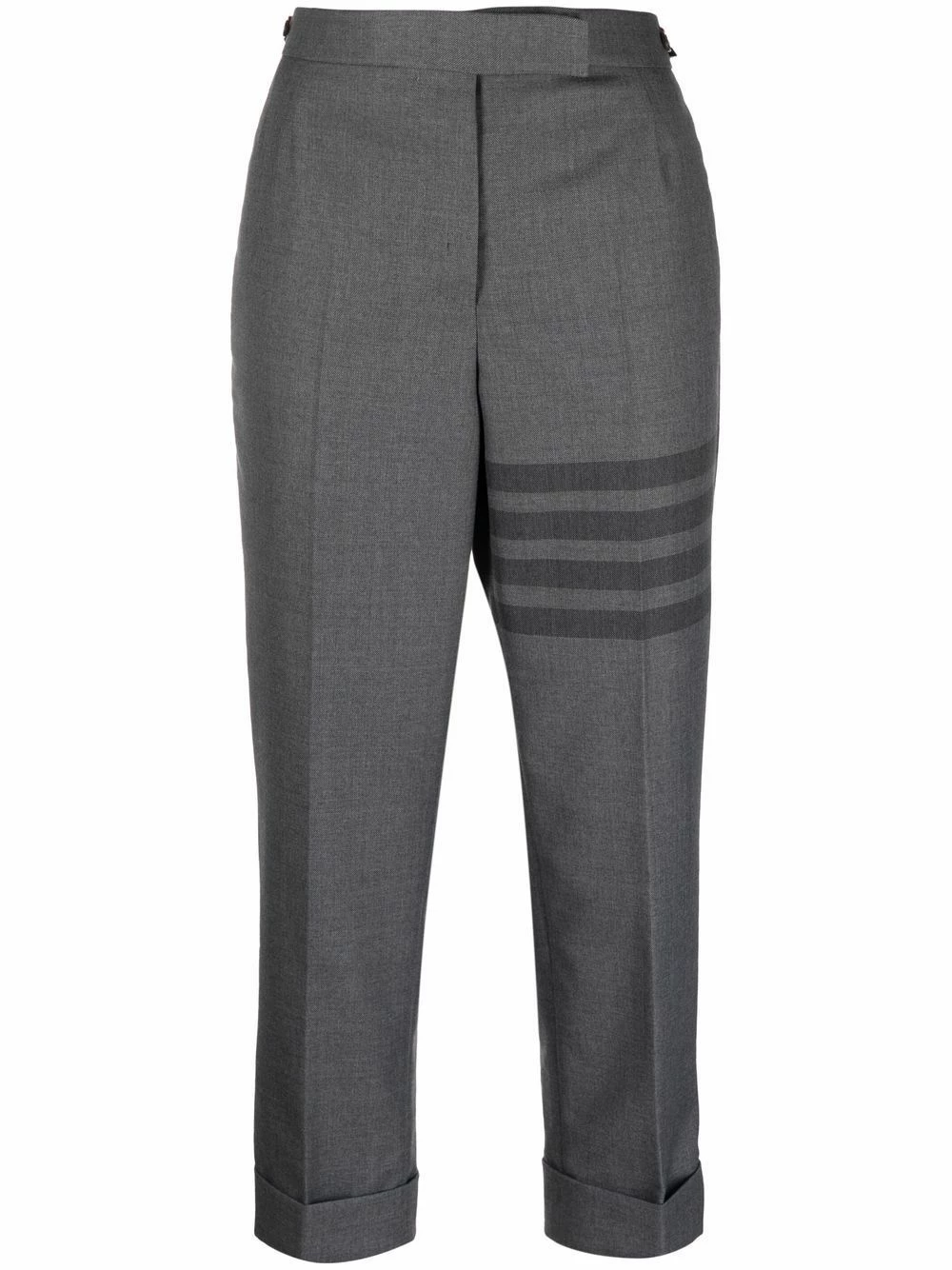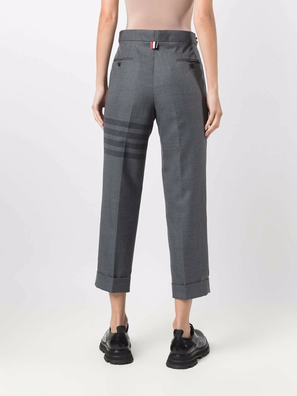Mirroring the clean lines and signature house codes of the American brand, these cropped wool-blend trousers are presented as part of Thom Browne’s AW21 collection. Detailed with the house’s RWB grosgrain loop and 4-Bar motif, the pair brings fashion knowledge to the scene.