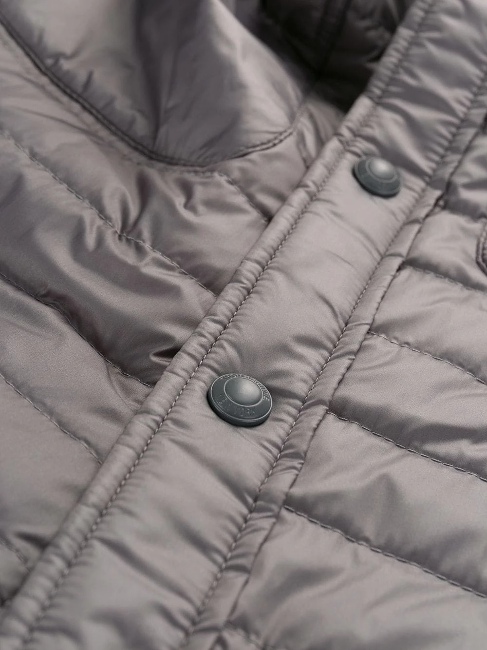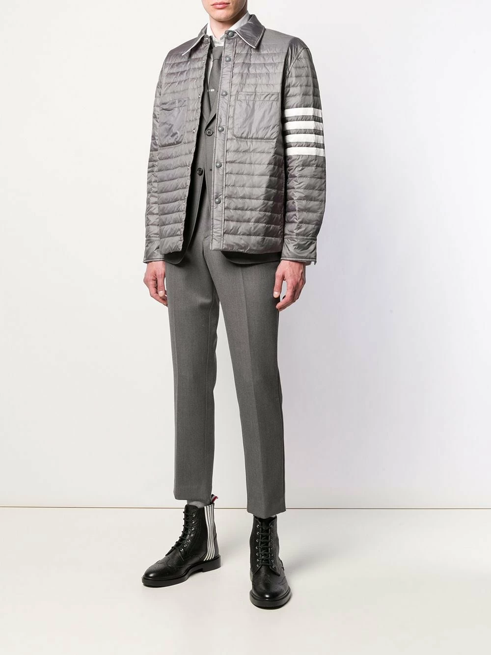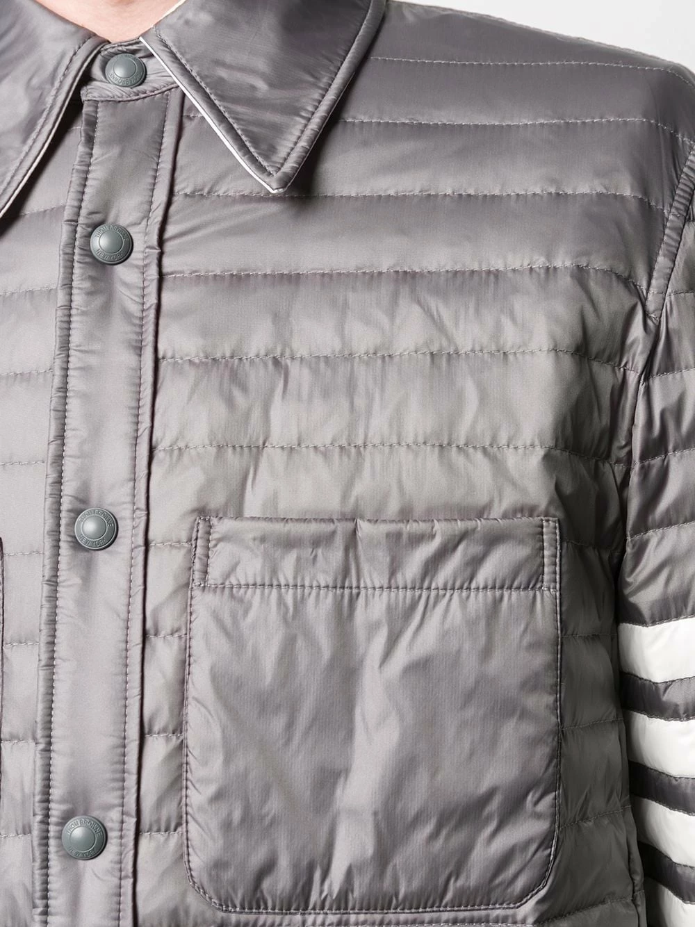 Combining highest-quality fabrics and a conservative sensibility with a touch of irreverence and humour, this medium grey down fill 4-Bar shirt jacket from Thom Browne is a classic. Featuring a classic collar, long sleeves, two chest pockets and a press stud fastening.