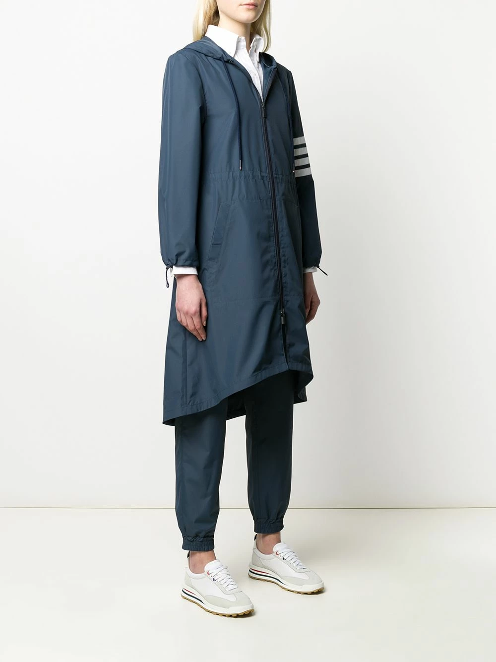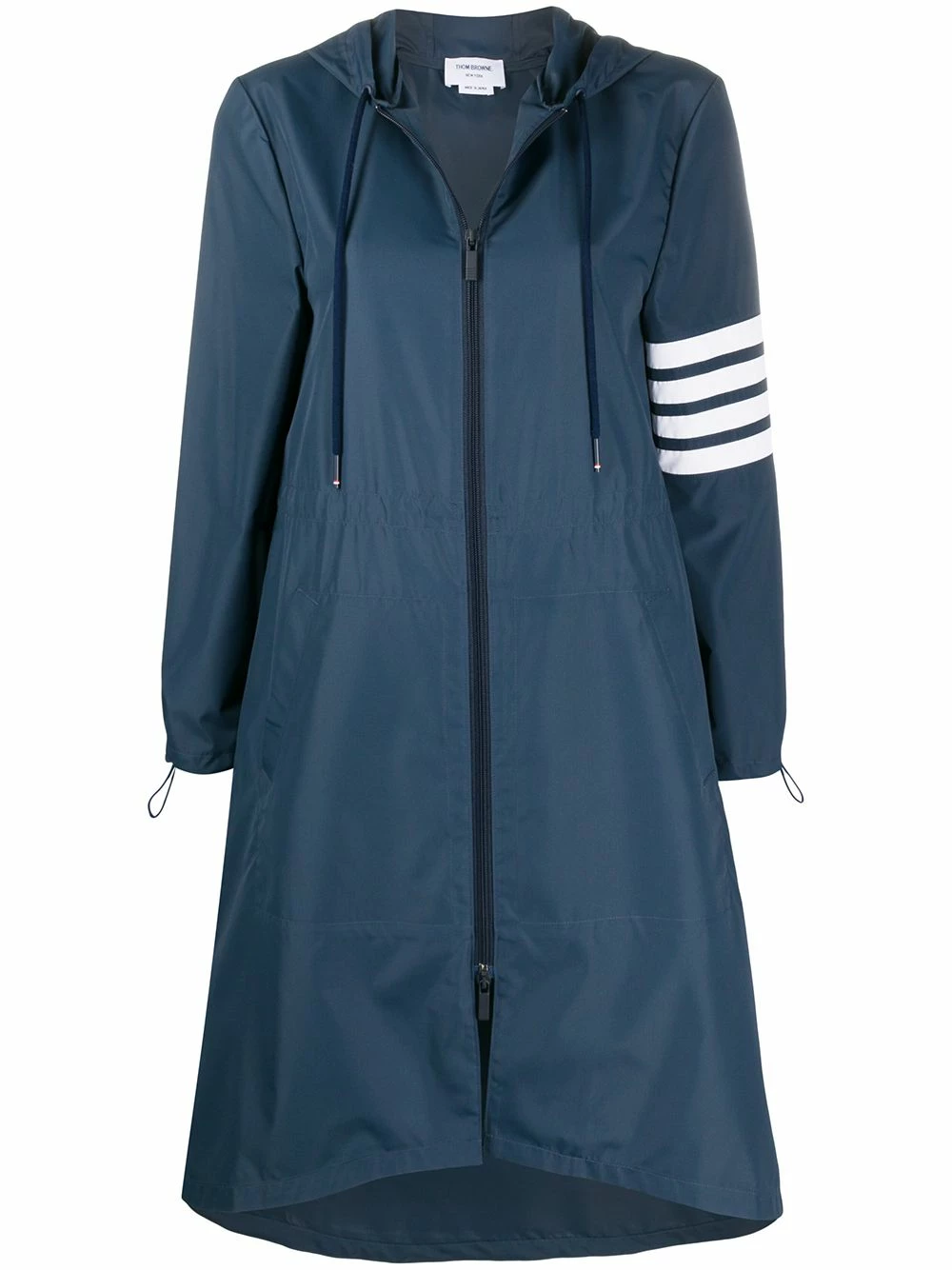 A sporty look with an elegant finish – that’s something only Thom Browne can achieve. Crafted in navy blue, this Thom Browne flyweight tech hooded parka has the signature four-bar stripe on the arm and an elongated back hem. Featuring an a-line shape, a lightweight construction, a signature tri-colour striped trim, a drawstring hood, an invisible front zip fastening, long sleeves, a drawstring waist, two front pockets, a full lining, a four-bar stripe detail, drawstring cuffs and an elongated back hem.