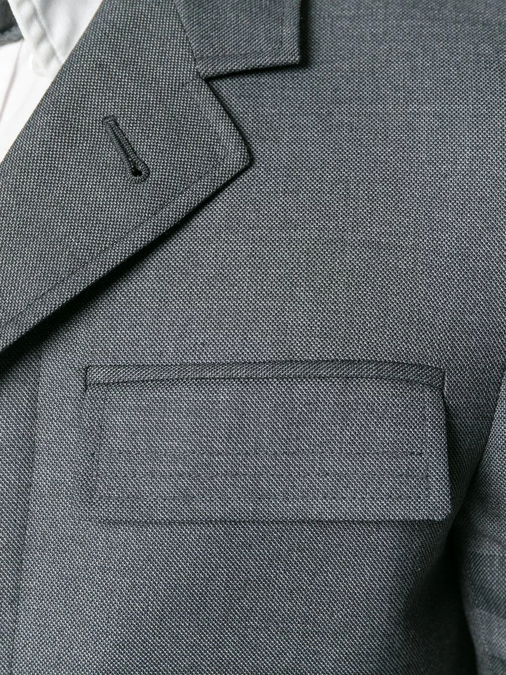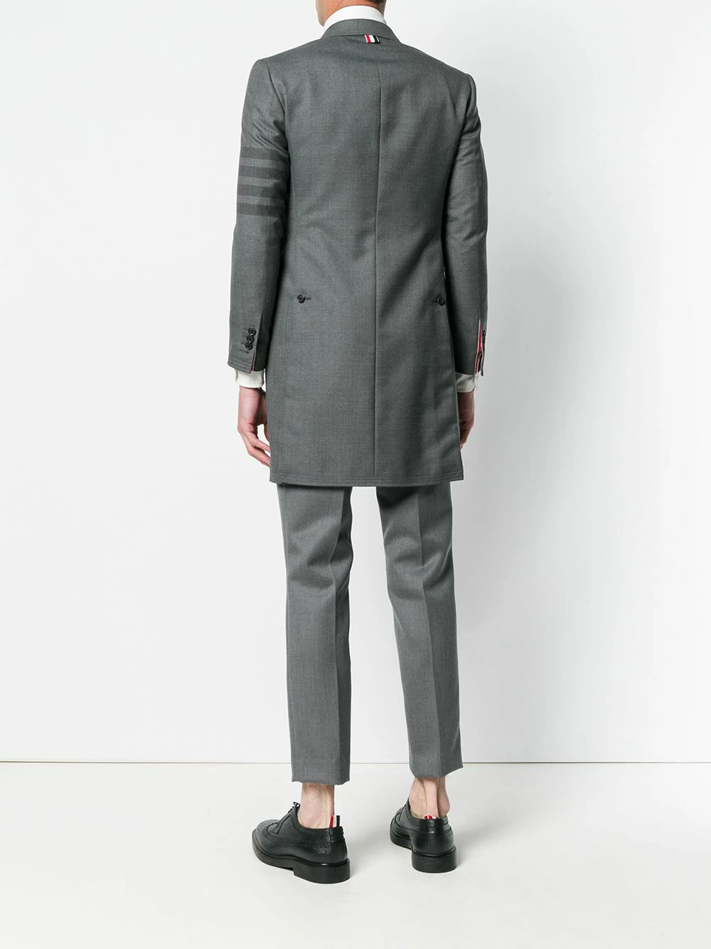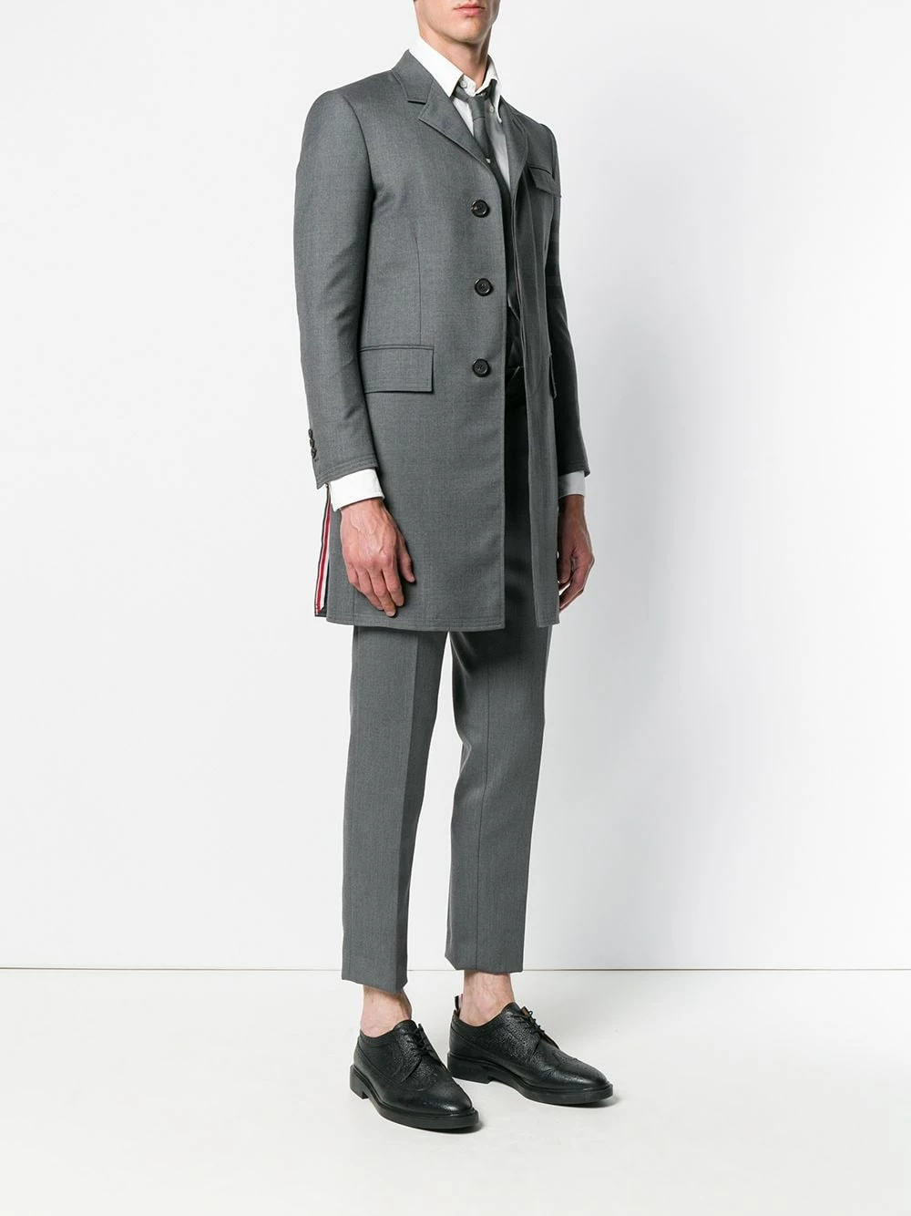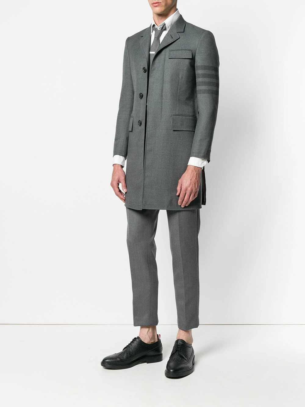 We will be wearing this grey wool 4-Bar Chesterfield coat from Thom Browne on our weekly visits to her Majesty, the Queen, trying to impress her as much as we can. Yes, we’re obviously referring to our grandmother. But she is the Queen of our family, so… Featuring a spread collar, a chest pocket, a concealed front fastening, front flap pockets, long sleeves, button cuffs, a double vent to the rear and a signature 4-Bar detail to the left arm.