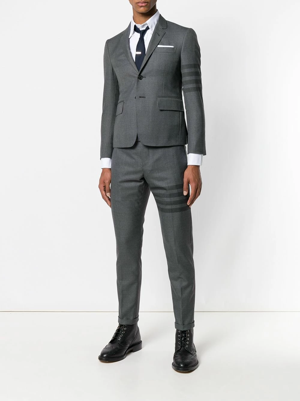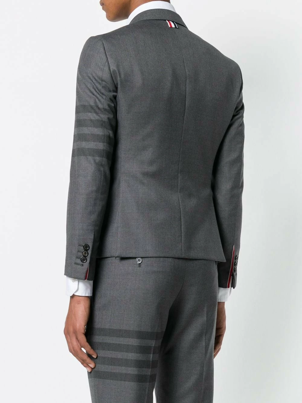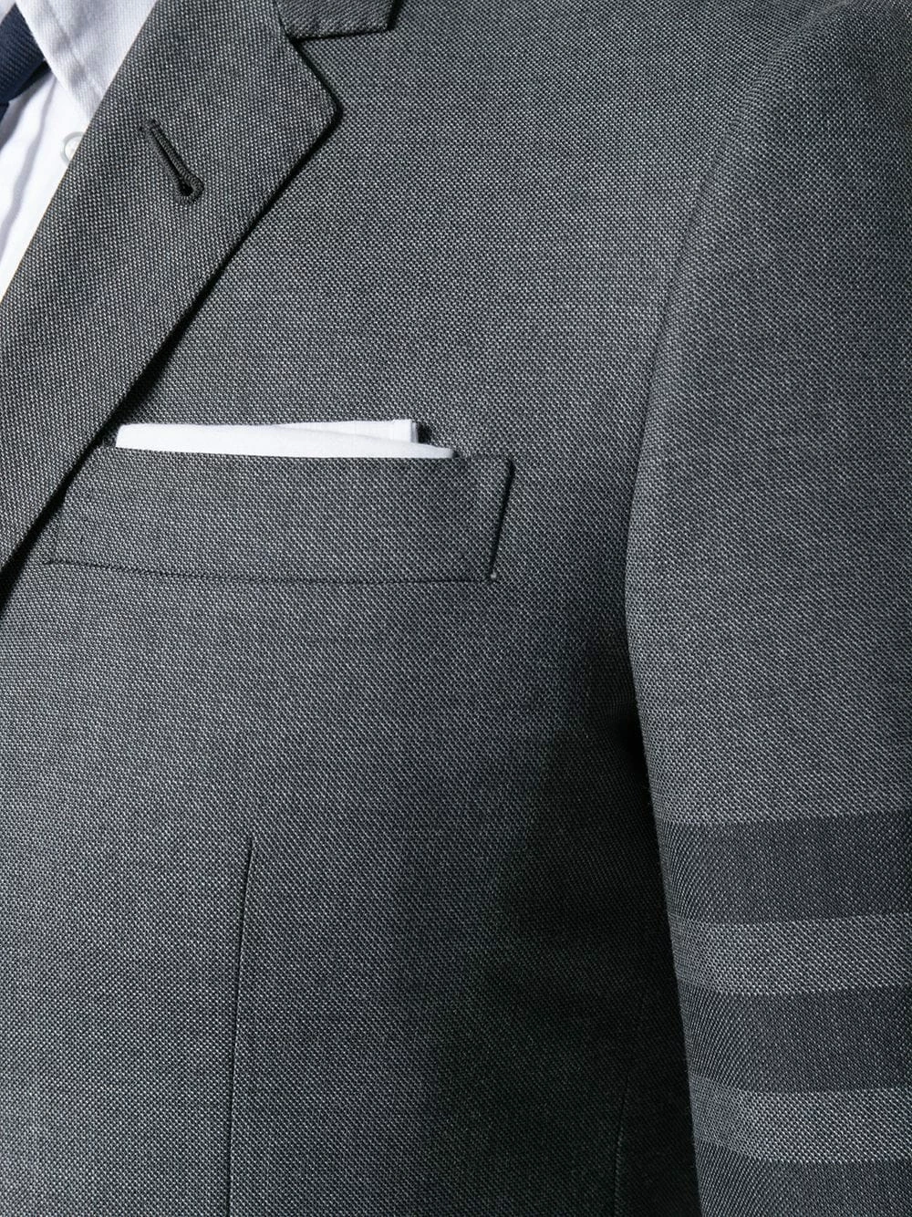 Grey wool-blend 4-Bar High-Armhole Sport Coat from Thom Browne featuring a slim fit, cropped, notched lapels, a front button fastening, a chest pocket, front flap pockets, a double vent to the rear, button cuffs, a signature tri-colour striped trim, a striped lining and four-bar stripes at the sleeve .