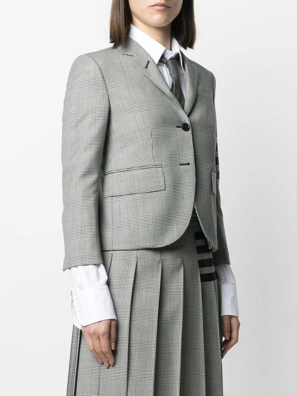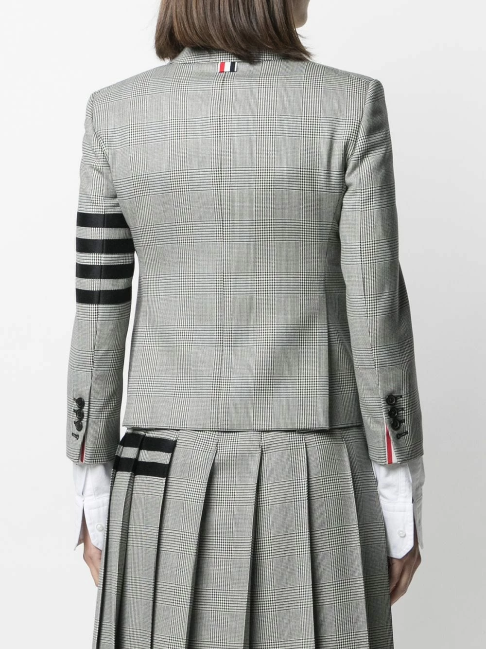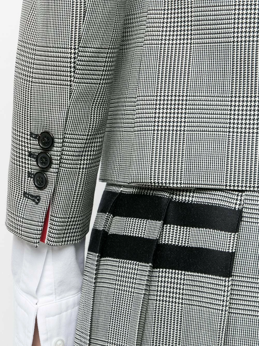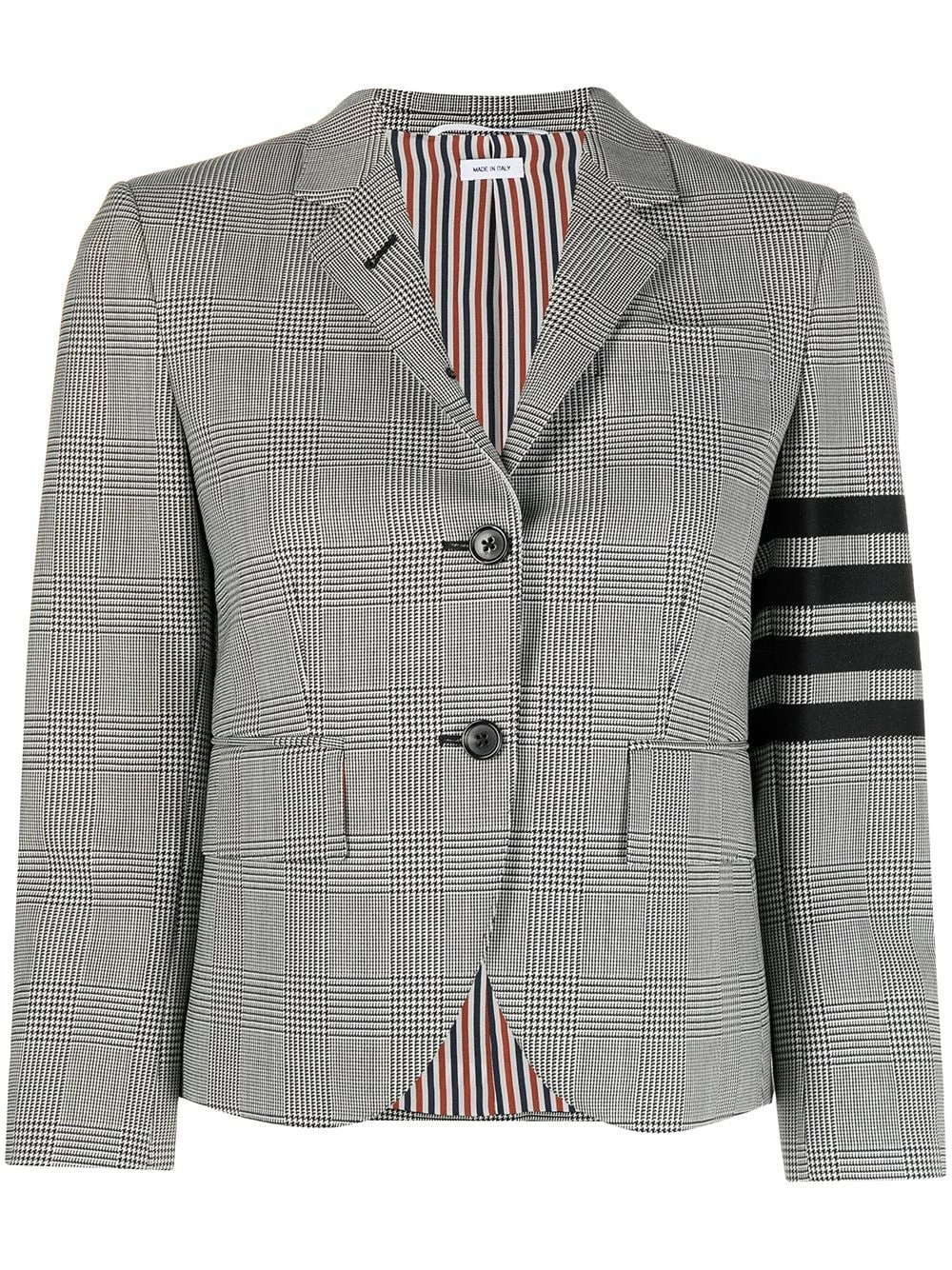 With a Thom Browne jacket hanging in your wardrobe you’ll always have an excuse to dress up. Fabricated in Italy from wool, the signature cropped silhouette is detailed with a houndstooth pattern and a bold 4-Bar stripe to one sleeve. Make every day extra special. Featuring notched lapels, a front button fastening, a broad welt chest pocket, front flap pockets, cropped sleeves, button cuffs, a full lining and a straight hem.