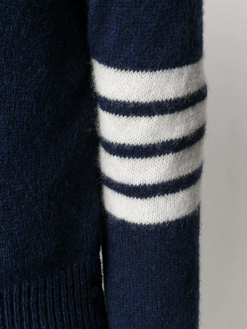 Nothing says iconic quite like that signature 4-Bar stripe. Which is exactly why this navy wool 4-Bar jumper from Thom Browne is here to leave a lasting impression. Stripes for the win. Featuring a round neck, long sleeves, a knitted style, a ribbed hem and cuffs and a striped pattern.
