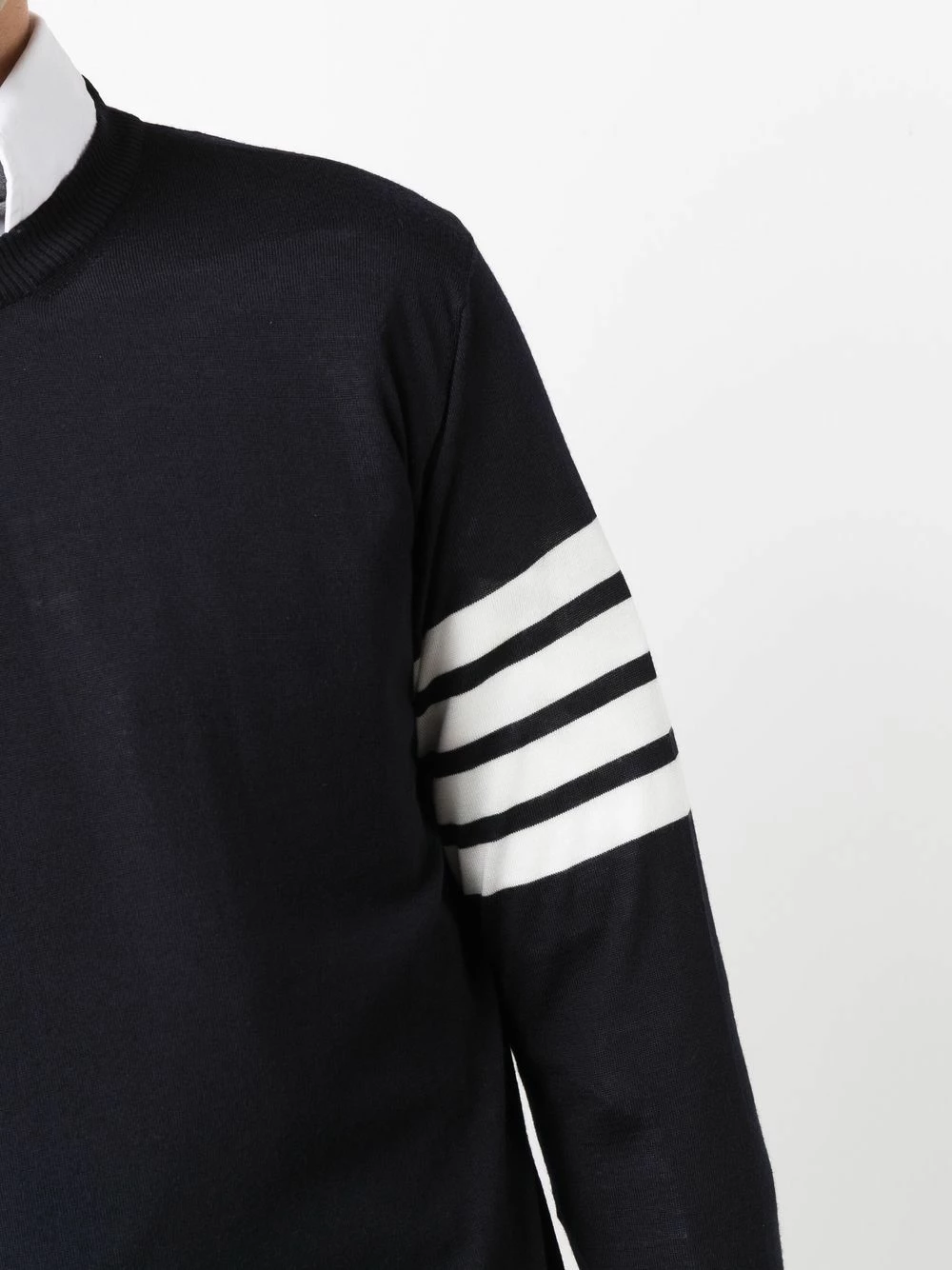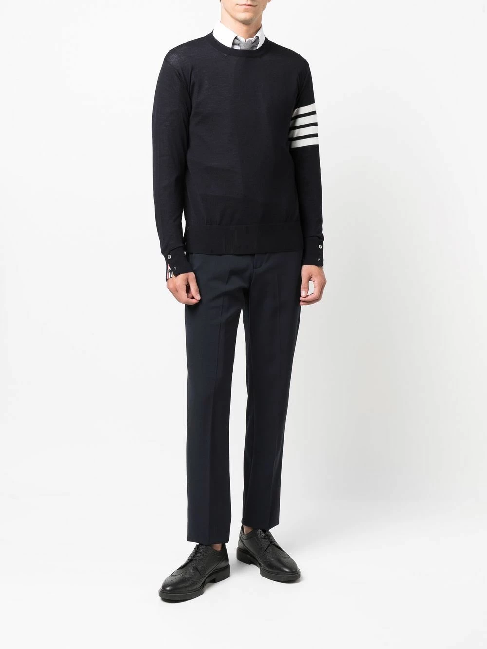 Spun from merino wool, this knitted jumper from Thom Browne is decorated with the signature 4-Bar stripes on a single sleeve. The round-neck and long-sleeve design is fitted with buttons on the sides of the hem and on the cuffs.