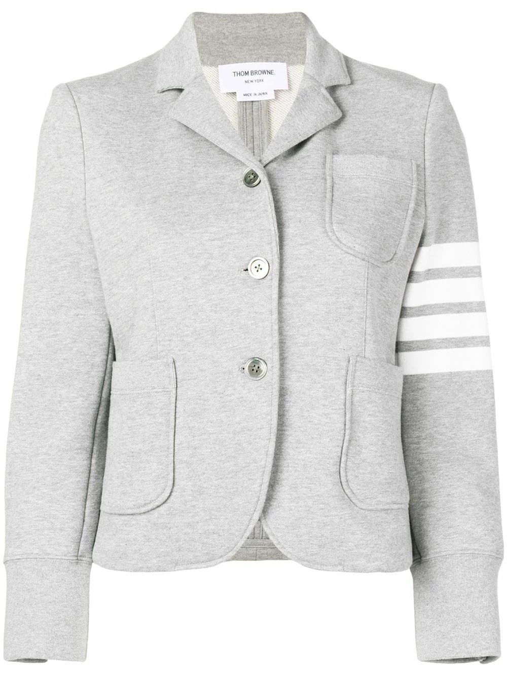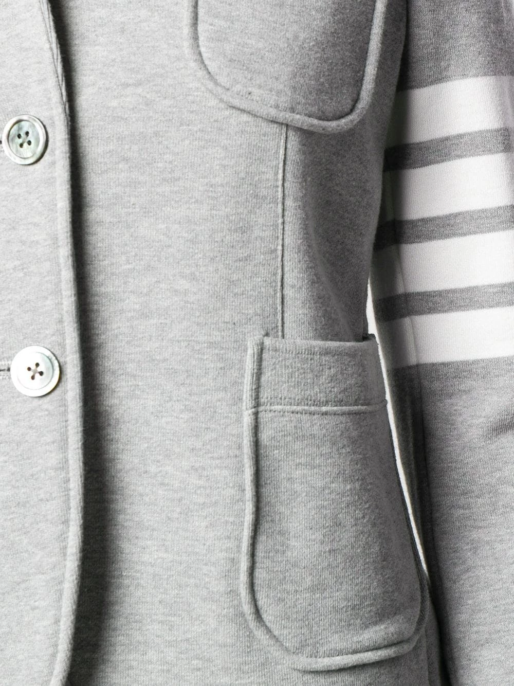 Attending a grand slam tennis tournament soon? Cover yourself in style with this grey cotton 4-Bar loop back sport coat from Thom Browne. Designed with a sporty fit to give you comfortable feeling all day. You’re already a winner in this ‘style’ game.