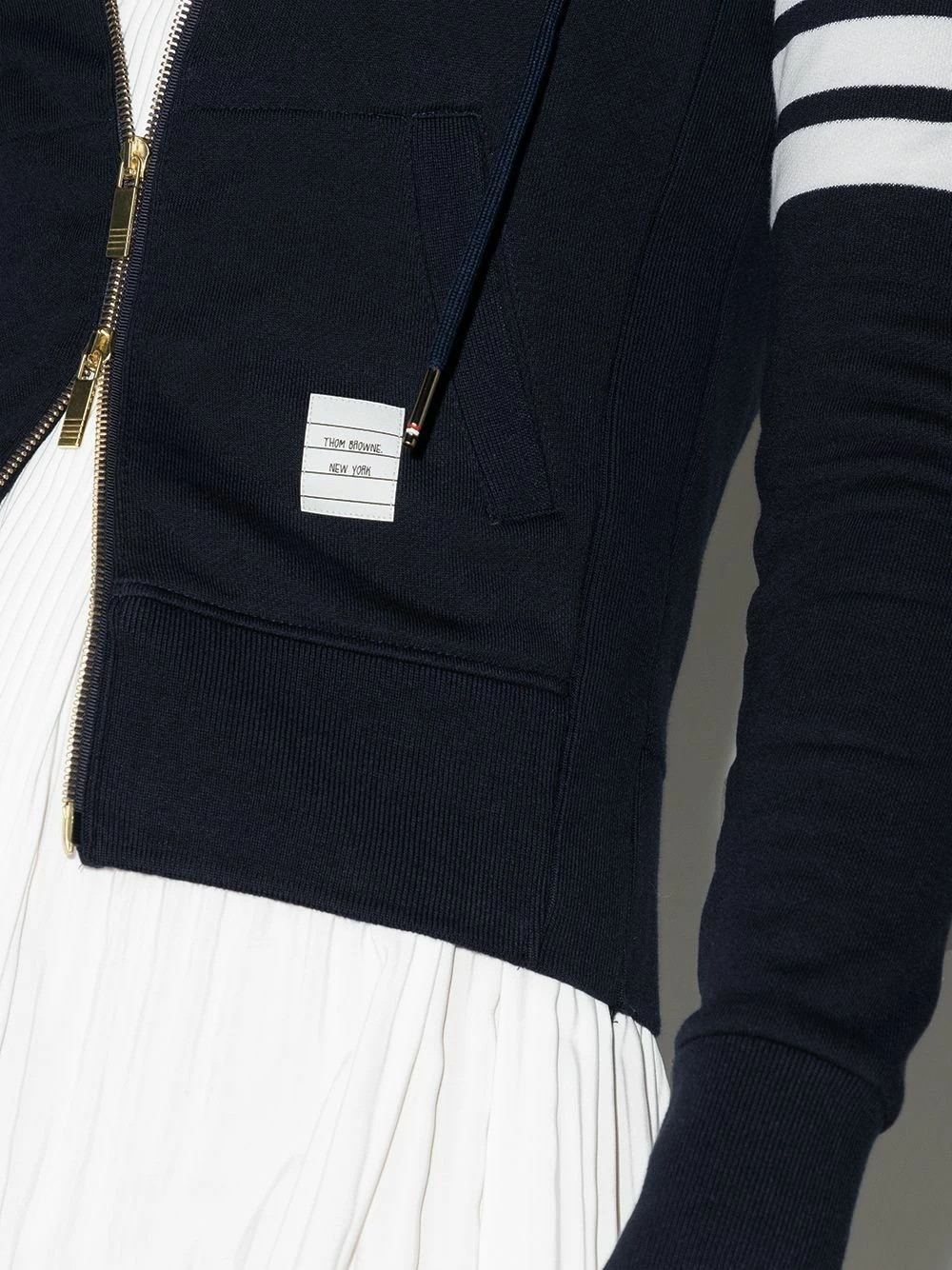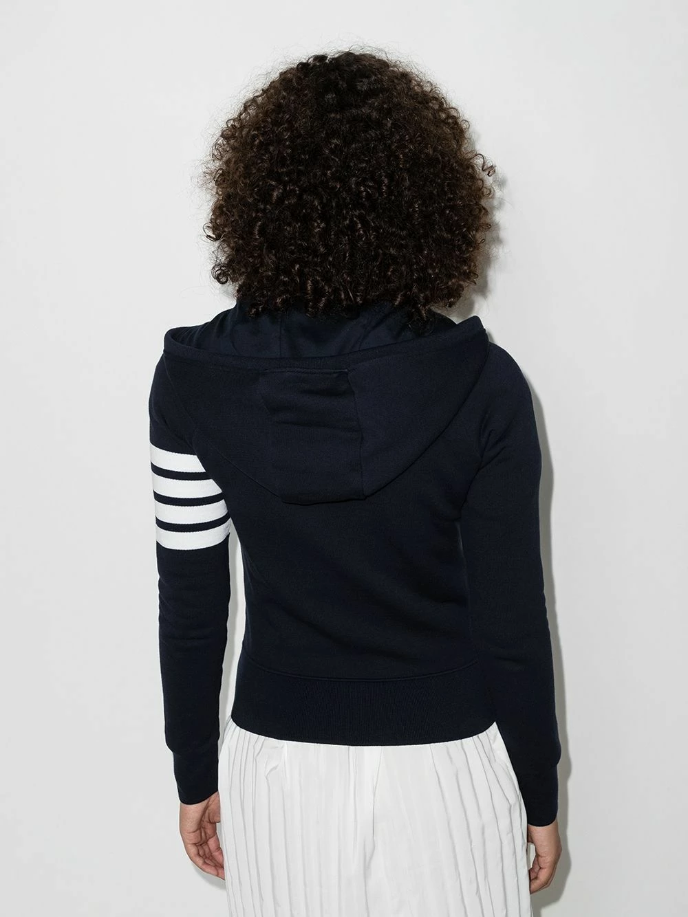 Embrace a sporty aesthetic in the sleekest way possible. This navy blue cotton engineered 4-Bar stripe zip-up hoodie from Thom Browne is your answer to laid-back Sundays. Comfort never looked so good. Featuring a drawstring hood, a front zip fastening, long sleeves, two front pockets, a front logo patch, a ribbed hem and cuffs and 4-Bar stripes to the sleeve.