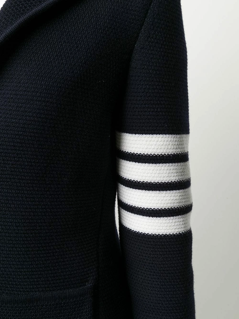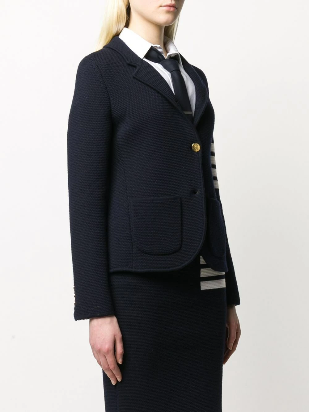 Get ready to elevate your style with this navy fine merino wool links stitch 4-Bar jacket from Thom Browne. Simple, but super classy! Undoubtedly, an essential piece. Featuring a classic check print, a button fastening, a chest pocket, two front pockets, long sleeves, a stripe detail to the side and a double vent to the rear.