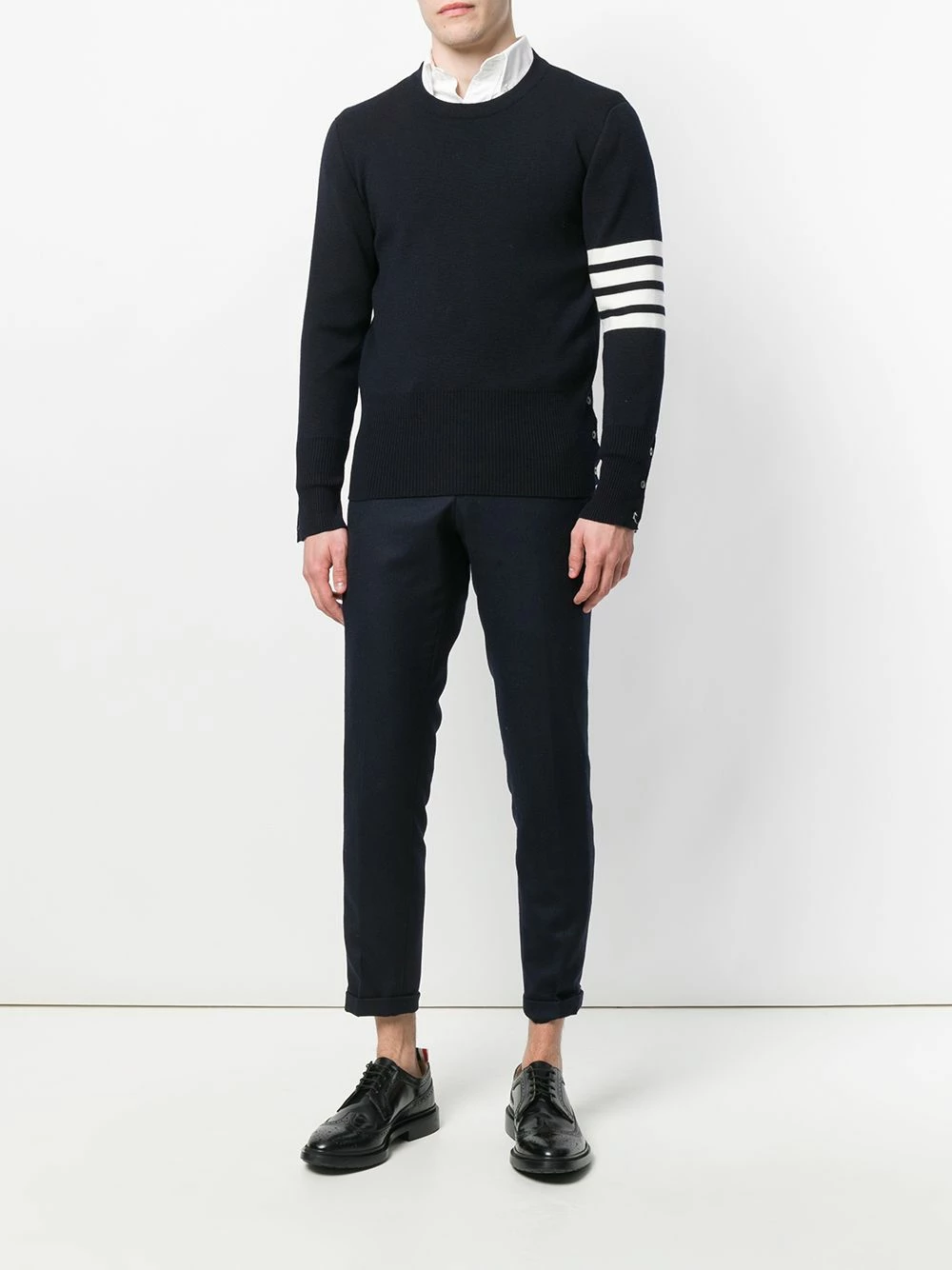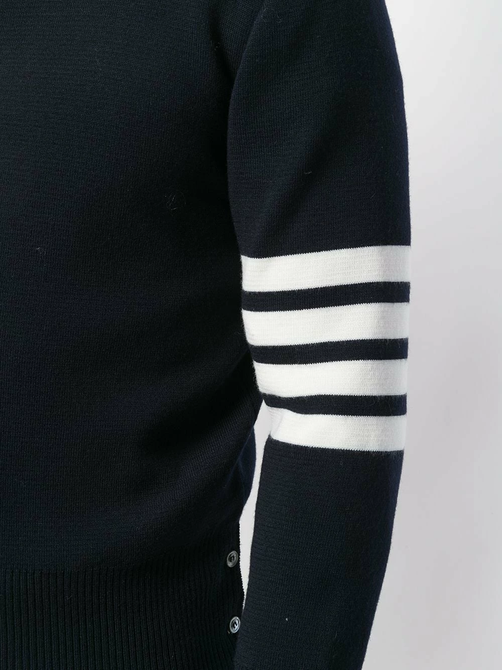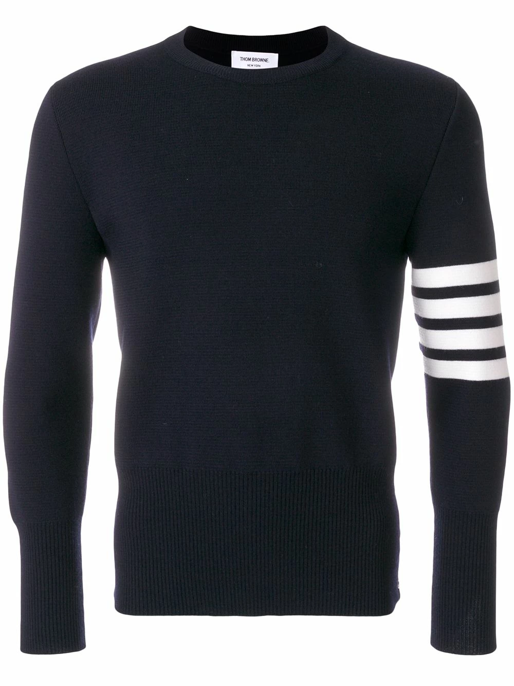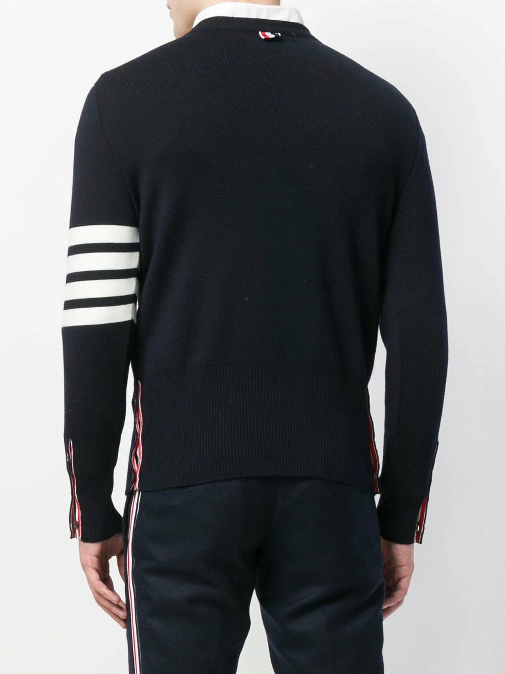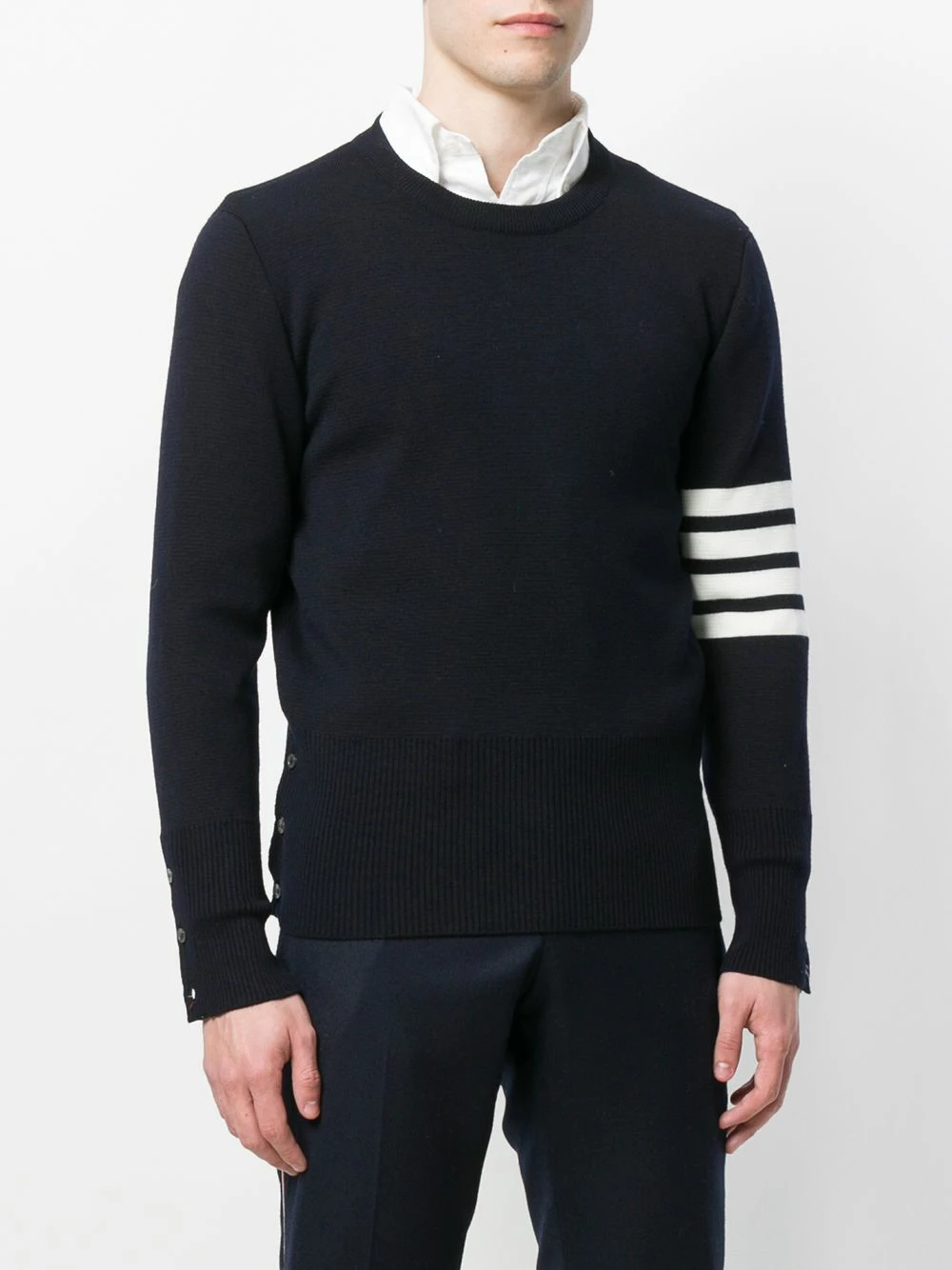 Navy blue and white wool 4-Bar Milano Stitch Pullover from Thom Browne featuring a ribbed crew neck, a slim fit, a ribbed hem and cuffs, side slits, a signature tri-colour striped trim and signature quadruple white stripes at the sleeve.