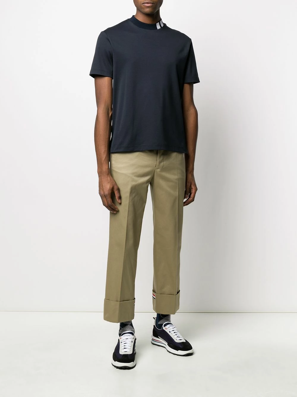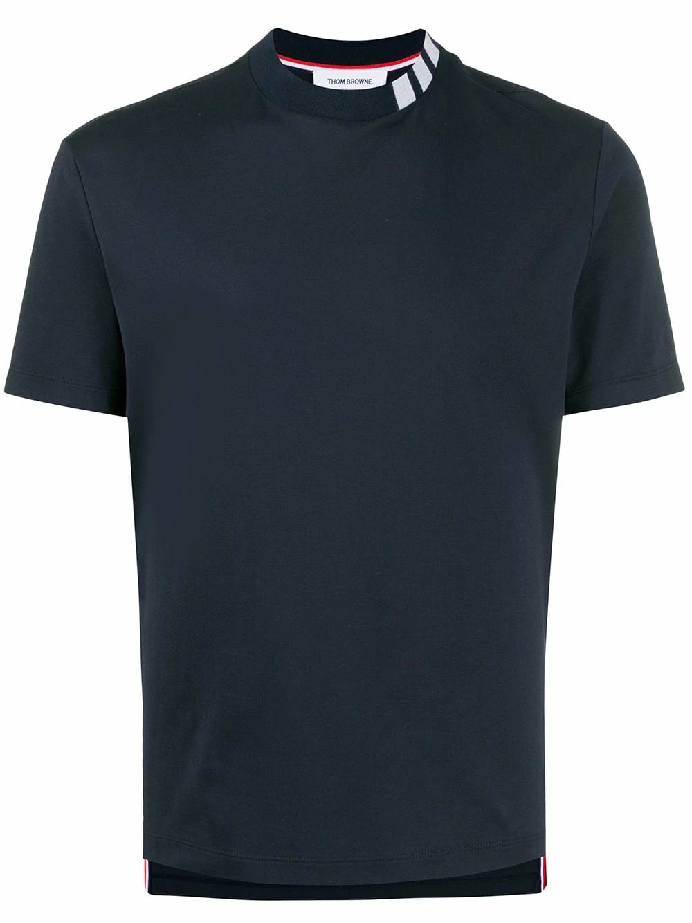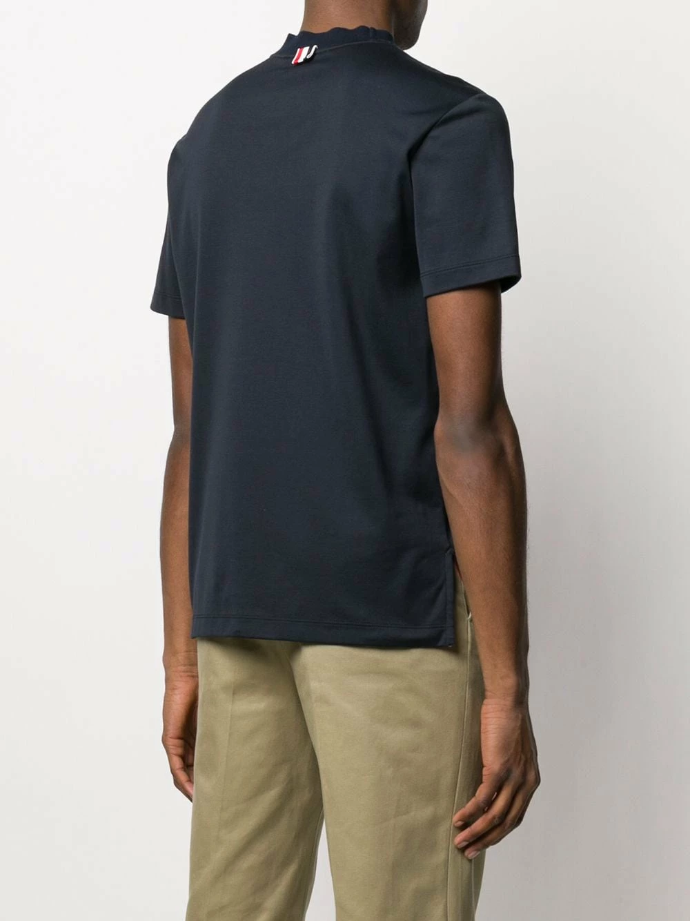 A simple navy tee. Or is it? Crafted from cotton, this T-shirt from Thom Browne has a mock neck with 4-Bar detailing. A little unexpected. A lot cool. Featuring short sleeves, a straight fit and a mock neck.