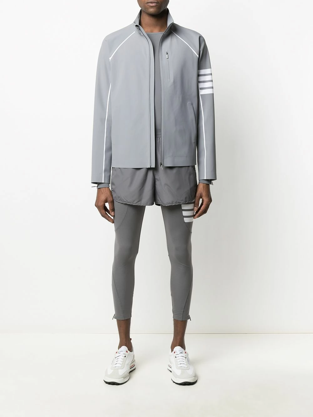 Let’s get physical. In a light grey hue with a 4-Bar motif to one side, this jacket from Thom Browne can take on everything and anything. Get sporty.