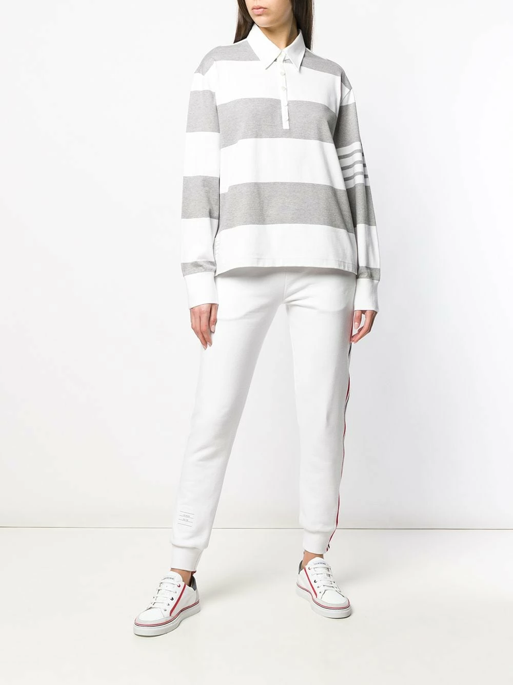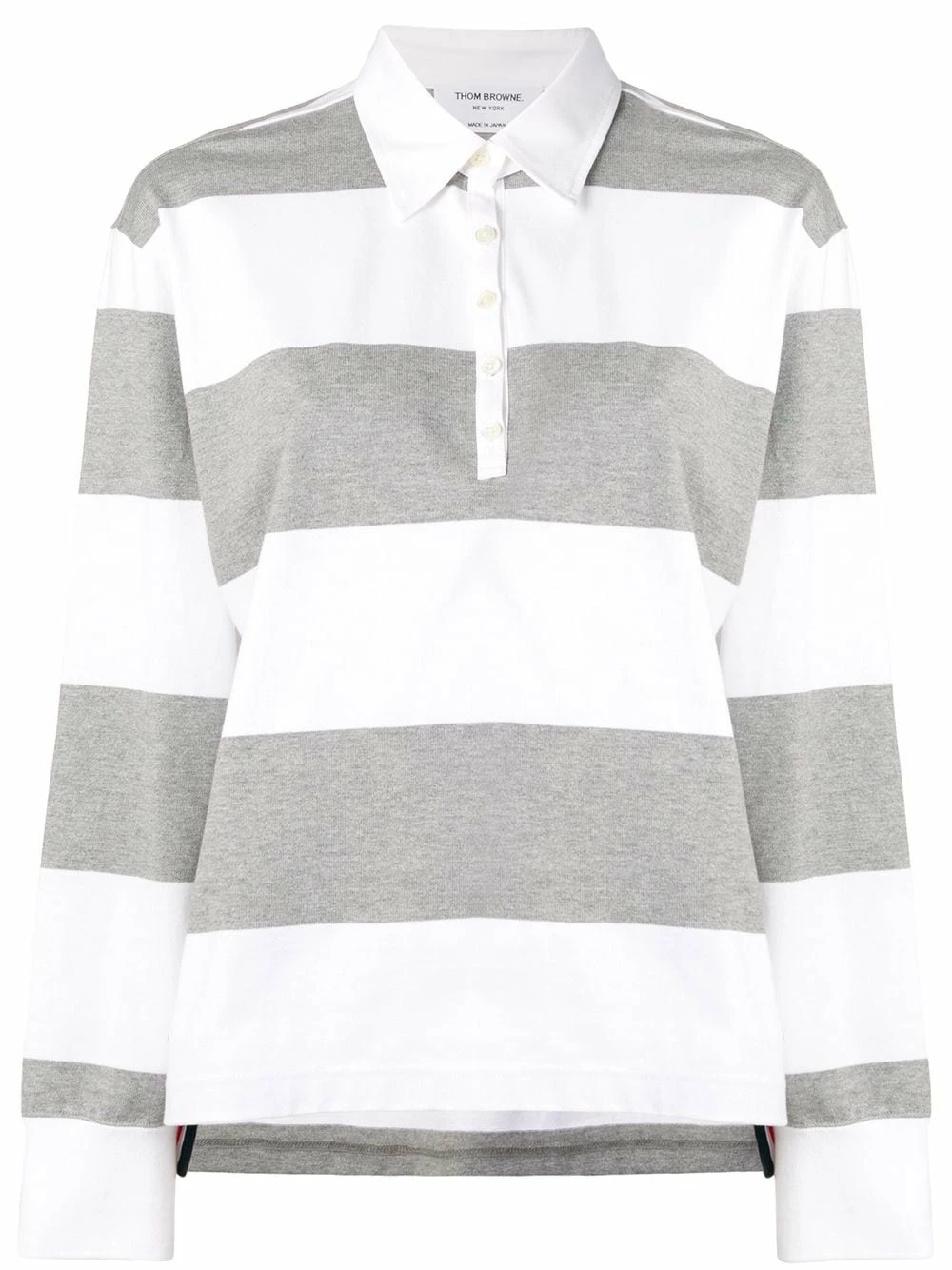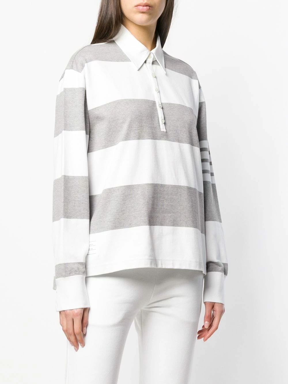 Launched in 2003, Thom Browne is internationally celebrated for its clean-cut silhouettes and couture-like sensibilities. This pastel grey and white cotton 4-Bar Rugby Stripe Oversized Polo from Thom Browne features a classic polo collar, a front button placket, long sleeves, button cuffs, a straight hem and a tricolour grosgrain tab on the rear.