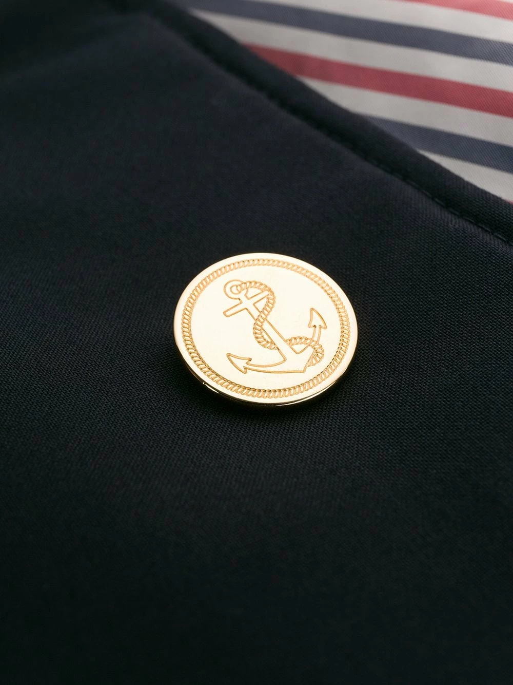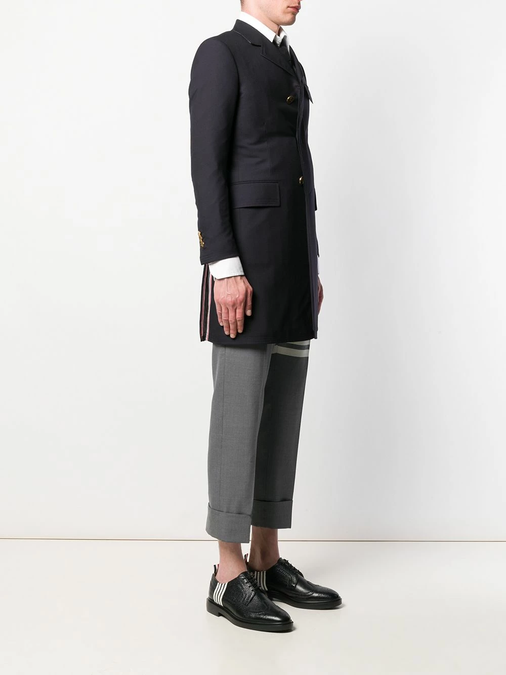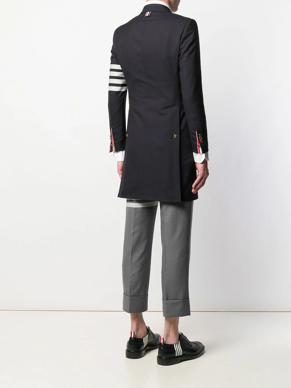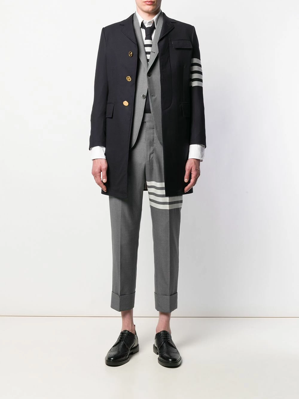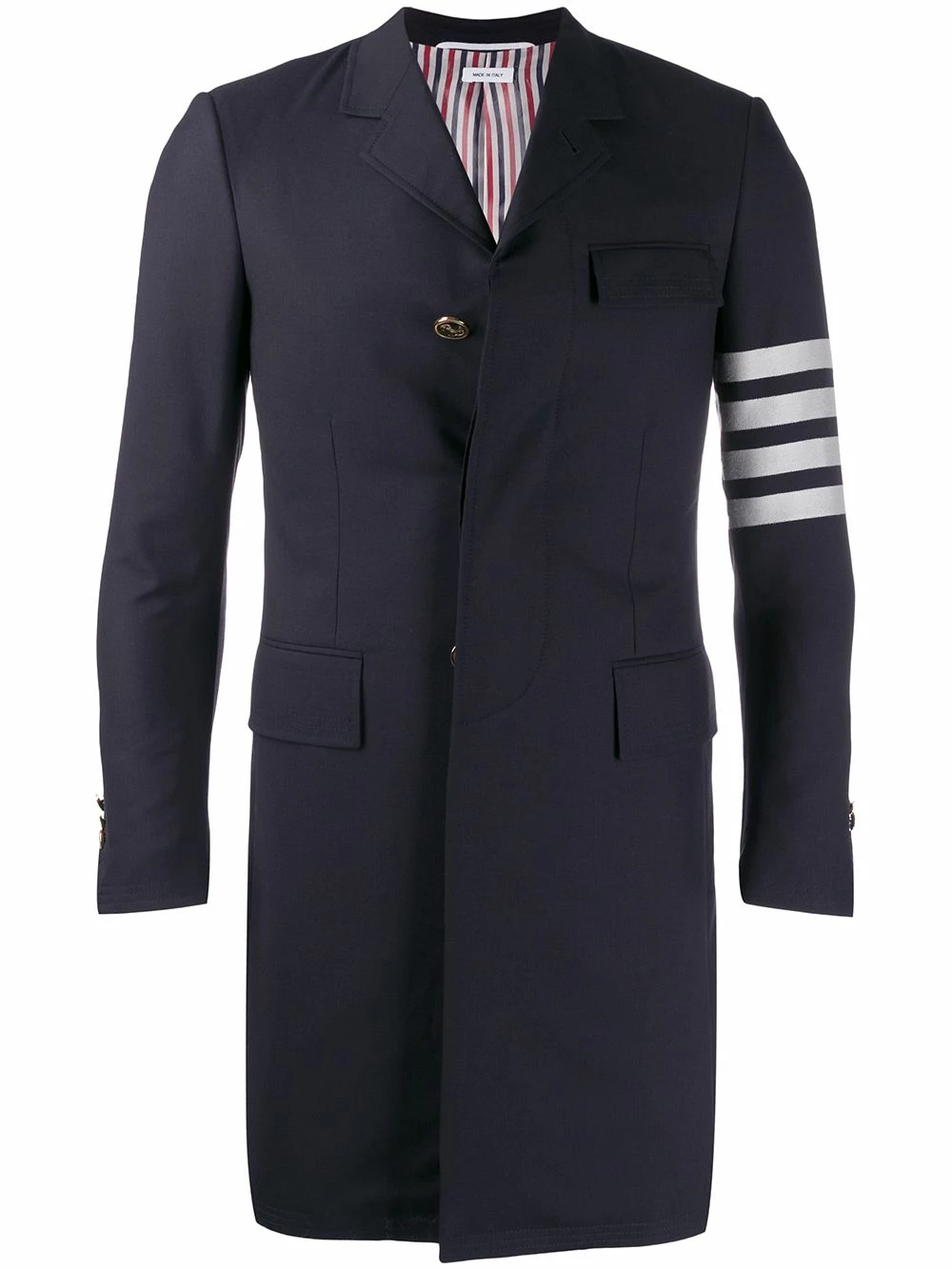 Thom Browne produces new takes on men’s fashion with creative prints and cuts. This navy blue wool 4-Bar plain weave suiting overcoat from Thom Browne features classic lapels, a front button fastening, long sleeves, a signature stripe detail to the side, side pockets and a mid-length.