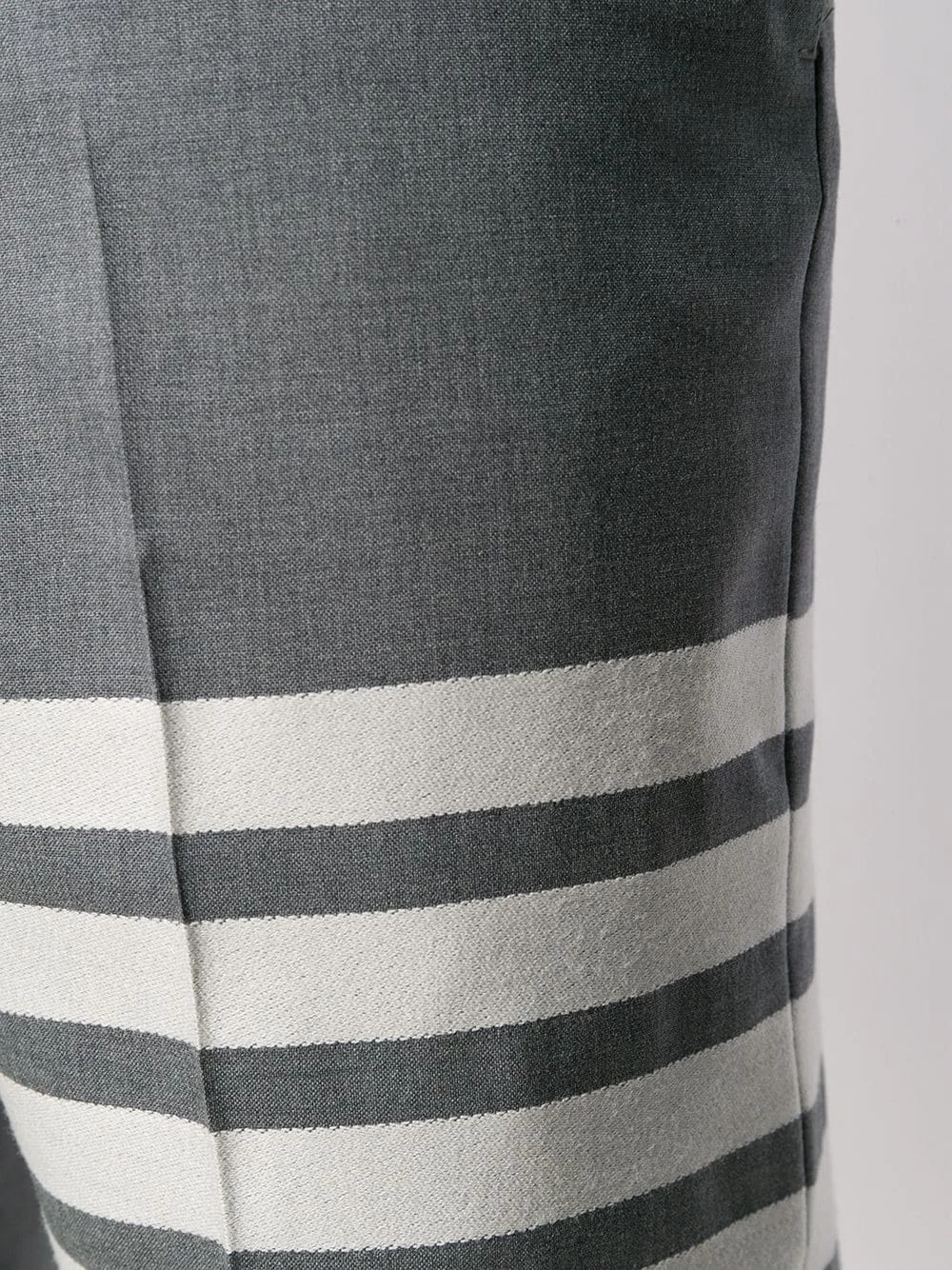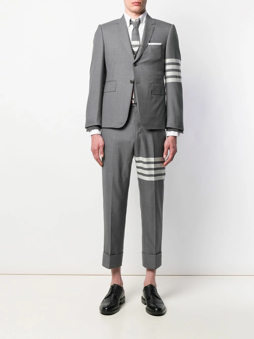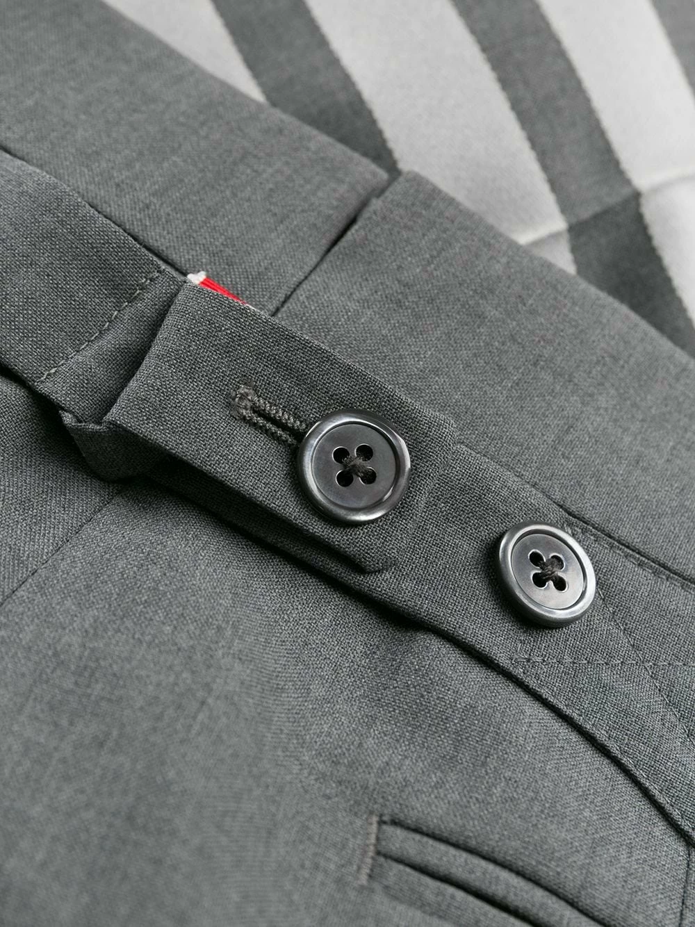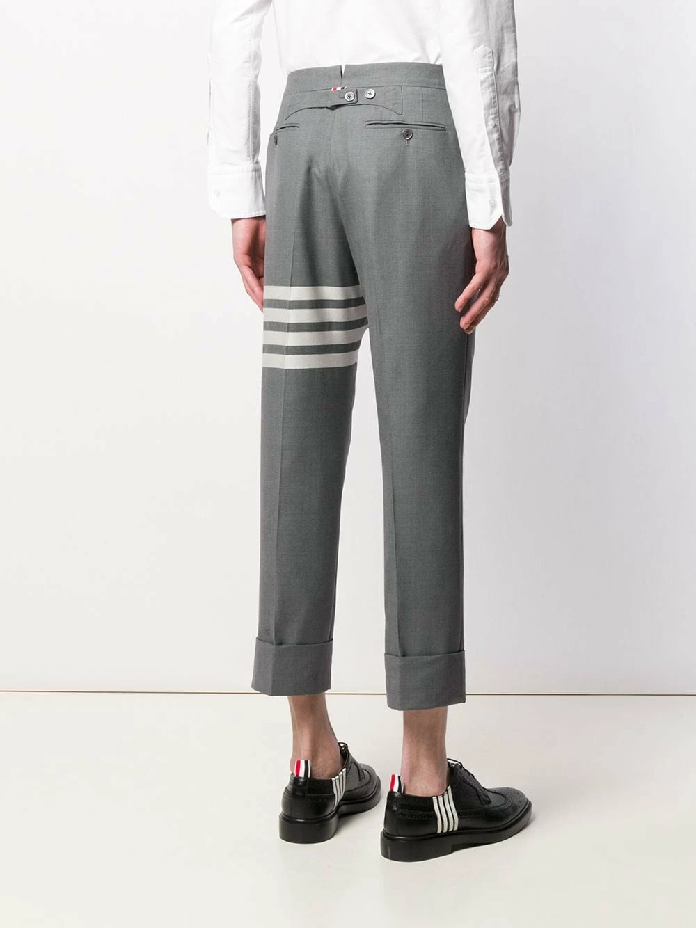 Thom Browne produces new takes on men’s fashion with creative prints and cuts. These medium grey wool plain weave suiting 4-bar trousers from Thom Browne feature an off-centre front button fastening, side pockets, back pockets, a stripe detail to the side, a cropped length and a slim fit.