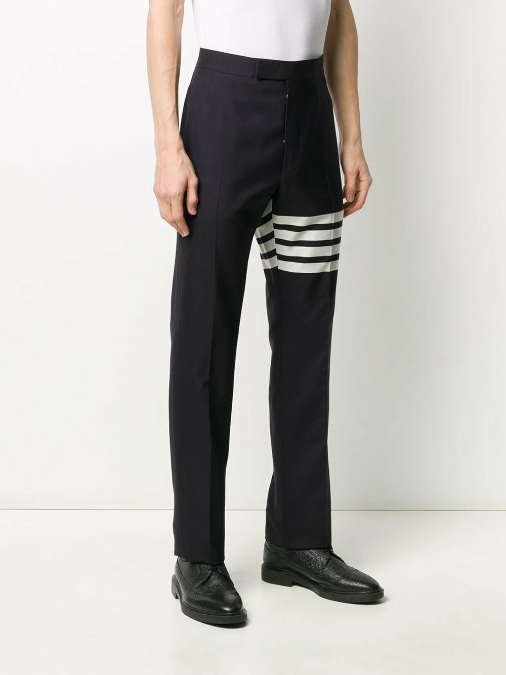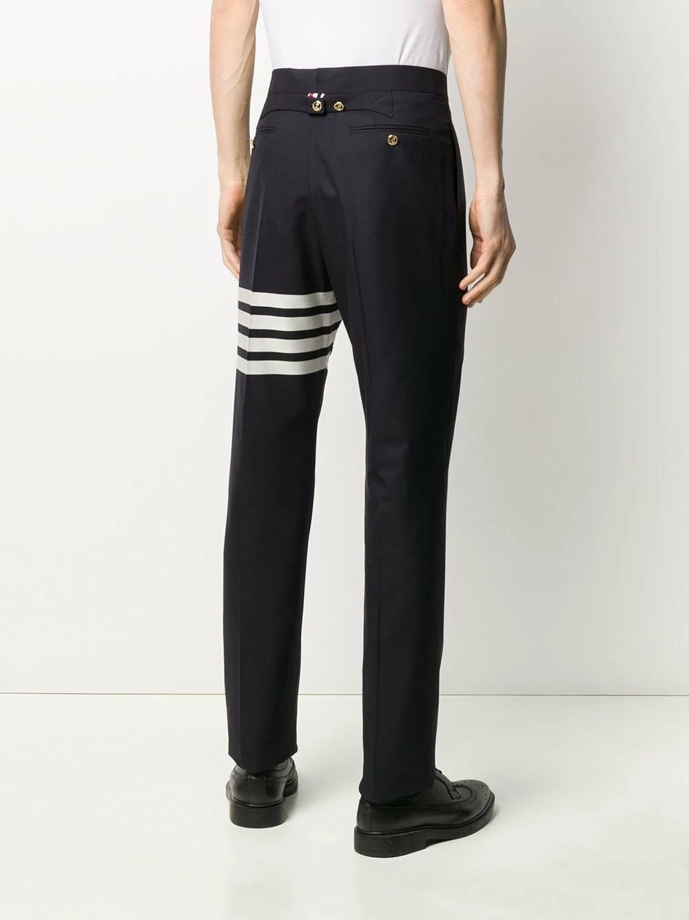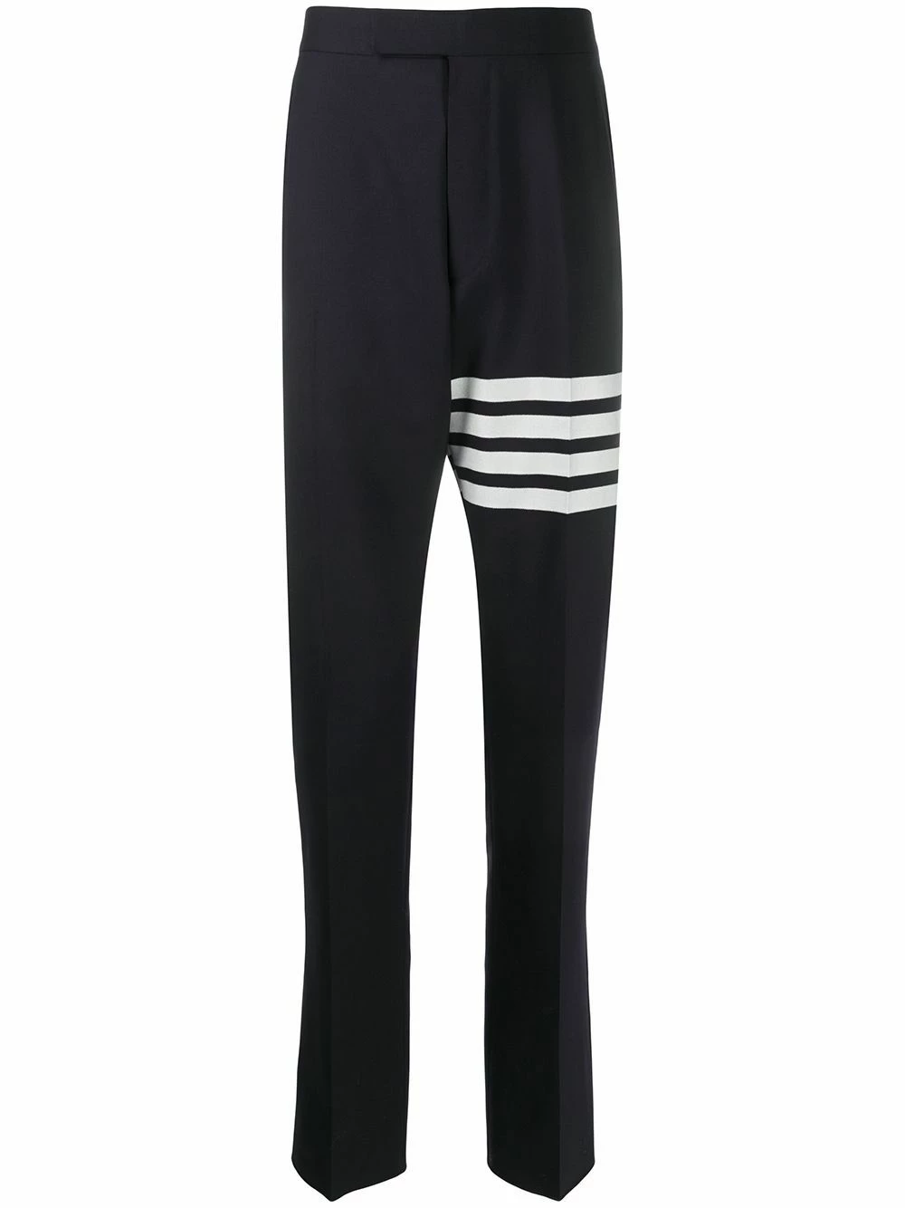 Time is too valuable for you to waste it stressing about what to wear to the office tomorrow. Thom Browne makes the decision quick and easy with these navy plain weave suiting 4-bar trousers. One less thing to worry about. Featuring a concealed front fastening, side pockets, rear welt pockets and a signature four-bar detail.