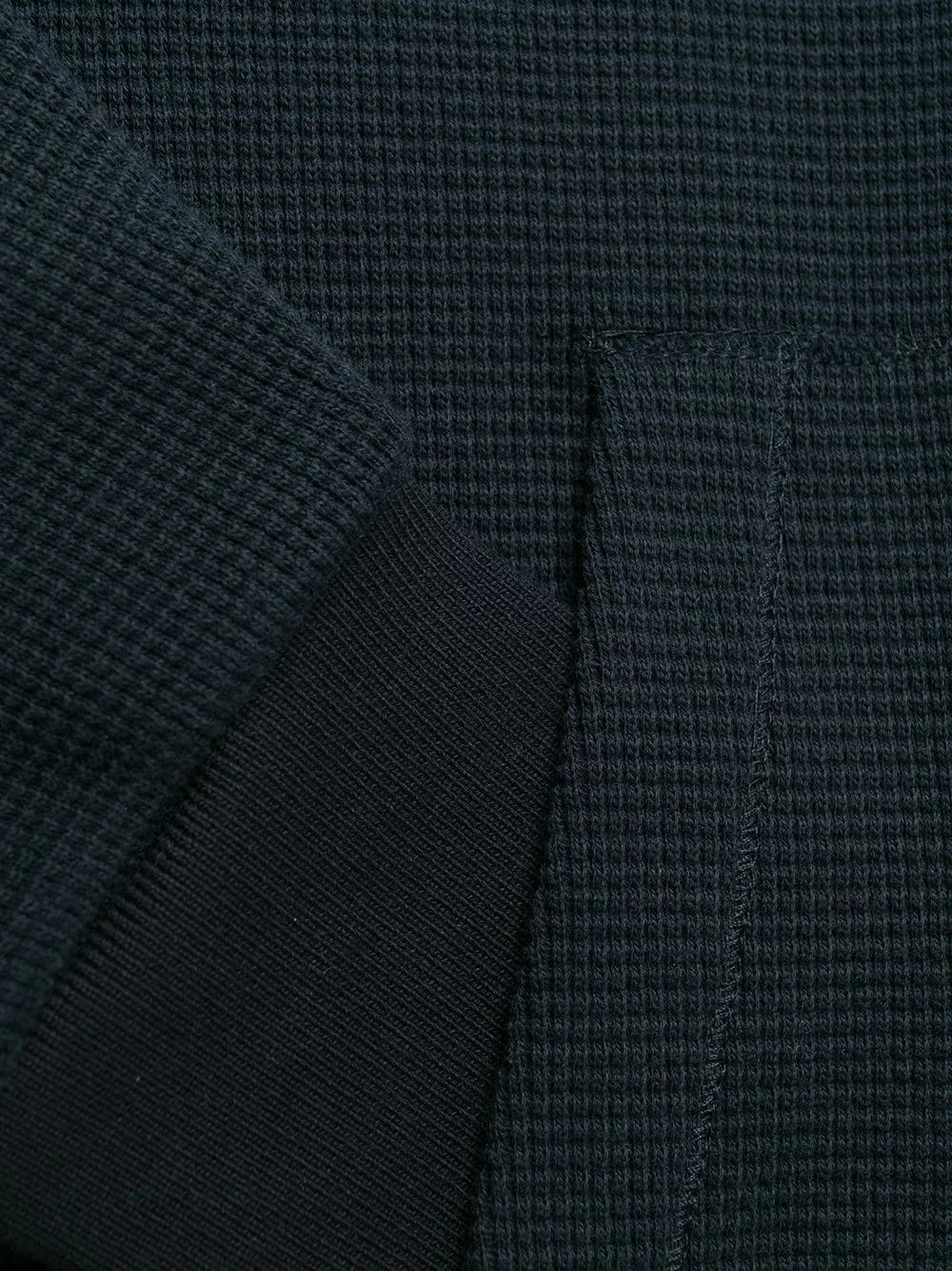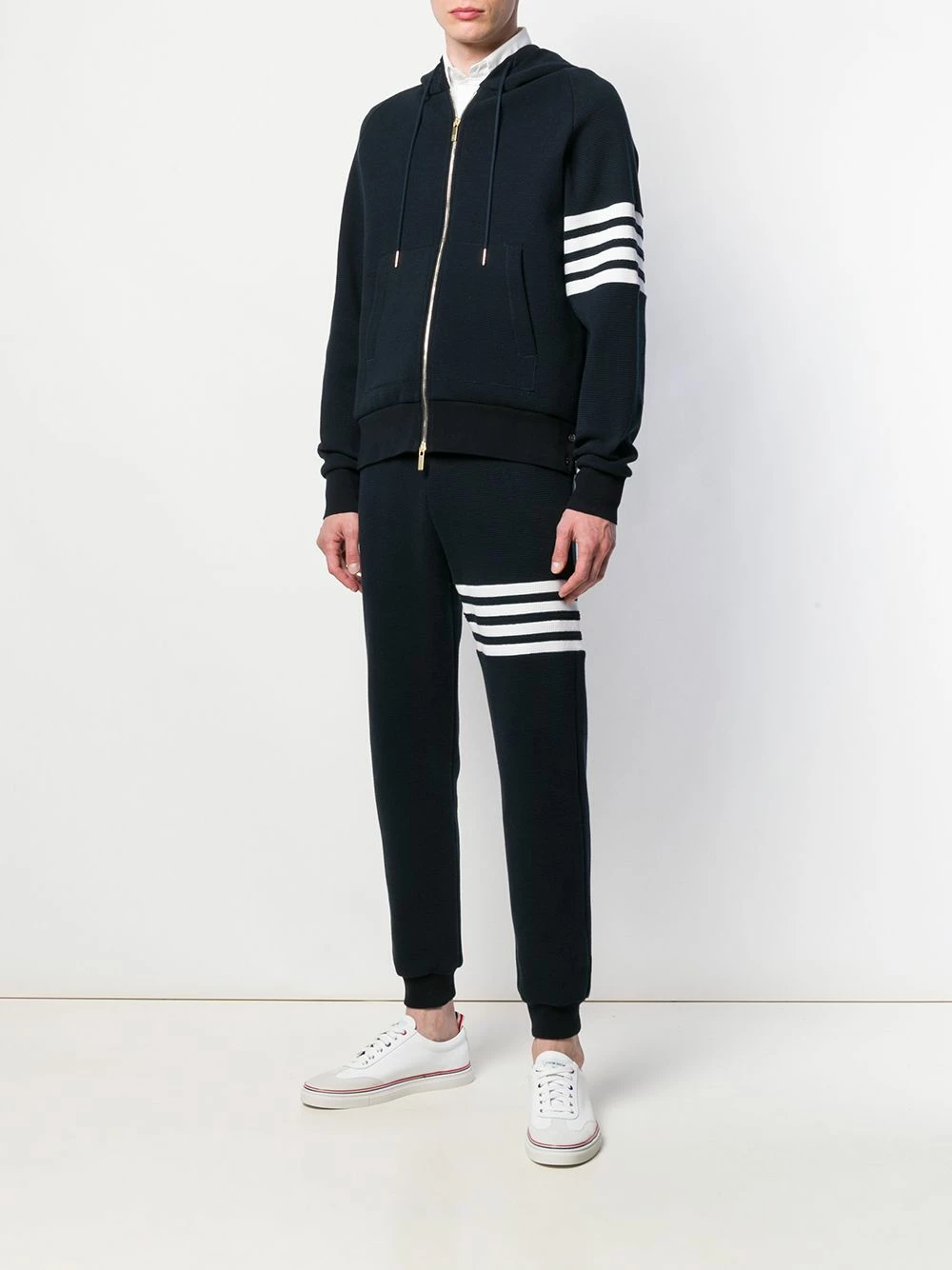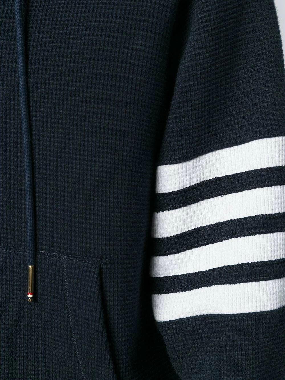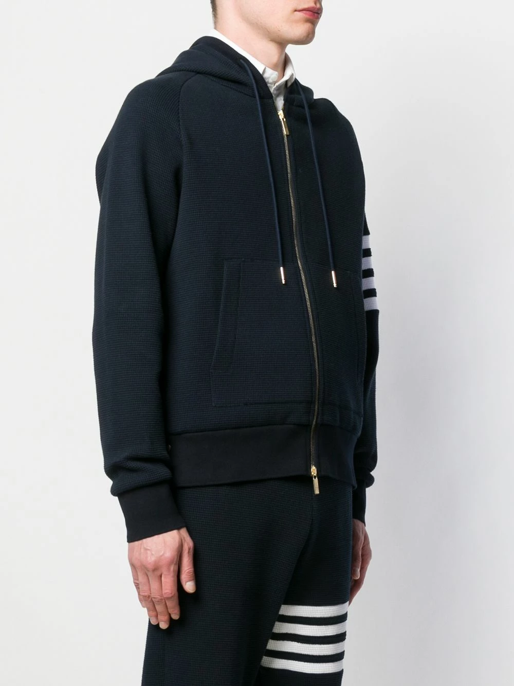 A lineup of investment pieces designed to withstand the test of time, this Thom Browne’s collection continues to blur the lines between refined tailoring and contemporary sportswear as seen in this 4-Bar raglan-sleeve waffle stitch hoodie. Featuring a hood with drawstring tie fastenings, a front zip fastening, long sleeves, a ribbed hem and cuffs, kangaroo pockets and a 4-bar detail to the sleeve.