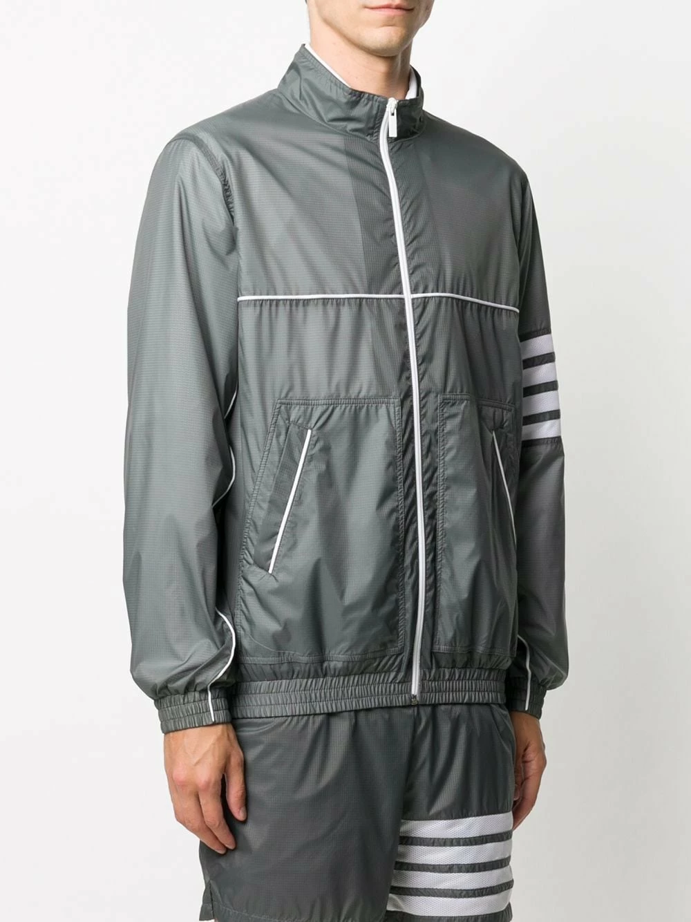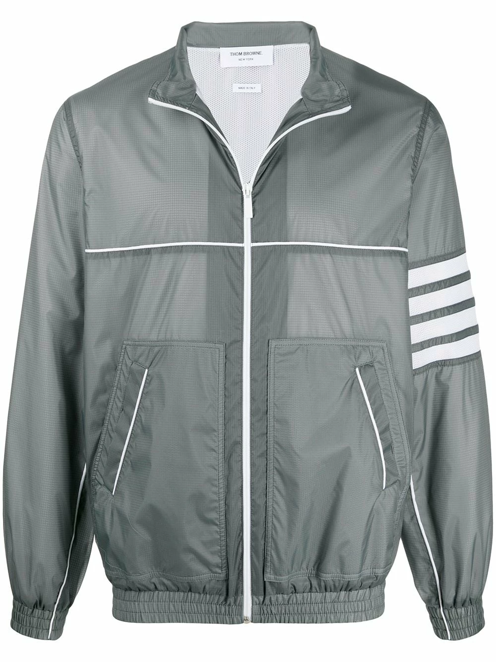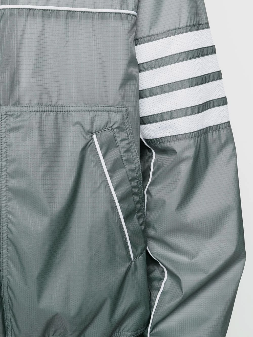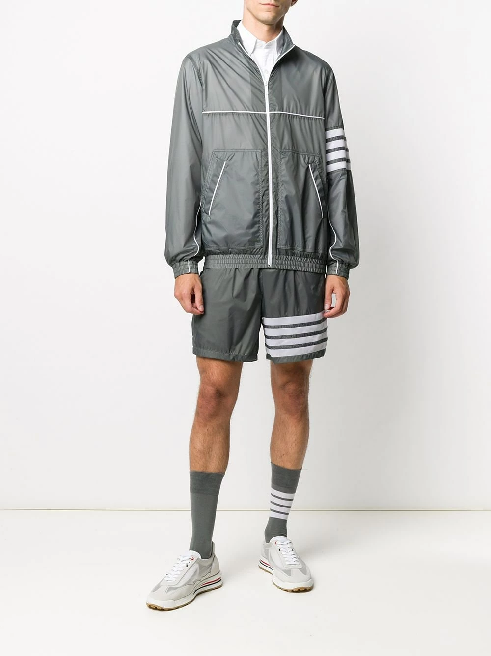 Thom Browne does casual too. Wear this grey 4-Bar ripstop zip-up jacket en-route to the gym or on lazy weekends. Either way, you’ll want to show it off.