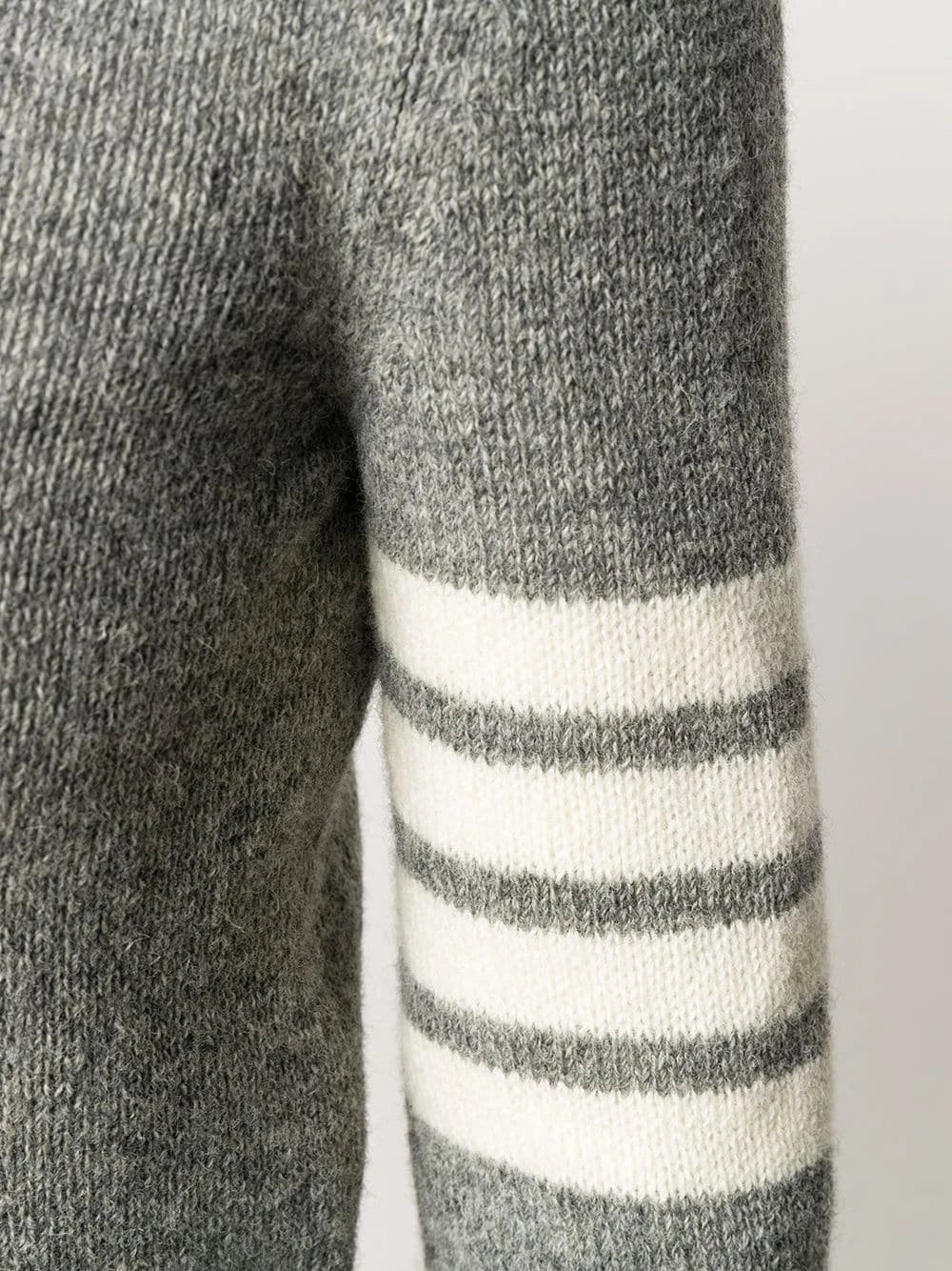 Updating your basics with the sharpest craftsmanship in the fashion world became as easy as it should be with this Thom Browne light grey 4-Bar Shetland wool jumper. Featuring a fitted silhouette, ribbed details, a signature tri-colour striped trim, a crew neck, long sleeves, button cuffs, a four-bar stripe details on the upper arm and side button fastenings.