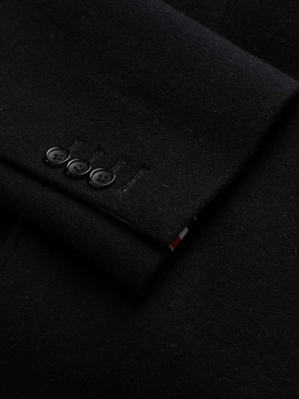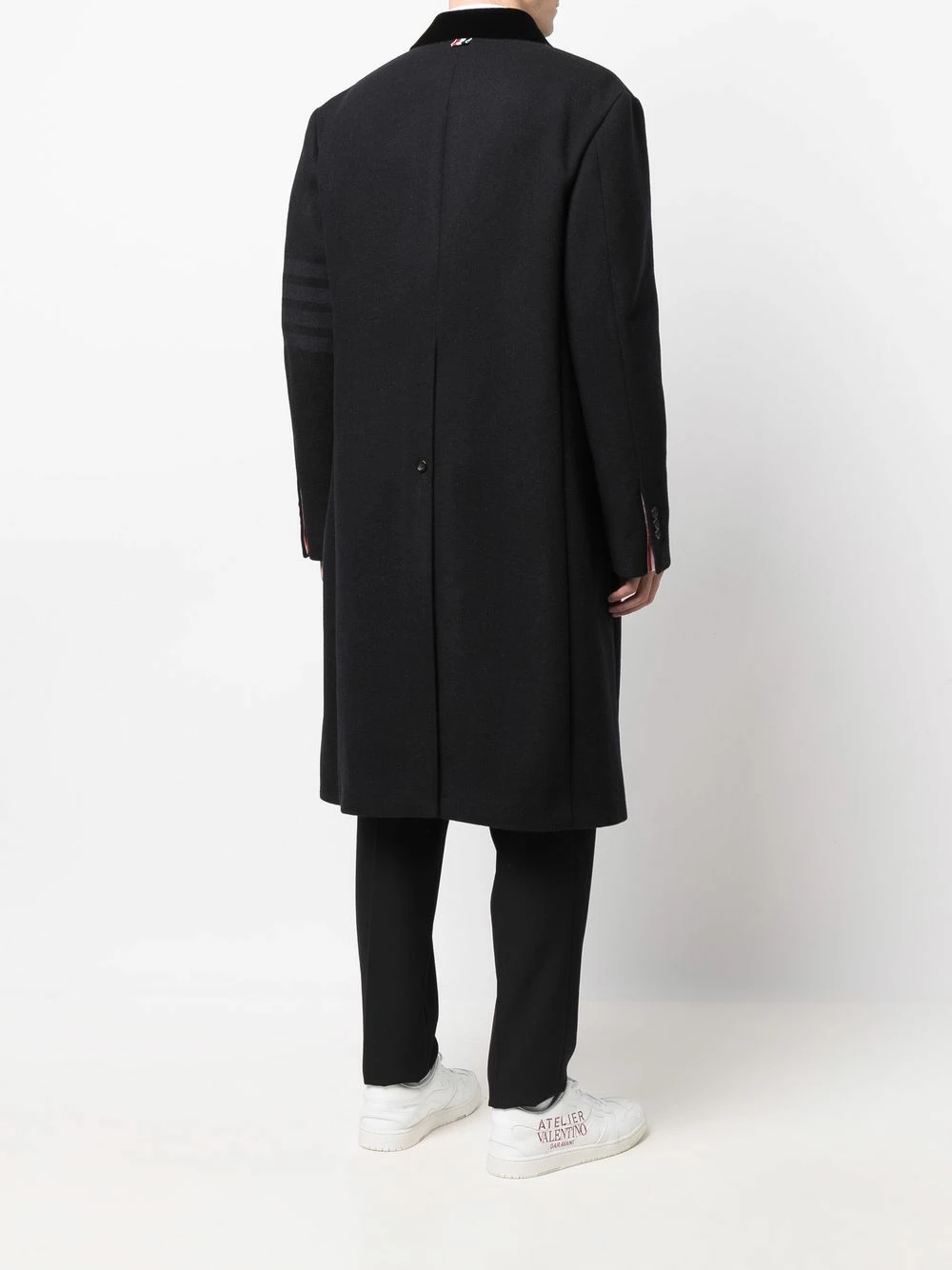 A classic with a Thom Browne twist. Crafted from cotton and wool-blend, this black single-breasted coat is detailed with a grosgrain loop tab at the rear and a 4-Bar stripe at the sleeve.