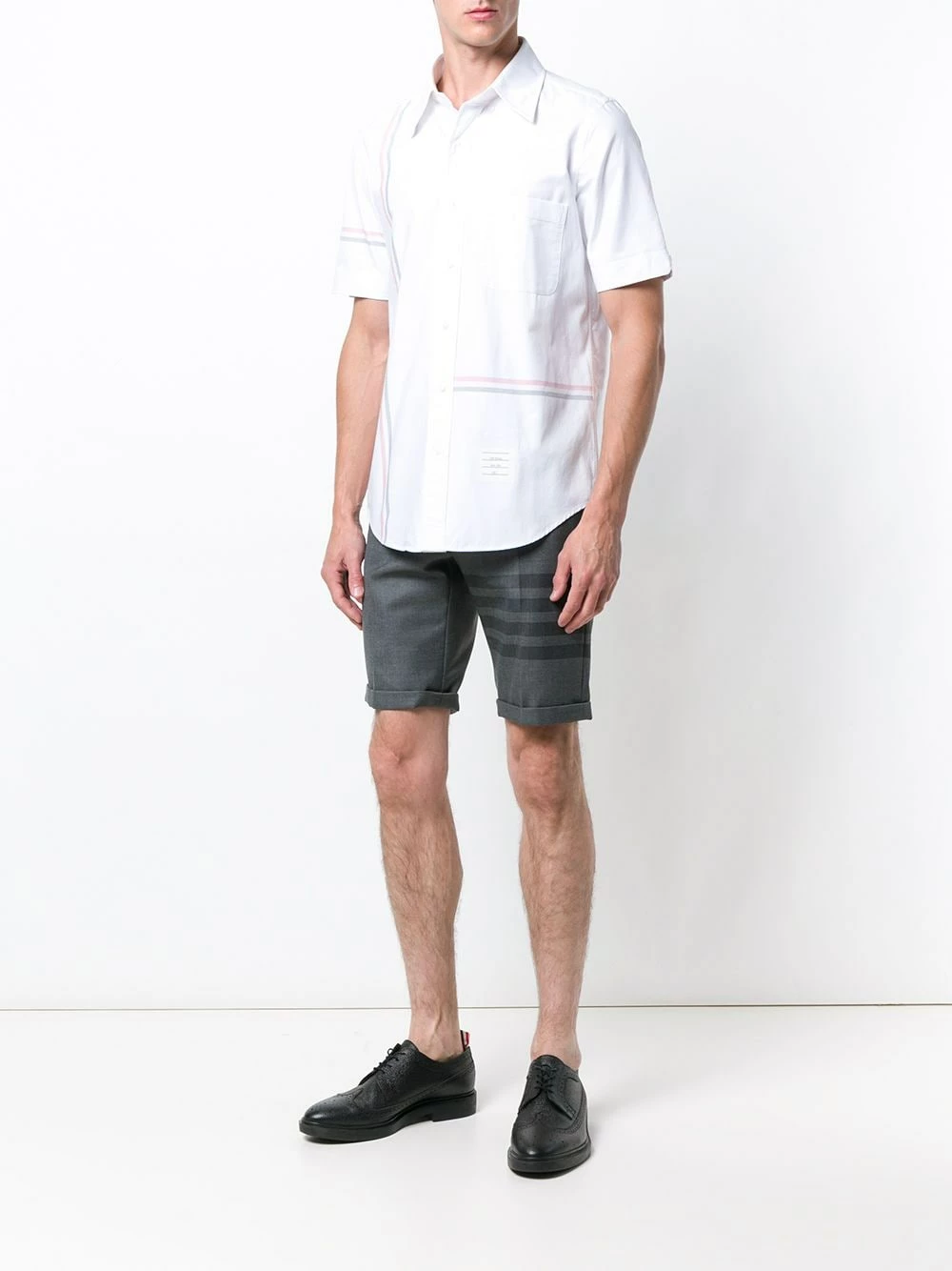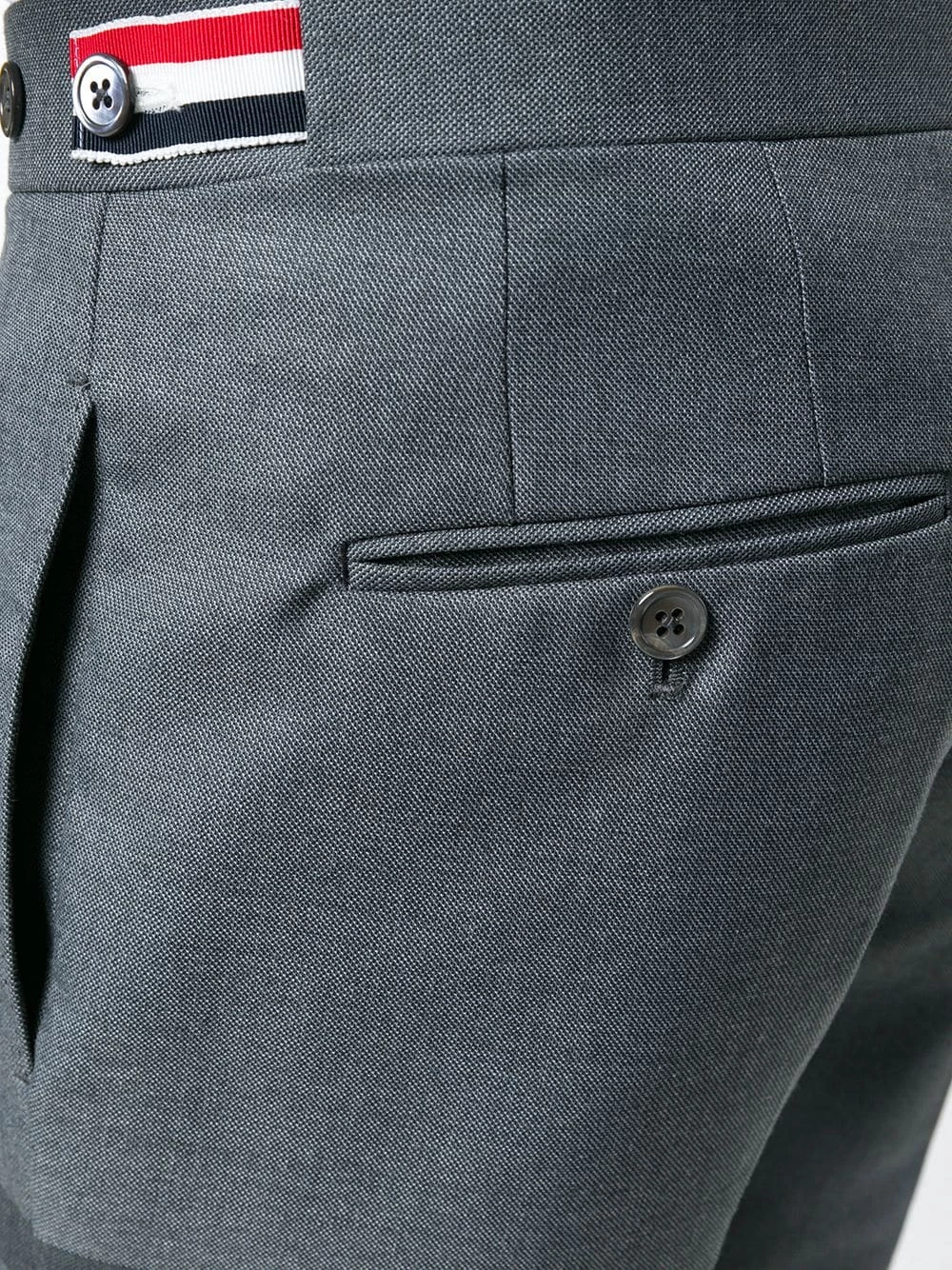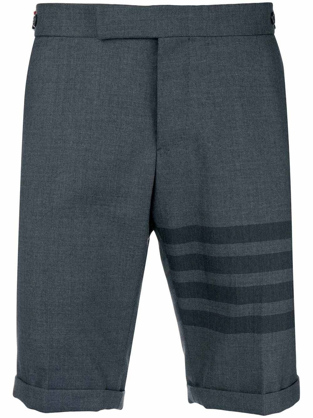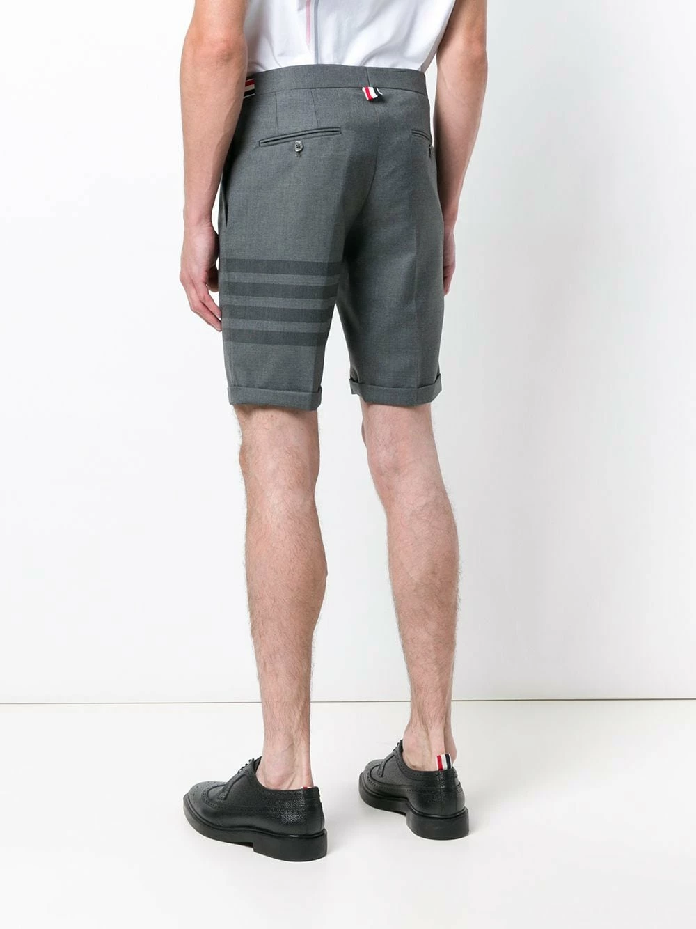Grey wool-blend 4-Bar Skinny-Fit Short from Thom Browne featuring a low rise, a slim fit, a concealed front fastening, side waist tabs, a signature tri-colour striped trim, side pockets and two back buttoned welt pockets.