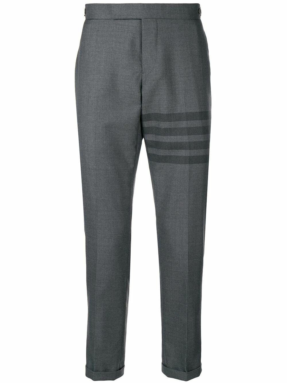 Grey wool-blend 4-Bar Skinny-Fit Trouser from Thom Browne featuring a low rise, a skinny fit, a hook and zip fastening, turn up cuffs, side pockets, two back buttoned welt pockets, creases, a signature tri-colour striped trim and four-bar stripes at the left thigh.