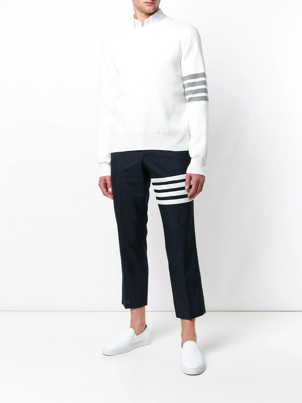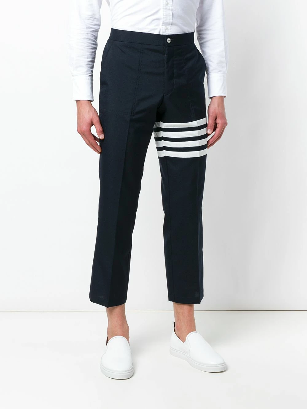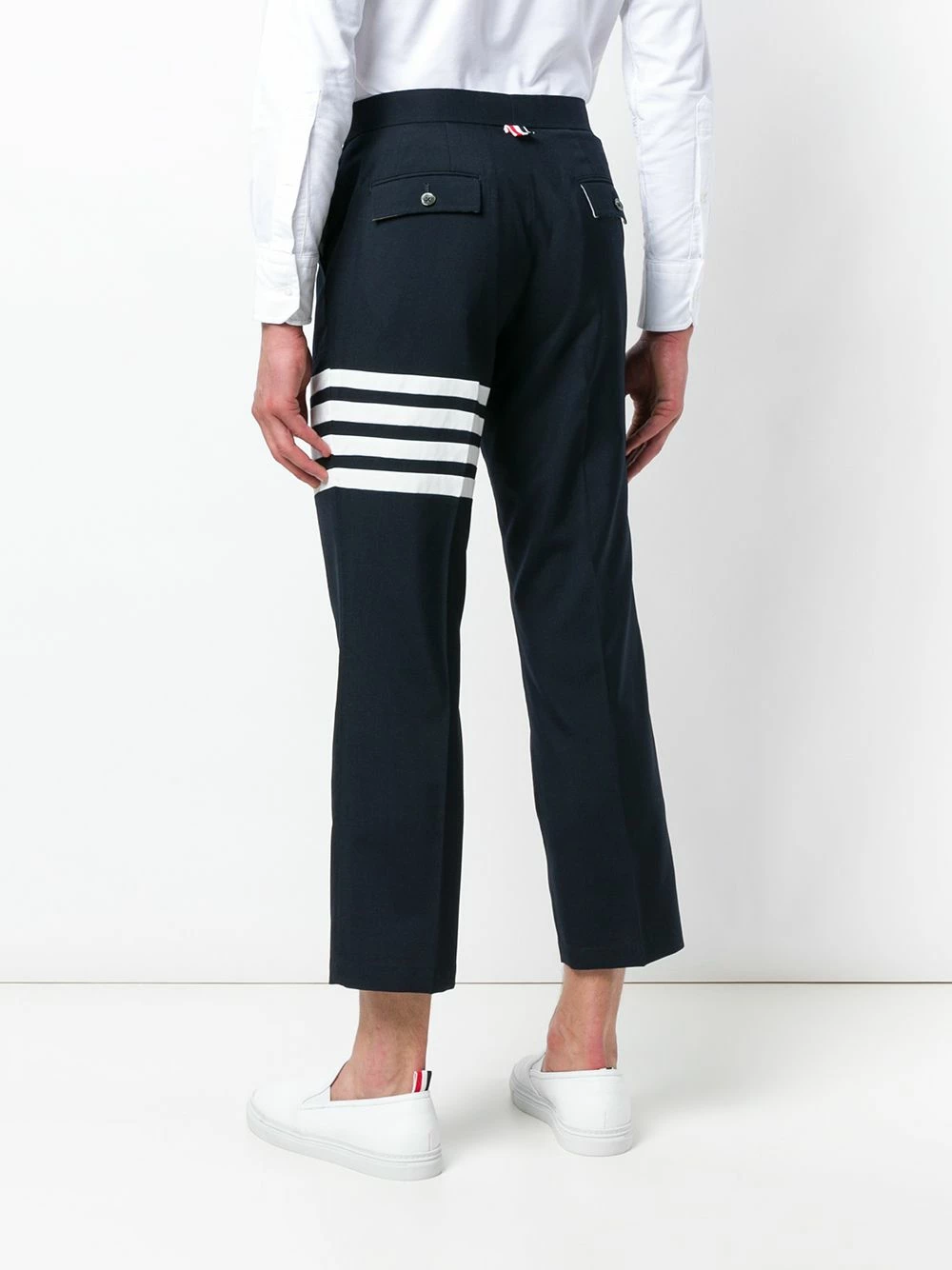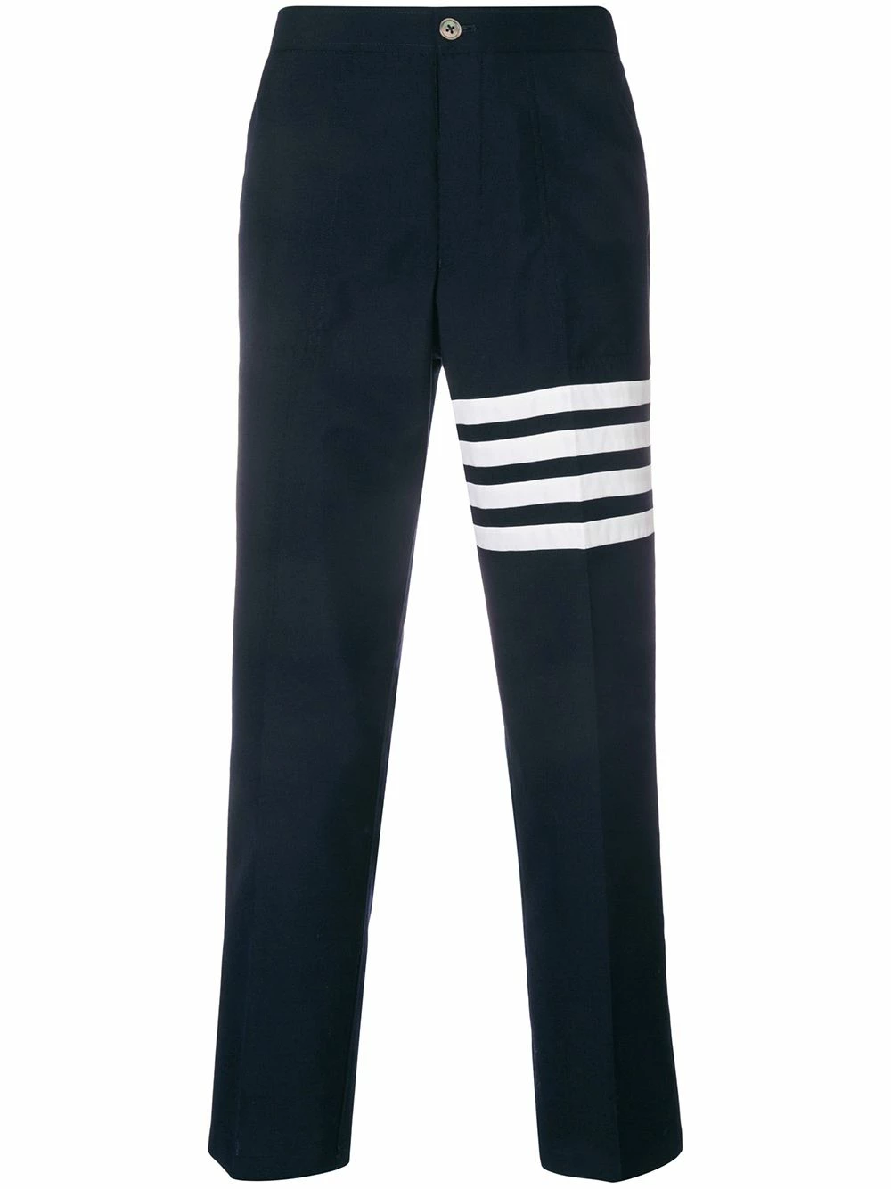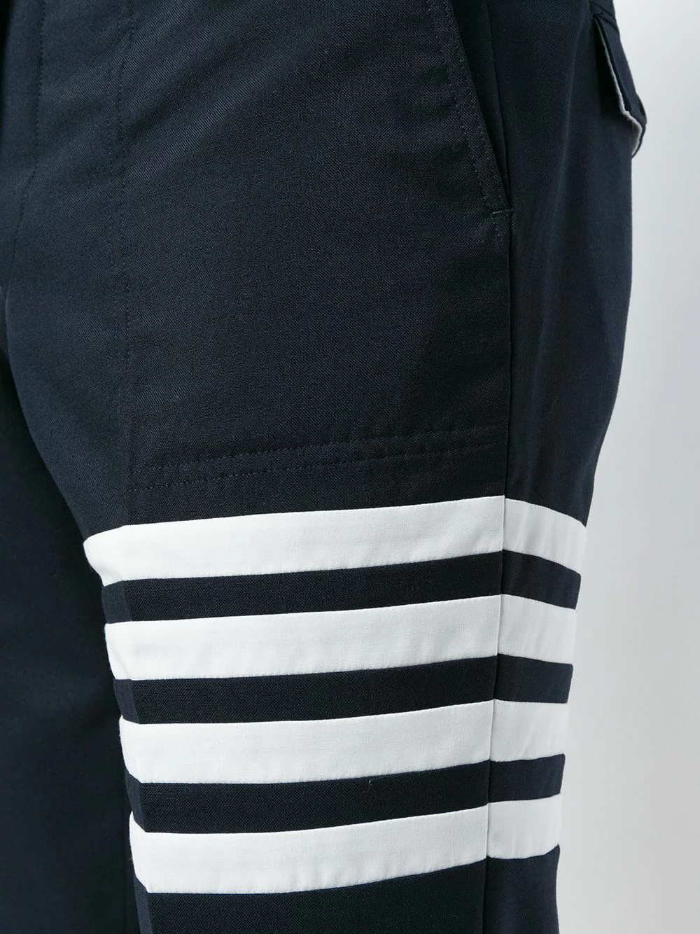 Navy blue wool-blend 4-Bar Slanted Pocket Chino from Thom Browne featuring a mid rise, a button and zip fly, a straight leg, cropped, creases, side pockets, two back buttoned welt pockets, a signature tri-colour striped trim and signature quadruple white stripes.
