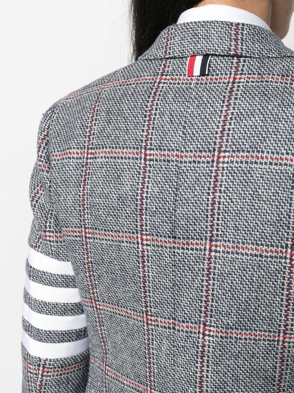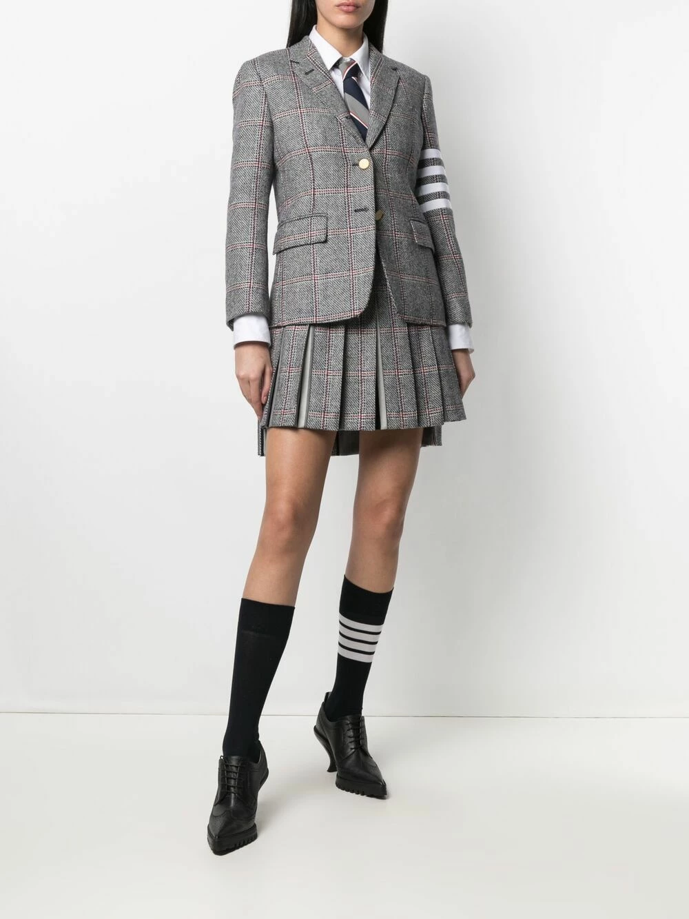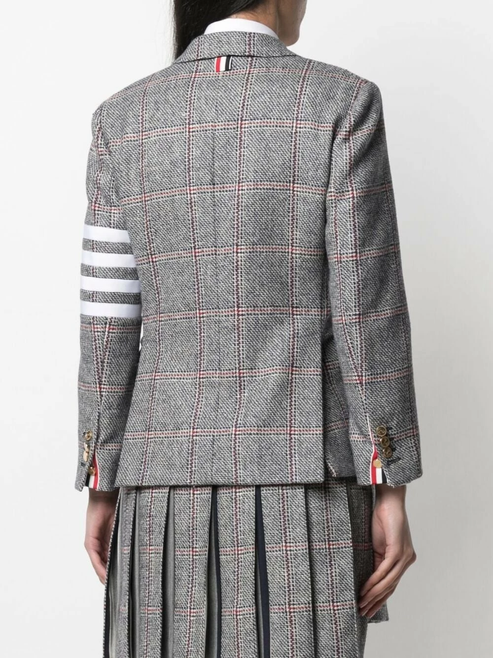 Thinking about tailoring your wardrobe in a smarter direction? Get suited and booted in Thom Browne’s 4-bar sports blazer jacket that serves suave charm with a tweed fabric and check pattern. Suits you very well.