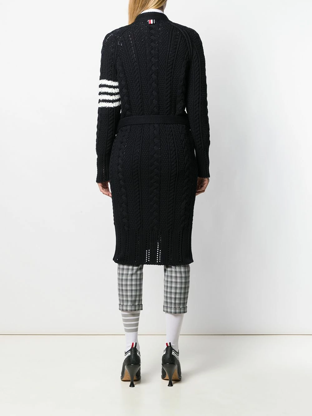 Stay cosy in style. This 4-Bar Thom Browne cardi-coat showcases the brand’s signature 4-Bar stripe for a preppy look. Wrap up warm! Featuring a v-neck, long sleeves, a front button fastening, two front pockets, a mid-length, an aran knit, a signature grosgrain loop tab and a 4-Bar stripe.