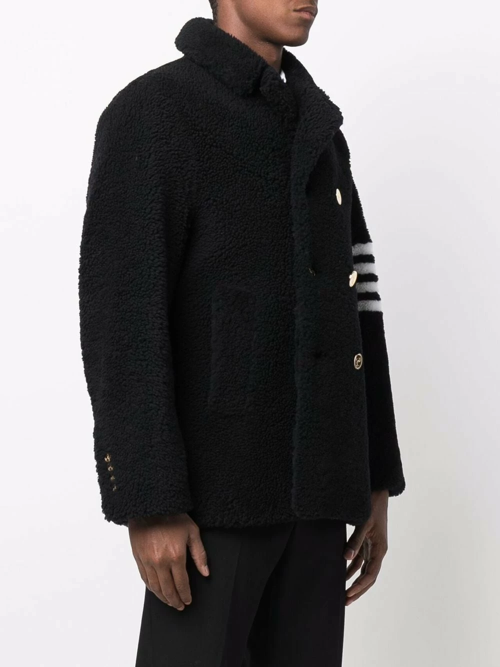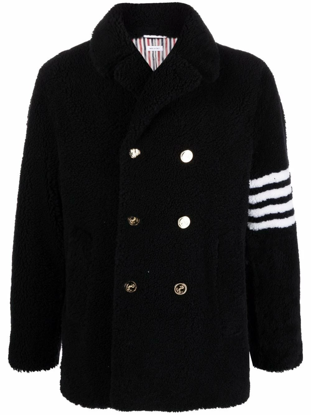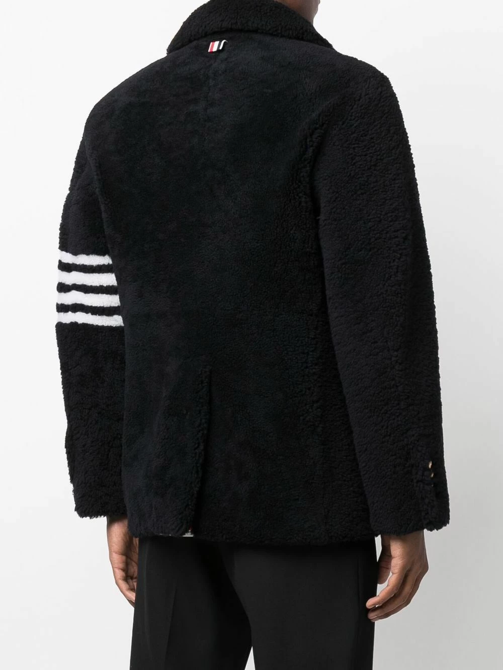 Thom Browne is famous for defying convention to present modern tailored designs as this double-breasted jacket. Distinguished by the textured finish, this piece is presented with the label’s signature 4-Bar at the left sleeve.