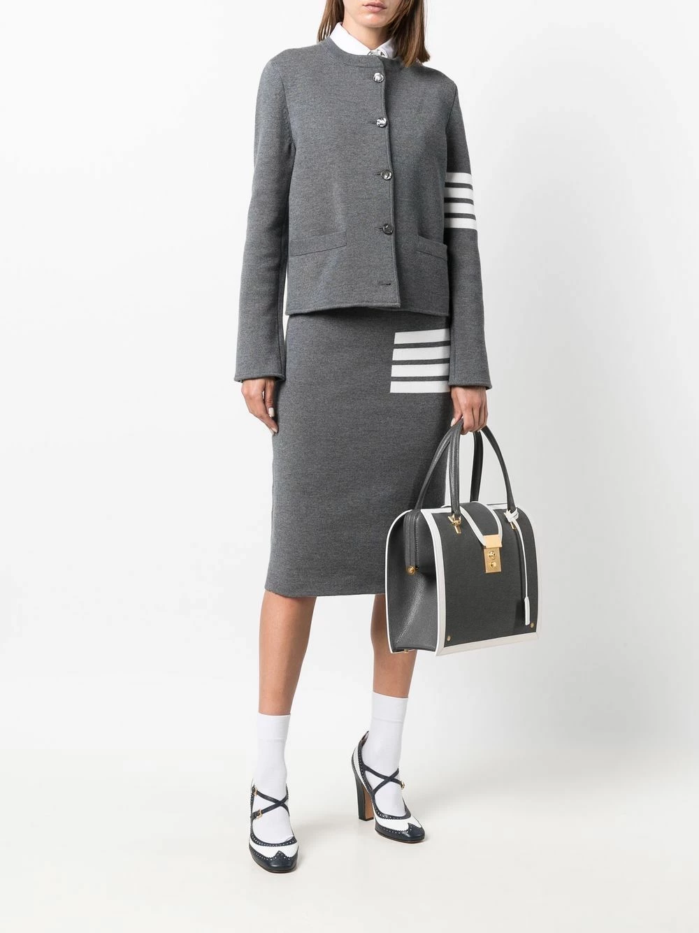 Spun from a virgin wool-blend, this medium grey skirt from Thom Browne is detailed with the signature 4-Bar stripe embellishment for a recognisable finish. The mid-length design has a knitted construction and falls to an elegant knee length.
