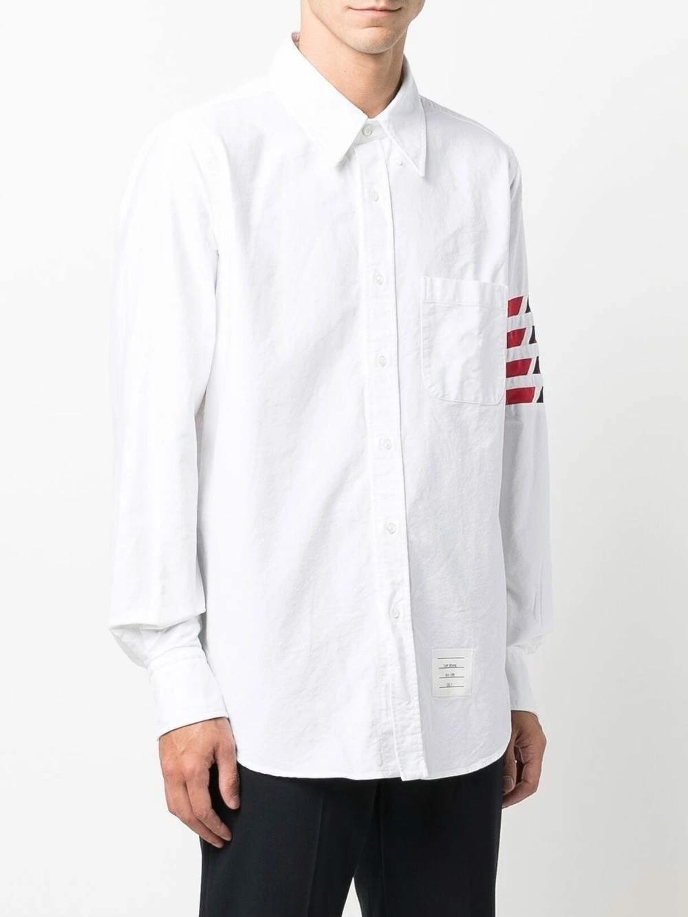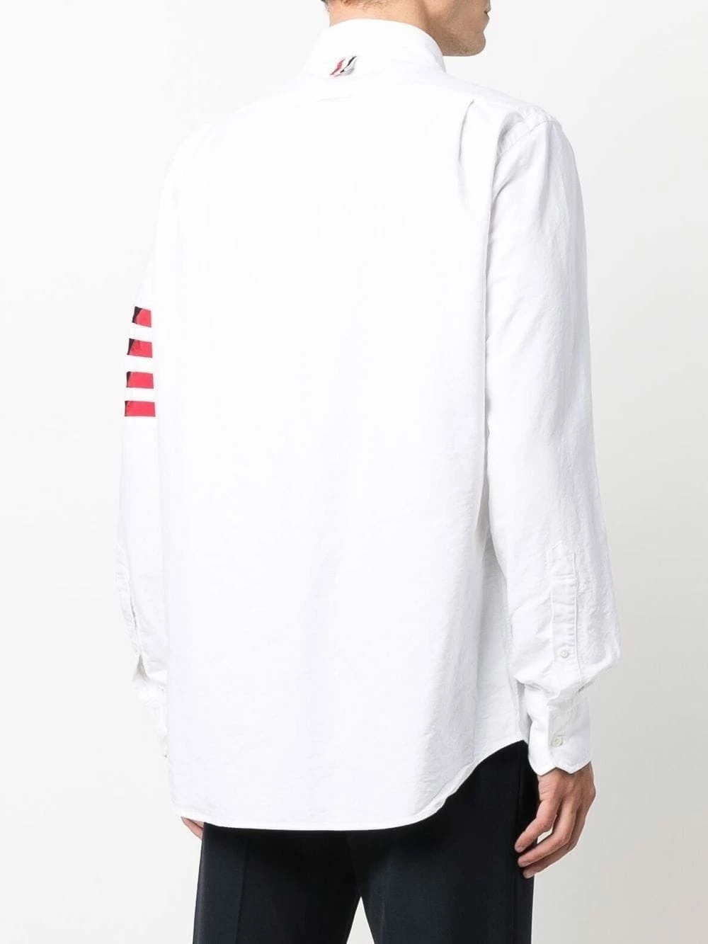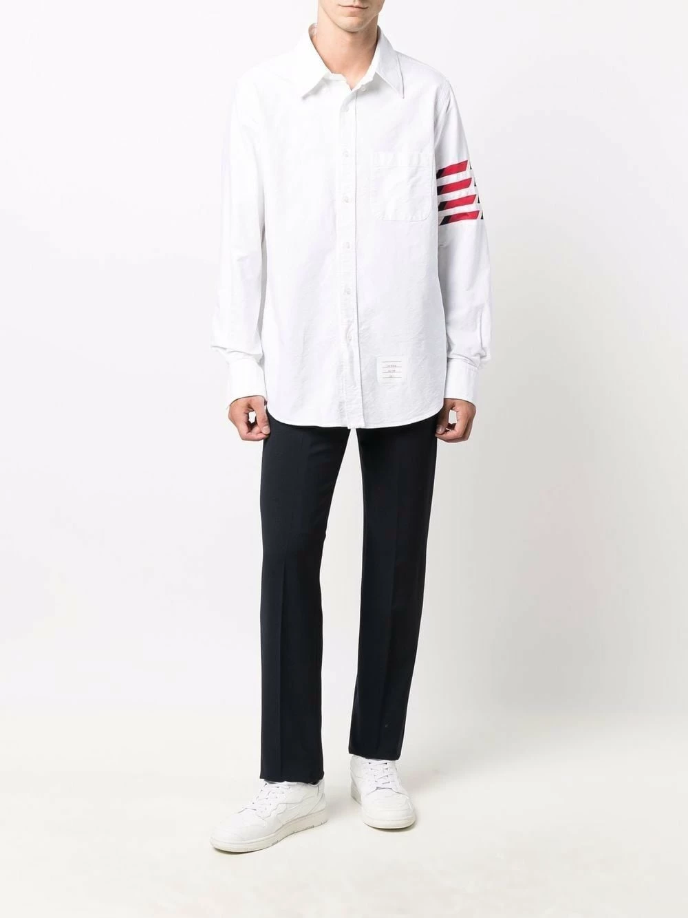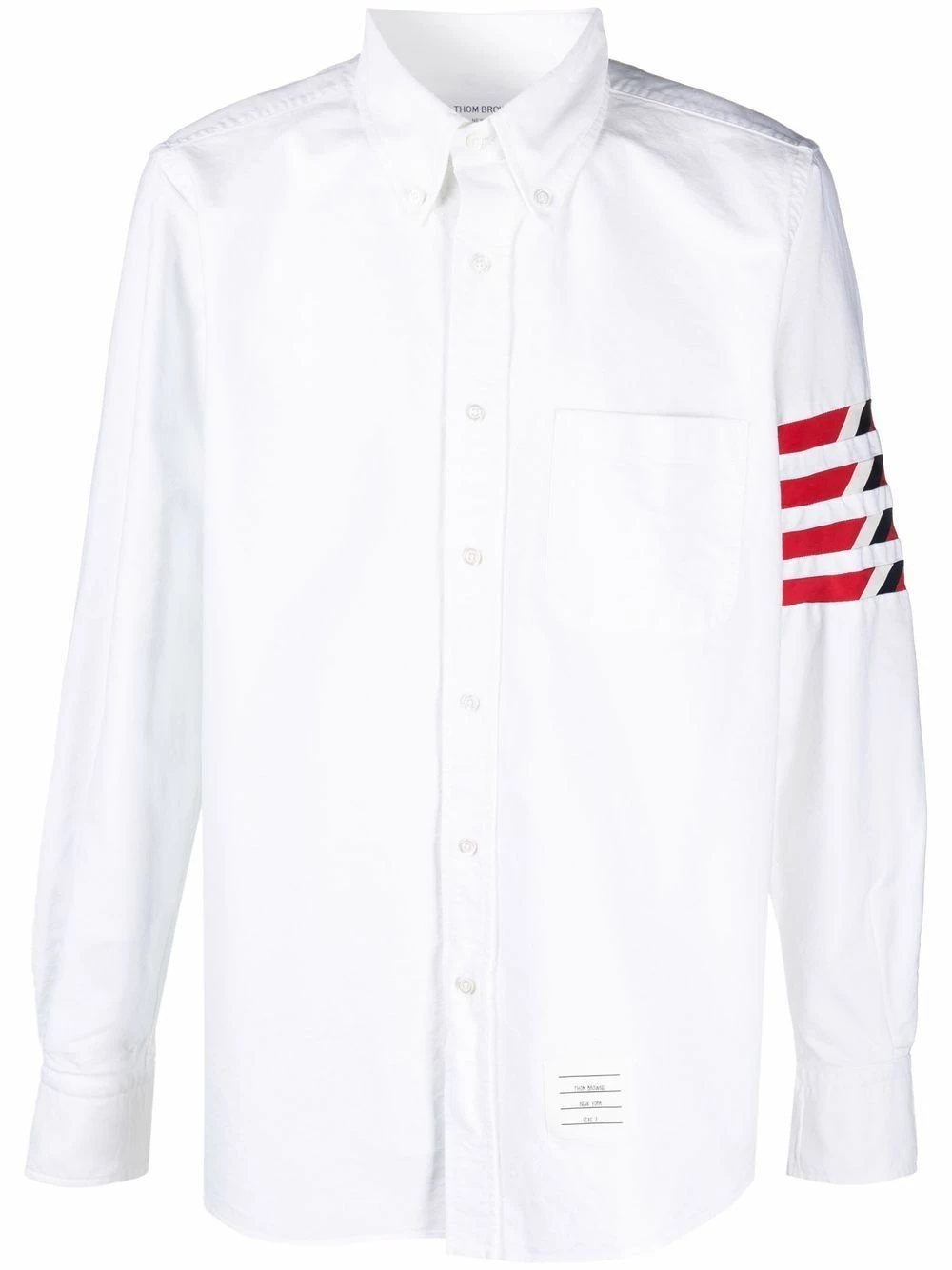 Thom Browne’s signature 4-Bar stripe is updated for AW21. In this white long-sleeve shirt, the iconic motif incorportates a red, white and blue stripe pattern.