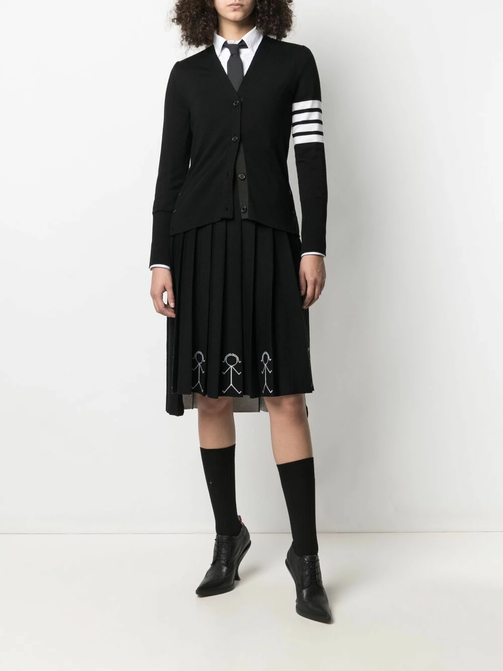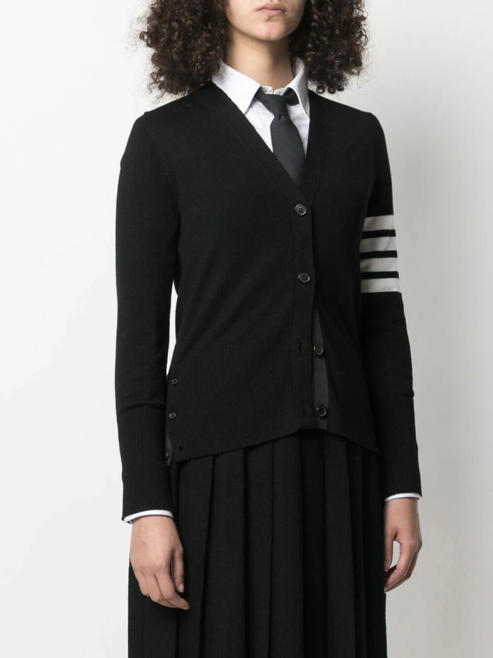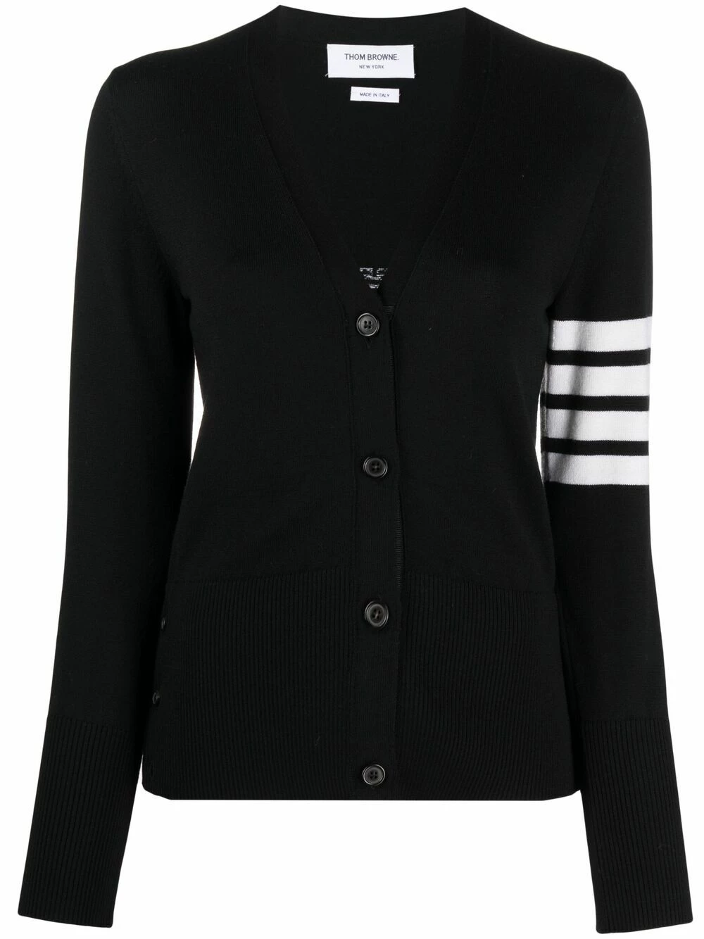 When cold weather calls, Thom Browne answers. Boasting a cosy merino wool construction and the brand’s signature 4-Bar stripe at the arm, this V-neck cardigan is a welcome addition to any knitwear collection.