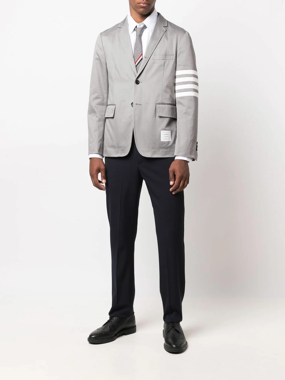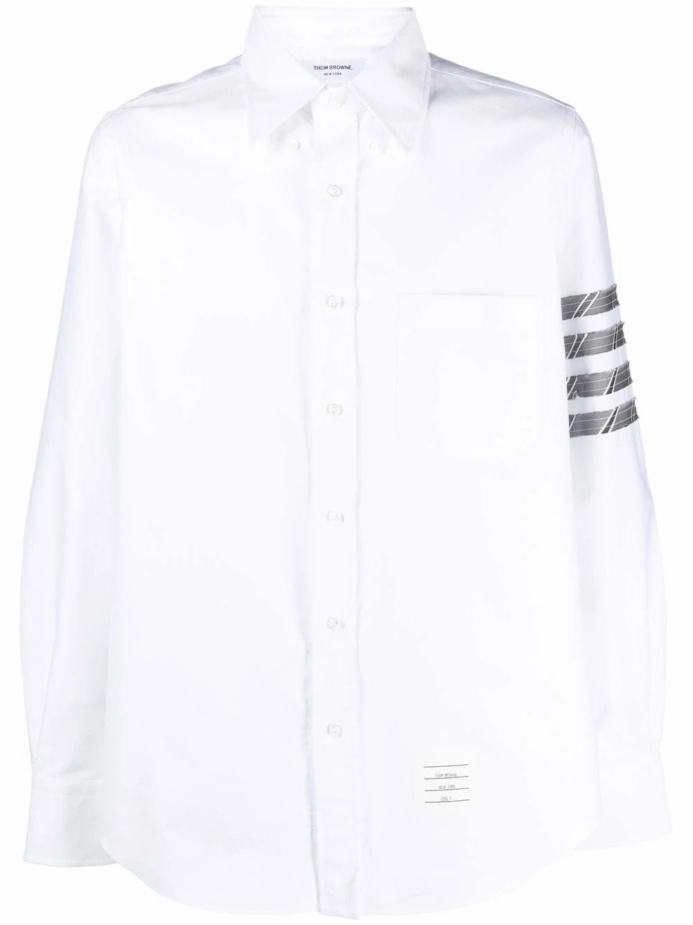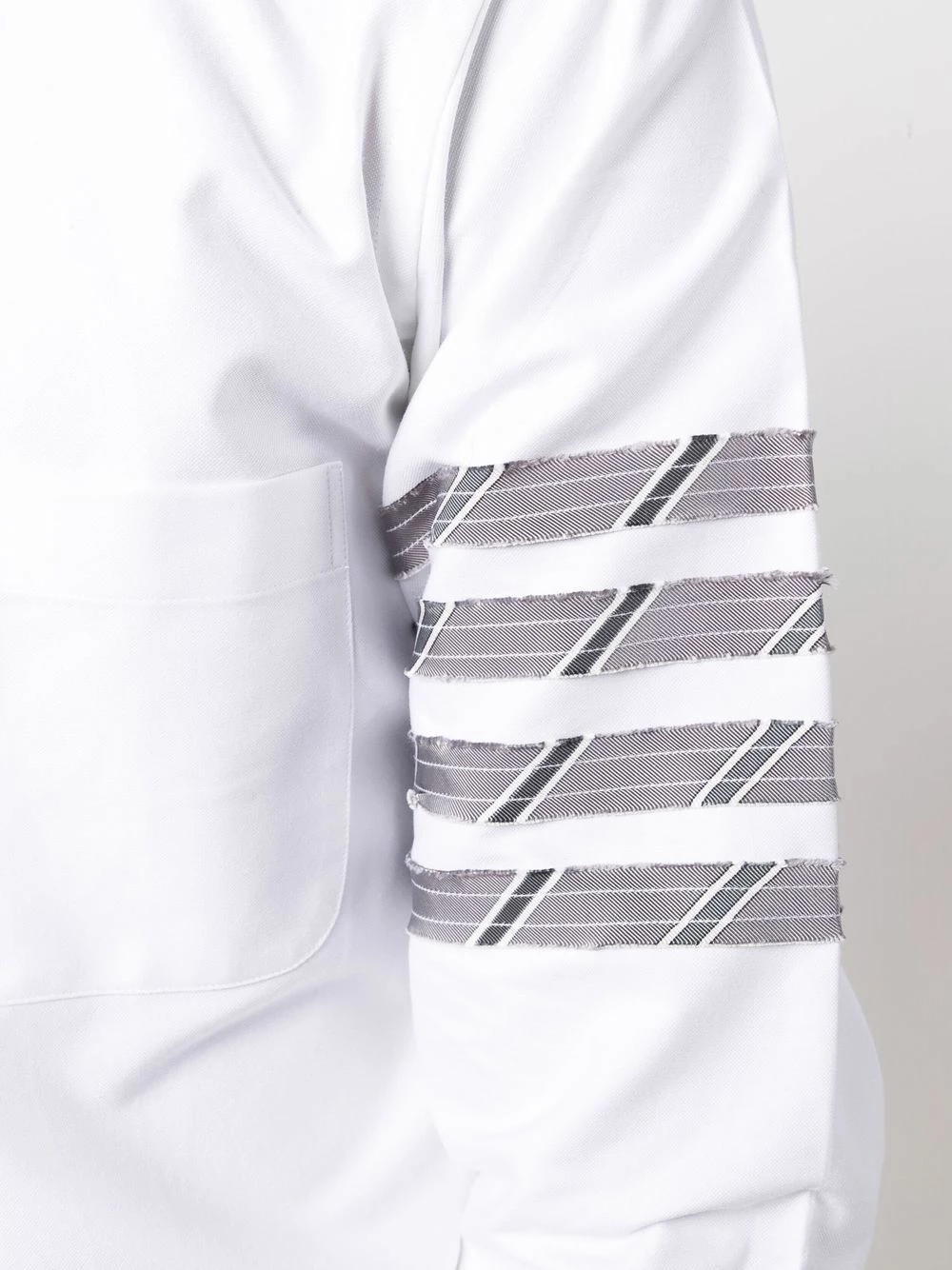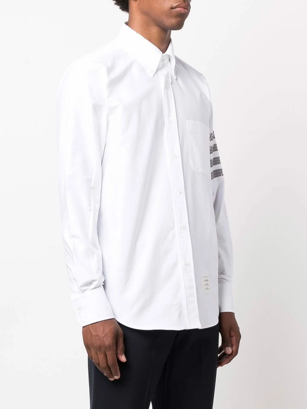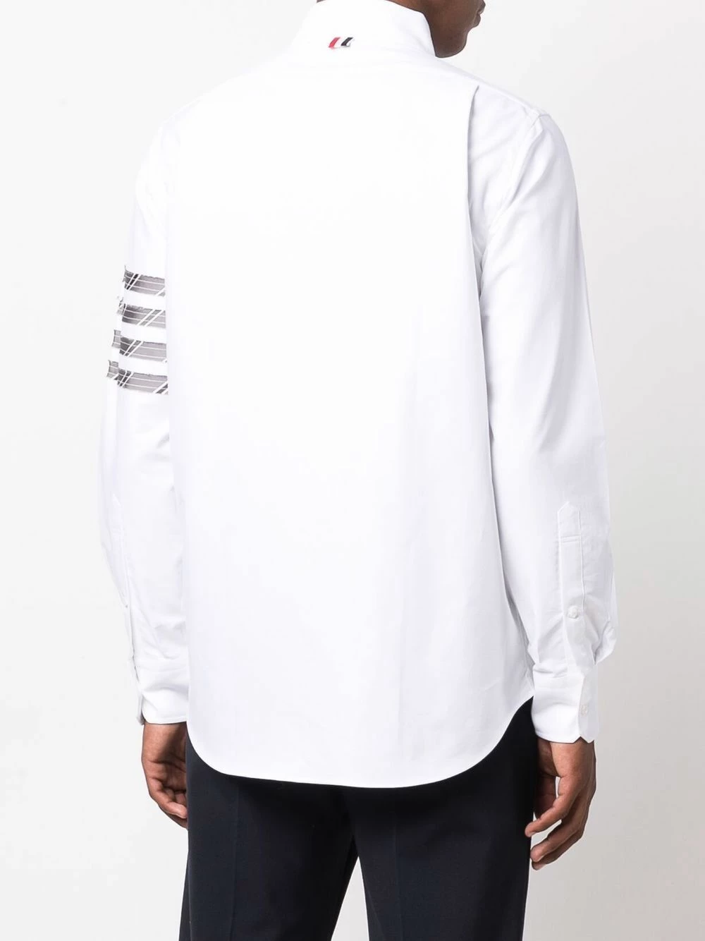 Thom Browne wears not his heart, but his stripes on his sleeve. Case in point: this signature 4-Bar stripe sleeve shirt. An elevated design of the classic button-up shirt.