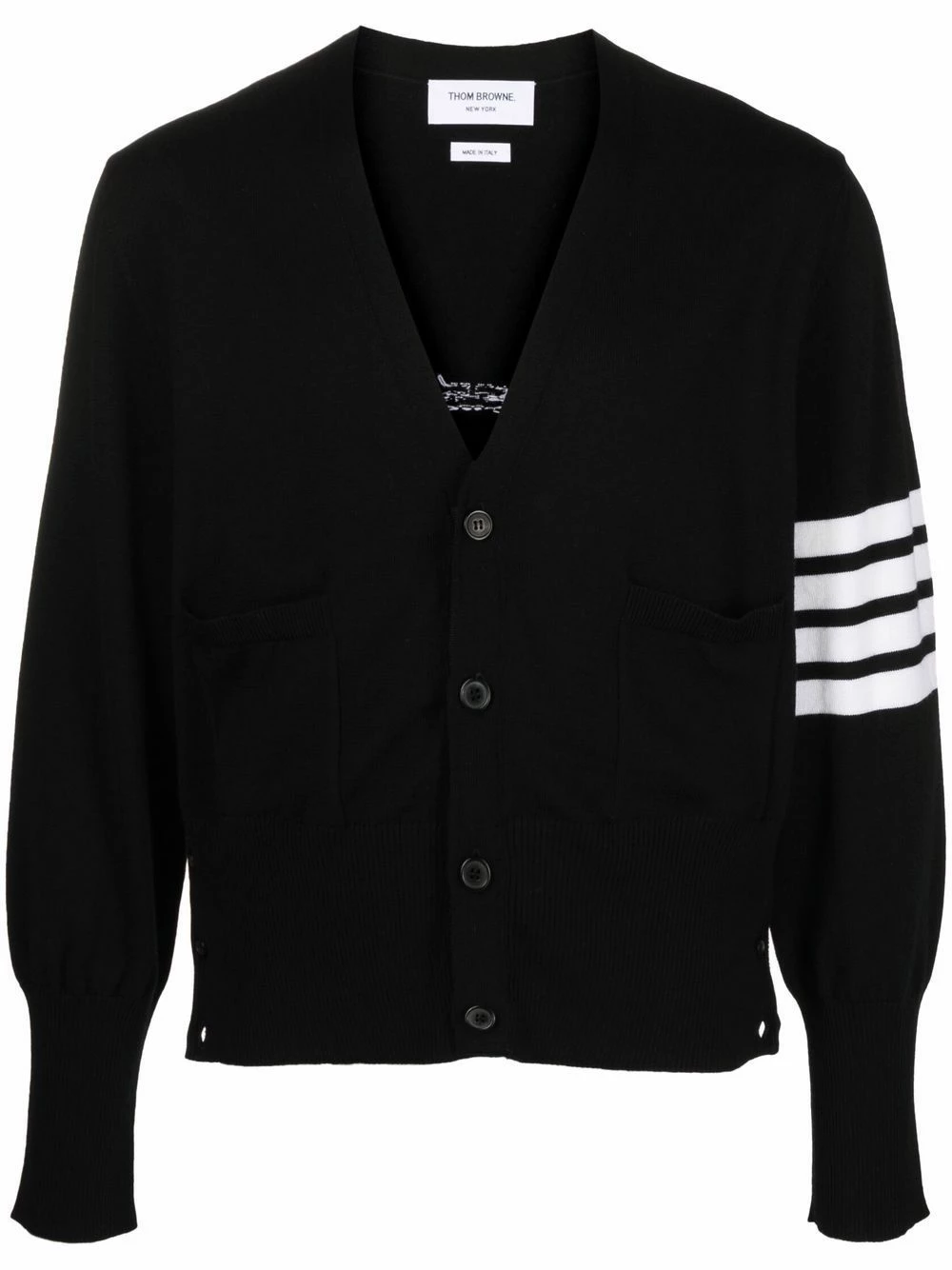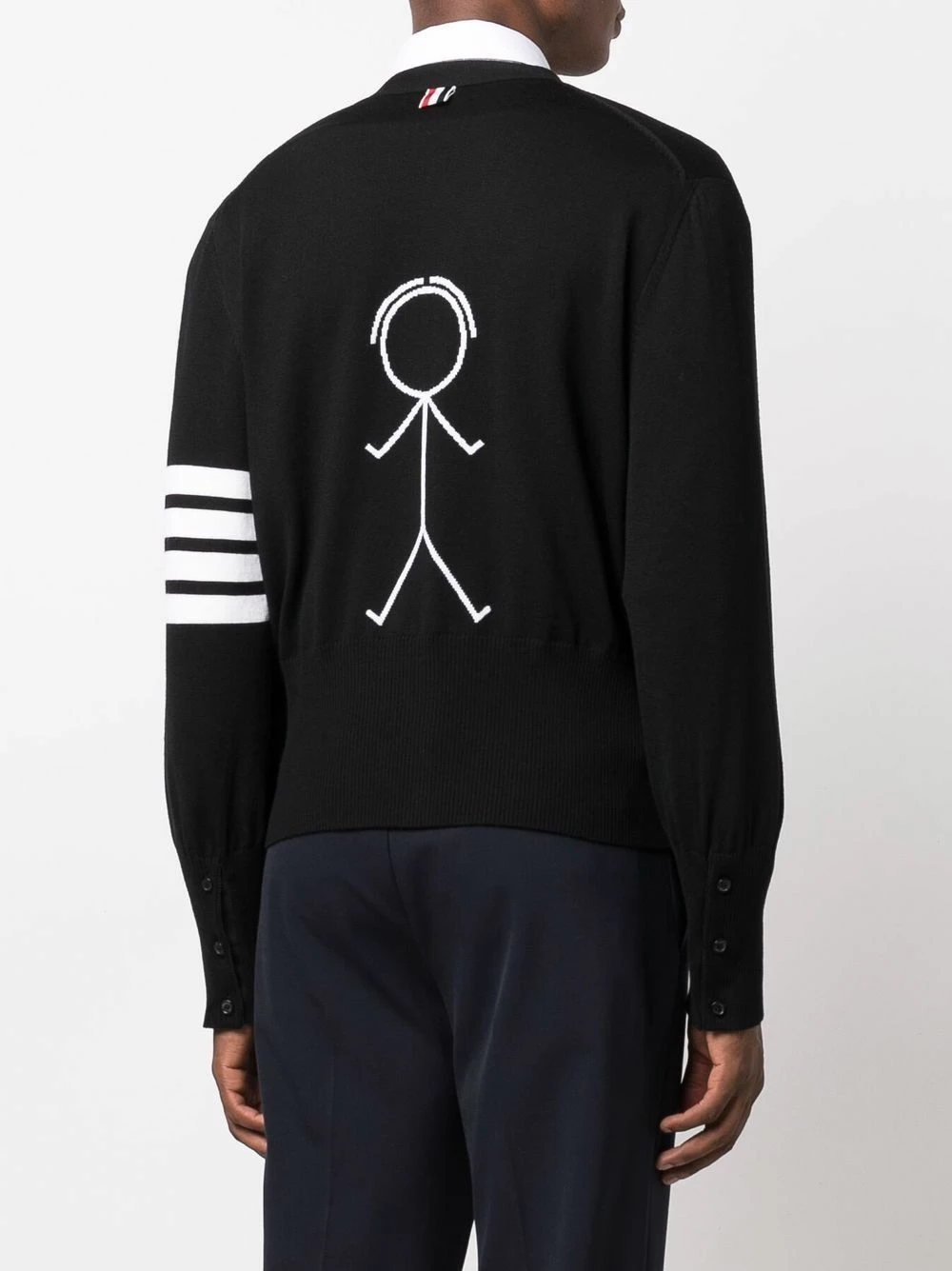 An iconic symbol of the Thom Browne house, the 4-Bar Stripe is seen in every collection. For AW21, it’s presented on its usual spot: the left upper arm of this pure merino cardigan.