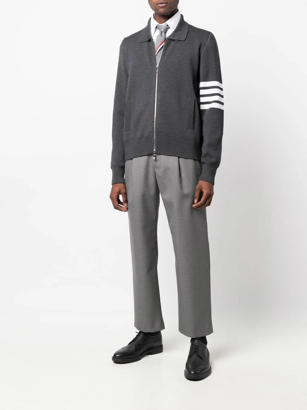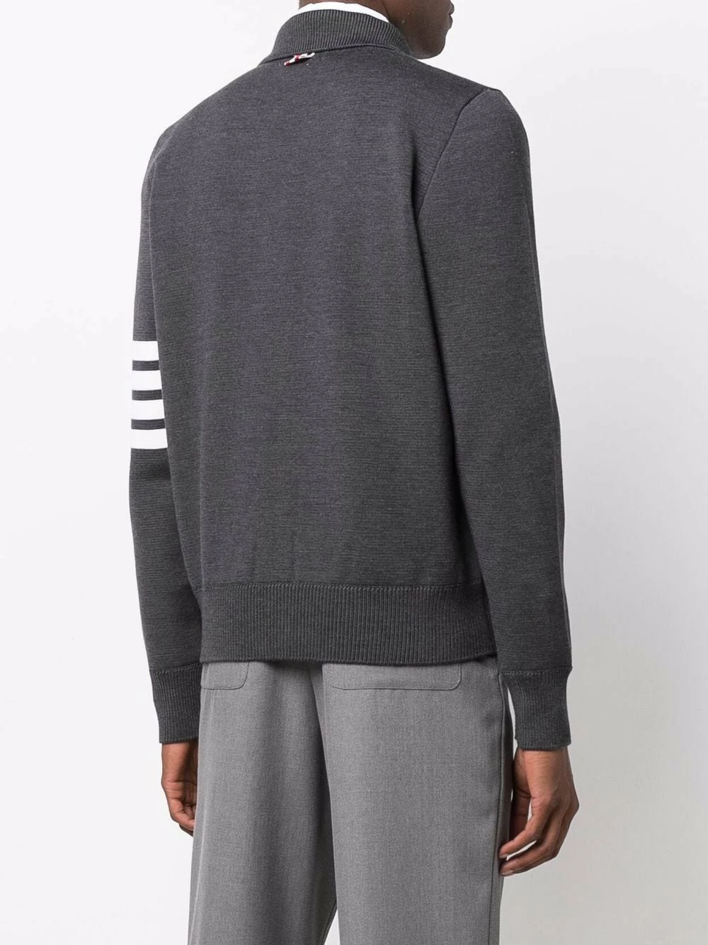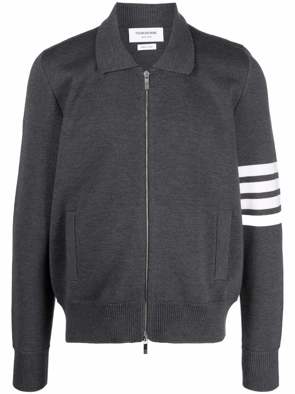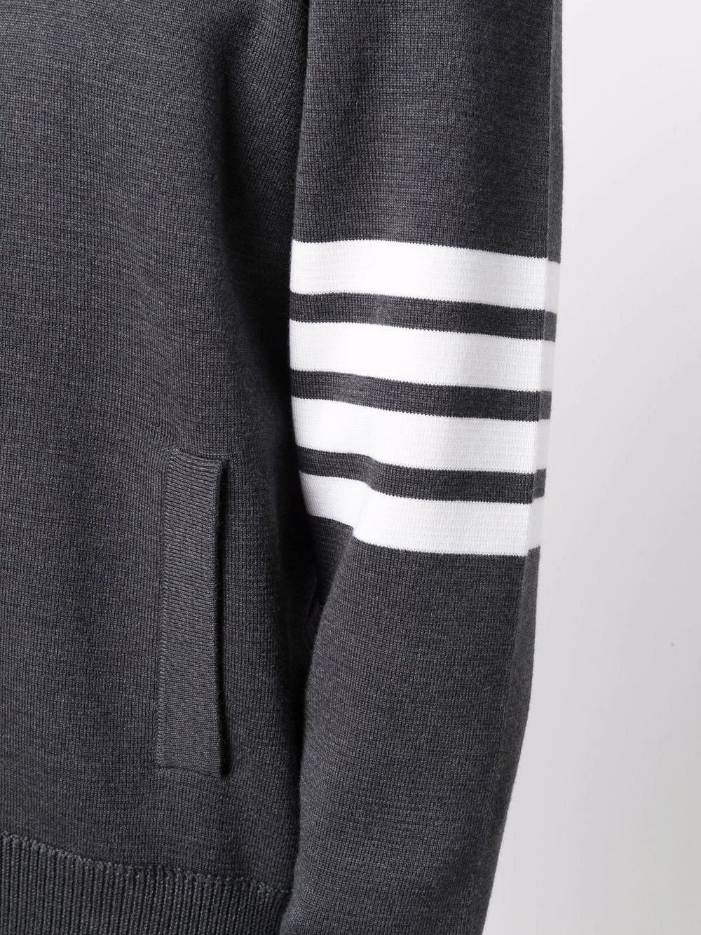 Thom Browne’s zip-up jumper is a lesson in smart-casual dressing. Spun from plush merino wool, this grey iteration is punctuated with the brand’s signature 4-Bar stripe at the sleeve for a sporty finish.