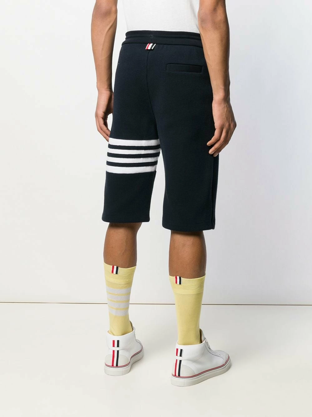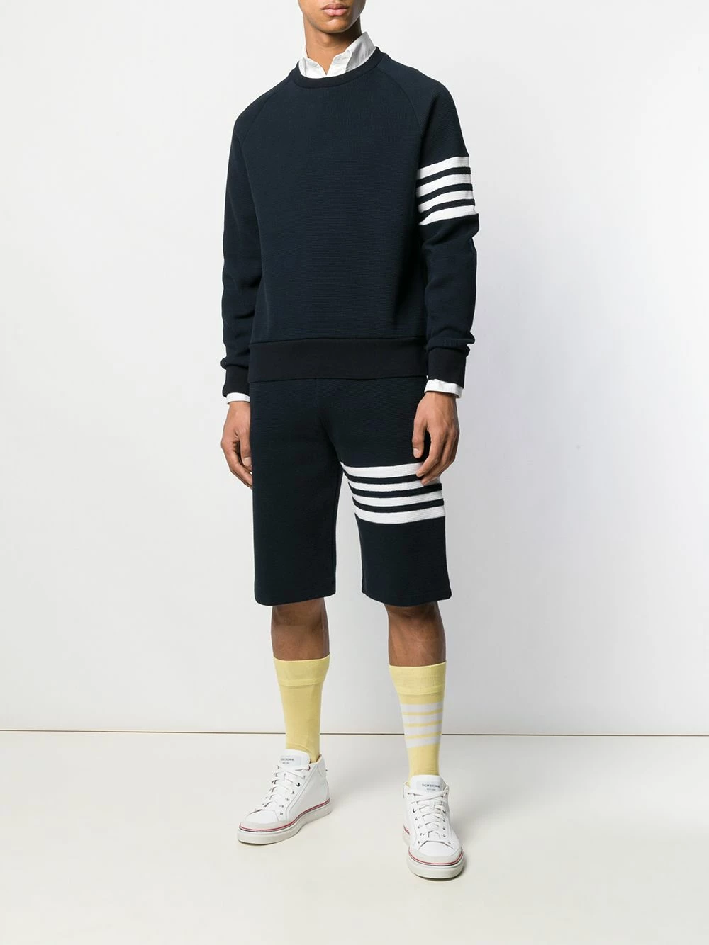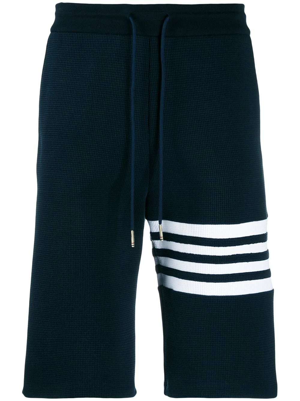 A lineup of investment pieces designed to withstand the test of time, Thom Browne’s most recent collection continues to blur the lines between refined tailoring and contemporary sportswear. As seen in these dark navy blue cotton 4-Bar Sweatshorts that feature an elasticated waistband with a drawstring fastening, a tricolour grosgrain tab on the rear and signature quadruple white stripes.