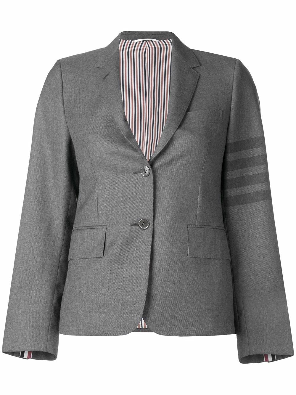 Grey wool 4-Bar tailored blazer from Thom Browne featuring notched lapels, a front button fastening, long sleeves, button cuffs, front flap pockets and a double vent to the rear.