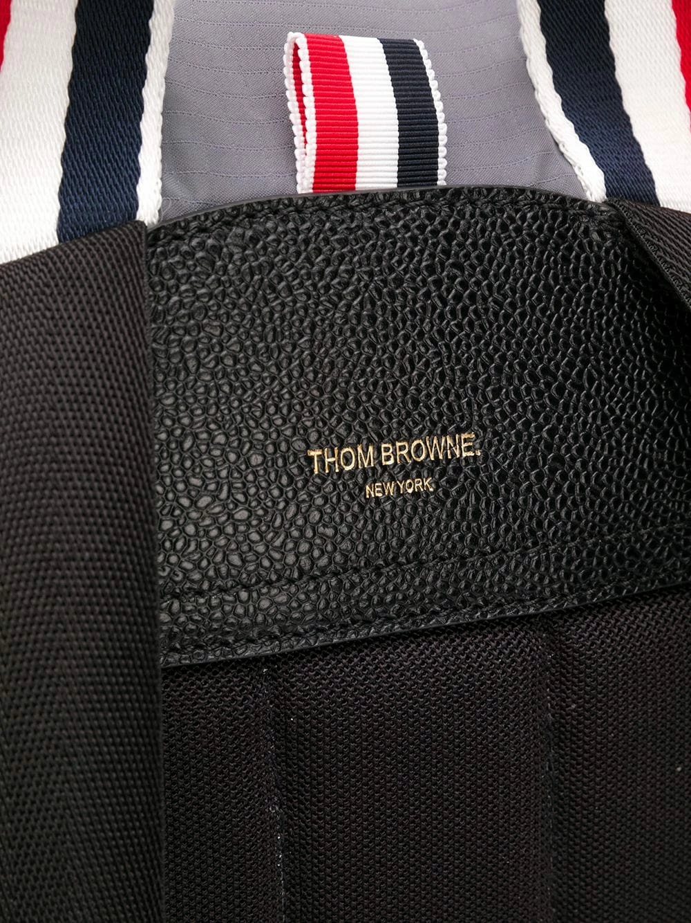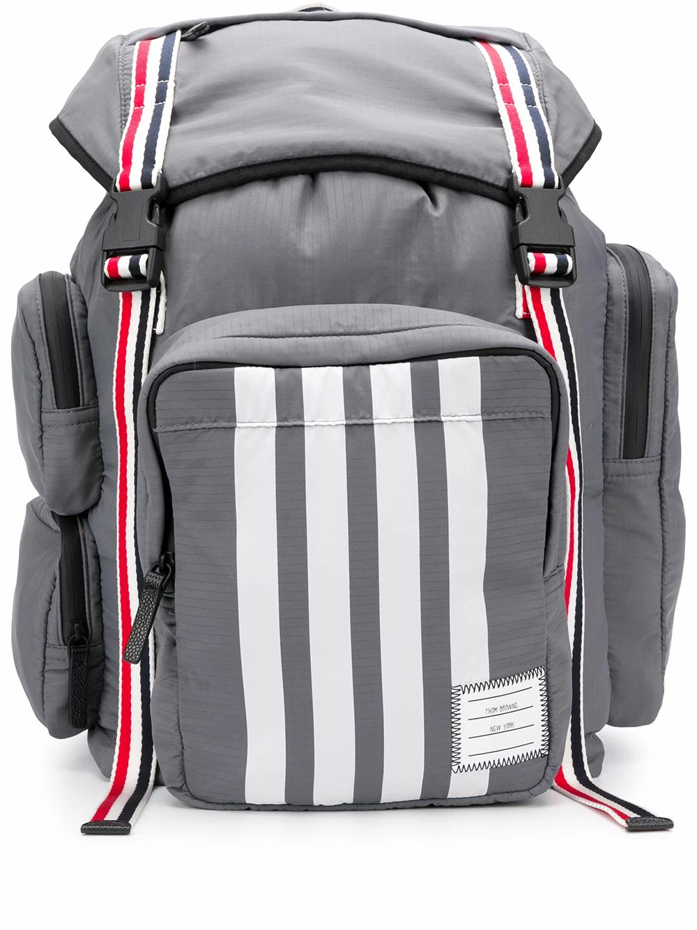 Boasting all the signature hallmarks of a Thom Browne piece with the 4-Bar print to the front and the three stripe web straps, this webbing backpack from Thom Browne also has multiple compartments to provide all a mass of storage. Featuring adjustable shoulder straps, a round top handle, a foldover top with clasp closure, side zipped pockets, a front zip compartment, a striped pattern, a front logo patch and a back embossed logo stamp.