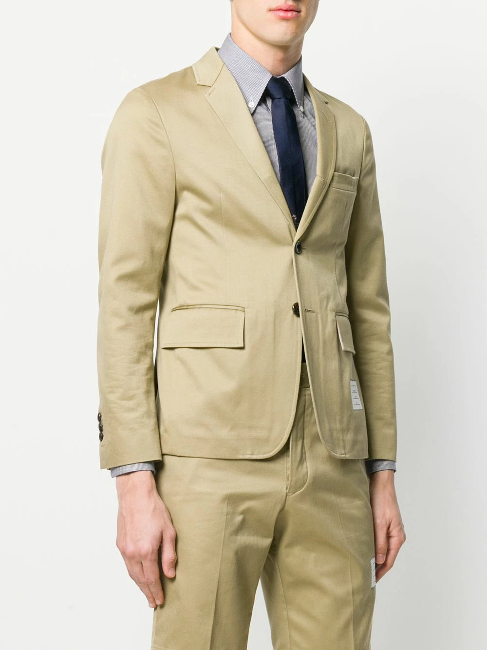 Camel cotton unconstructed single-breasted 4-bar jacket from Thom Browne featuring notched lapels, cropped sleeves, button cuffs, a front button fastening, a broad welt chest pocket, front flap pockets, a front logo patch and a double vent to the rear.
