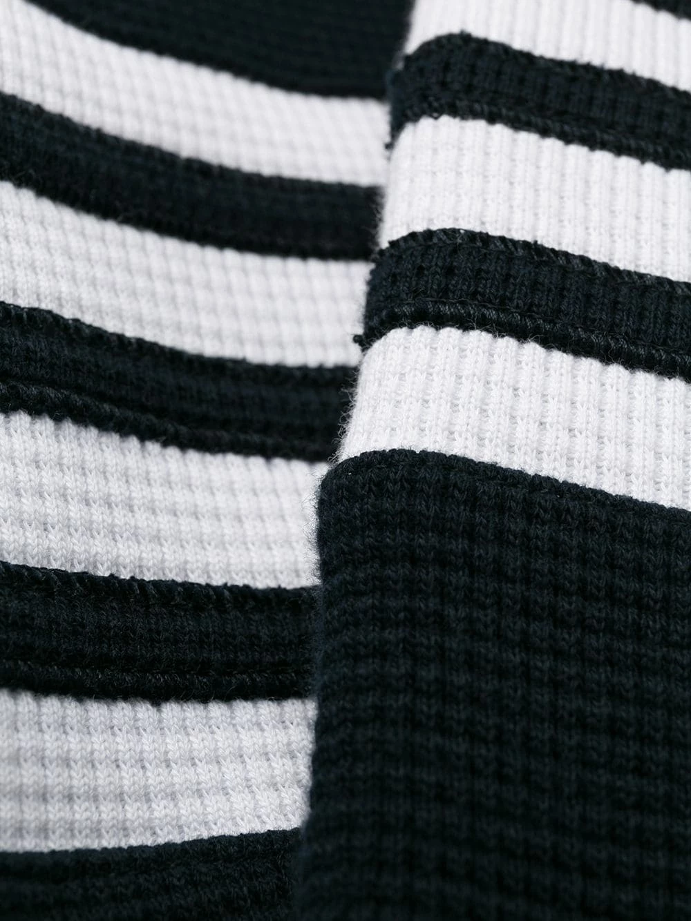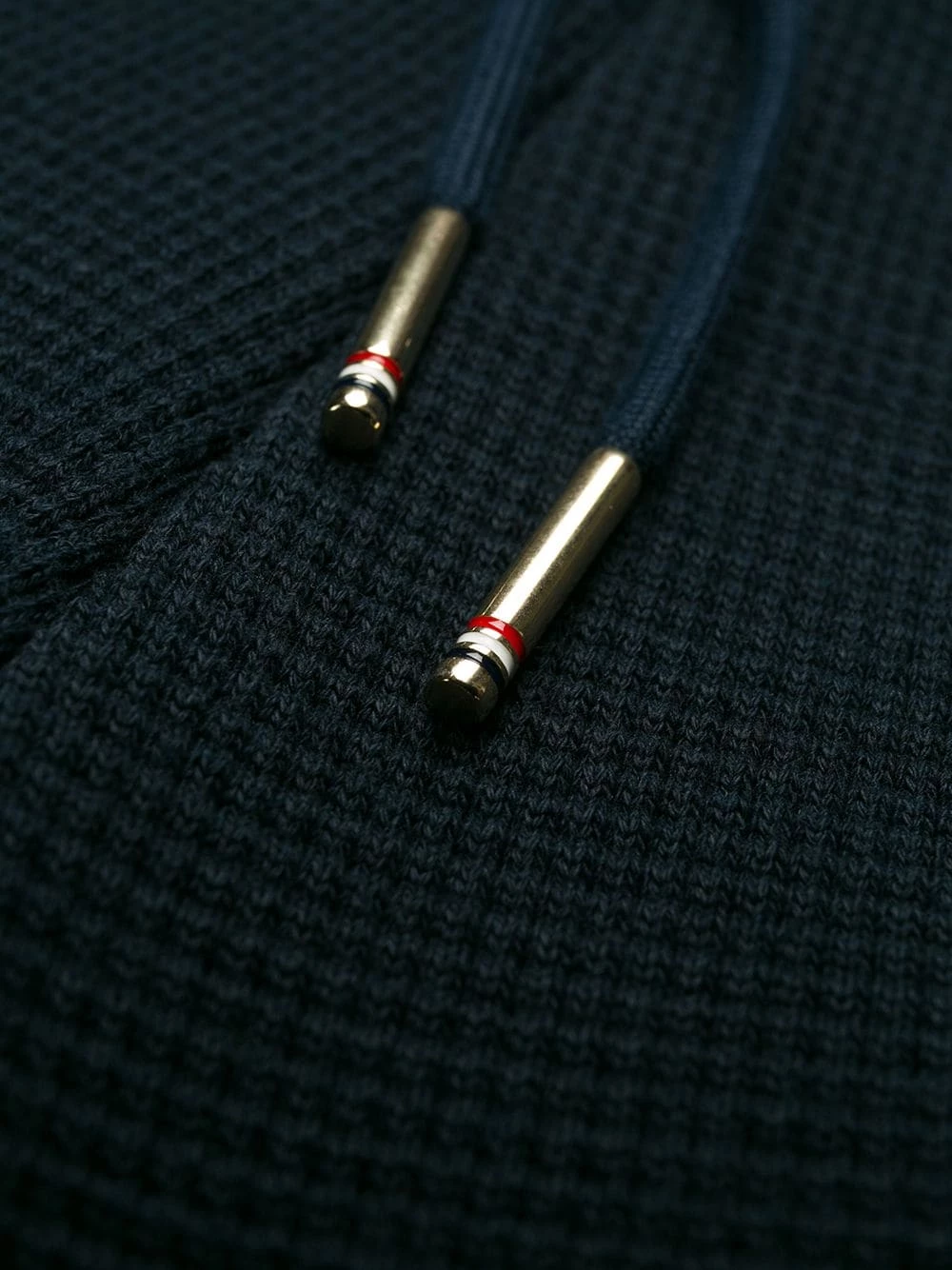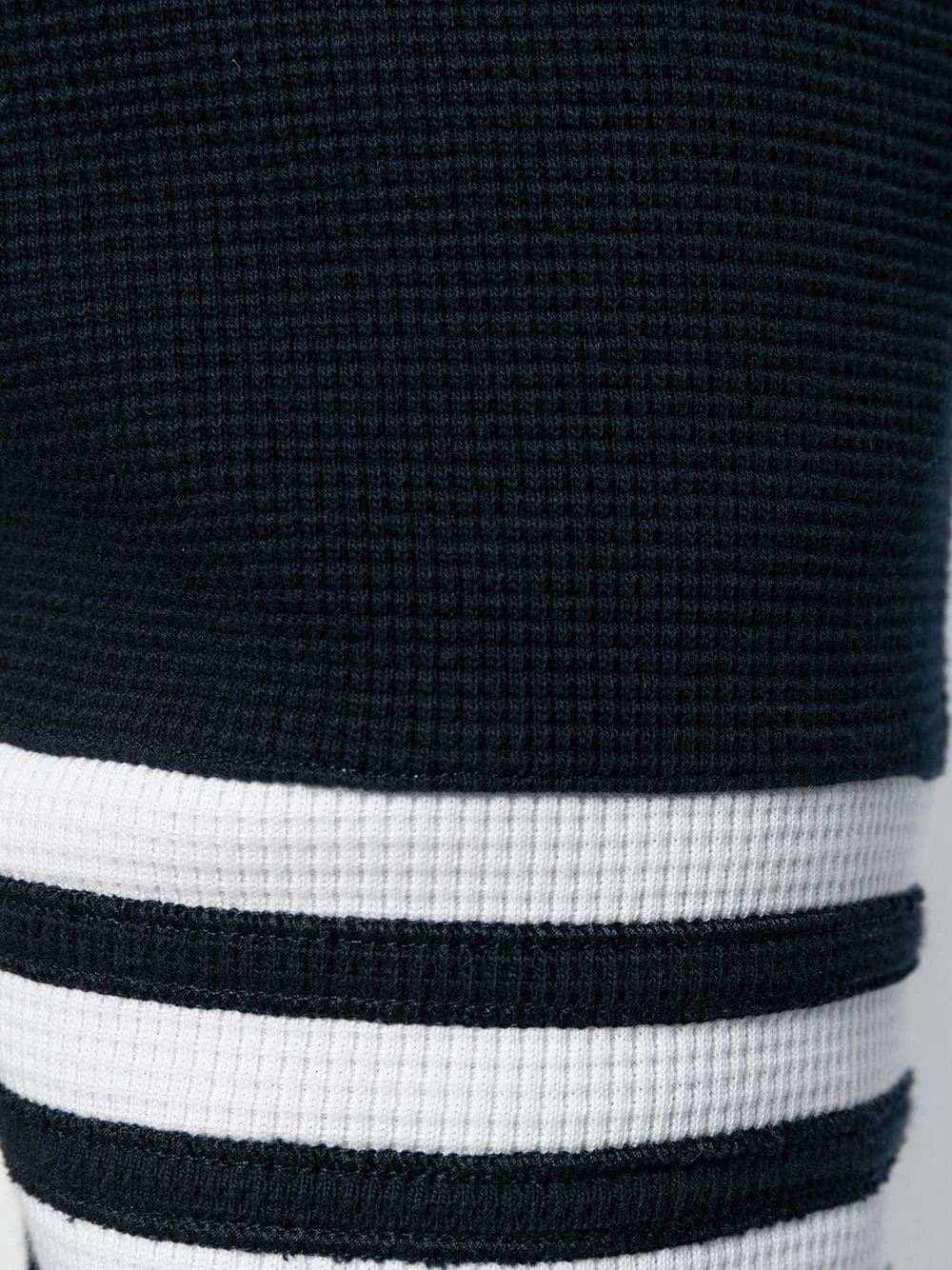 Combining highest-quality fabrics and a conservative sensibility with a touch of irreverence and humour, these navy cotton waffle stitch 4-bar stripe track pants from Thom Browne are a signature. Featuring a drawstring waist, side pockets, a back pocket and gathered ankles.