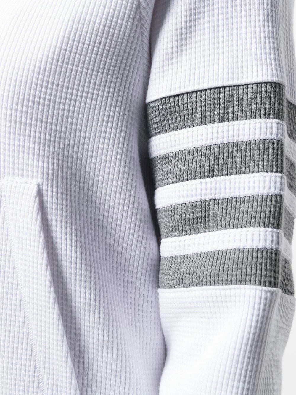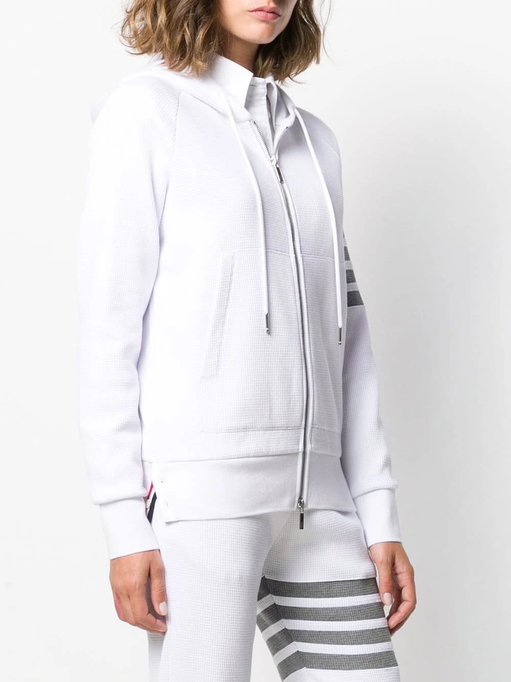 Make the gym your catwalk in this 4-Bar stripe hoodie from Thom Browne. Or, take advantage of its comfort factor and wear it on those lazy Sundays. No judgement here! Featuring a hood with drawstring tie fastenings, a front zip fastening, long length raglan sleeves, waffle textured details, side slit pockets, a ribbed hem and cuffs and a 4-Bar stripe.