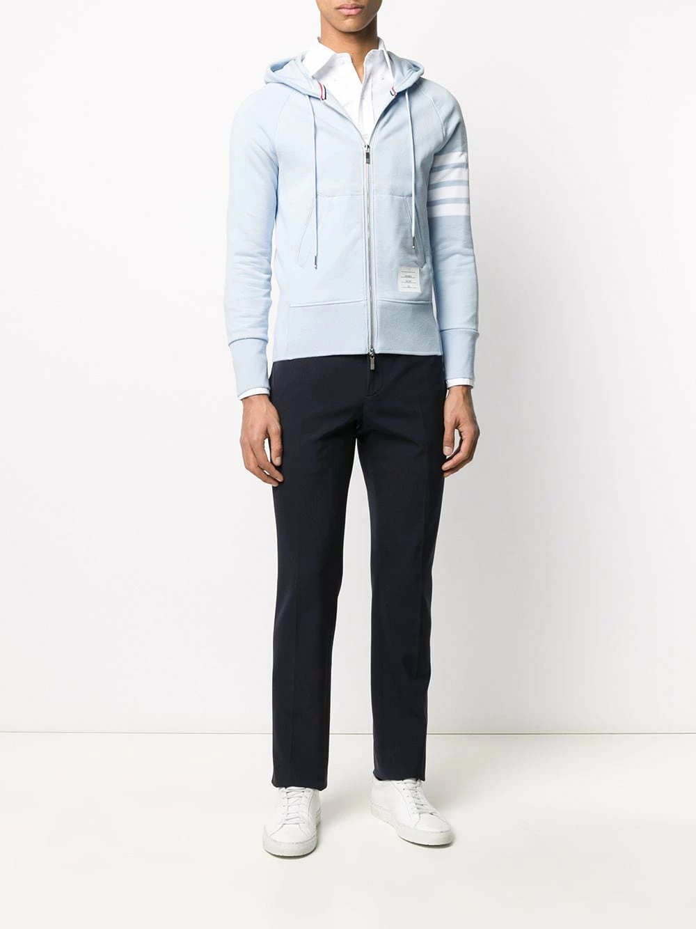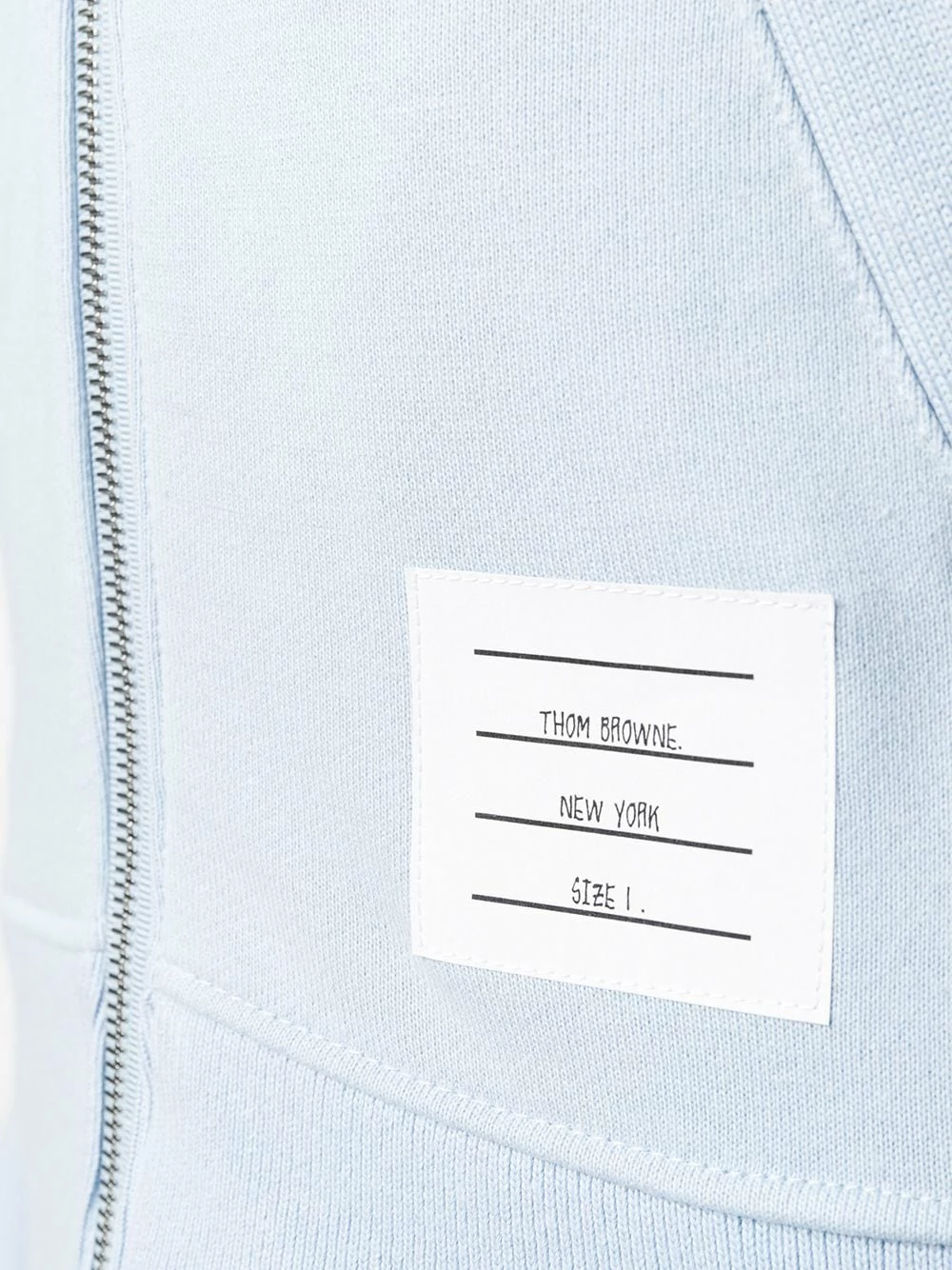 How do you know if you’re in control? Well, basically if you’re making the best of what comes your way. Takes this light blue cotton full-zipped hoodie from Thom Browne for example, in order to have it you have got to make a choice. No, this is not a drill. Featuring a hood with drawstring tie fastenings, long sleeves, two front pockets, a ribbed hem and cuffs, a straight hem, a logo patch detail and contrasting white four-bar stripes to the left sleeve.