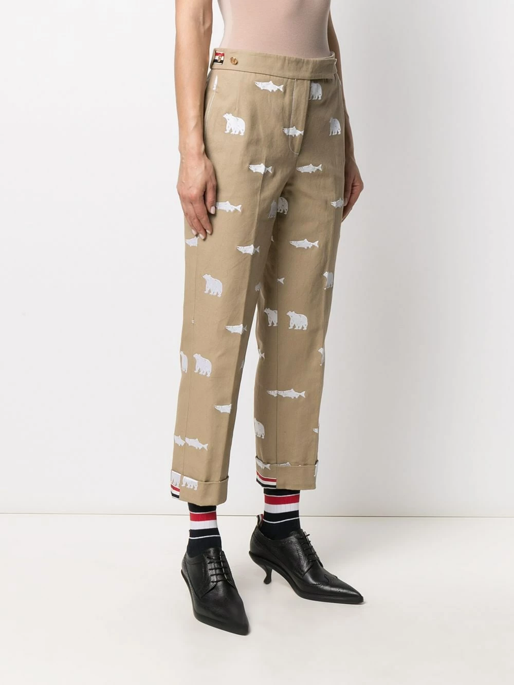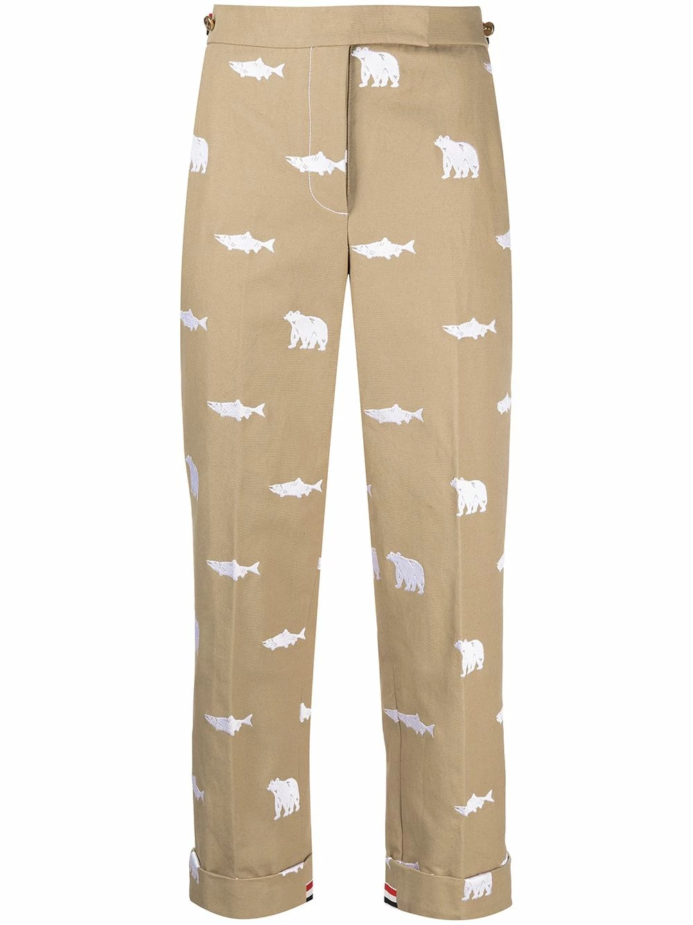 Fed up of making pointless conversation about the weather? Stop then and let your trousers do the talking if they’re as eye-catching and conversation commandeering as this pair of salmon and bear embroidered ones by Thom Browne. No need for small talk.