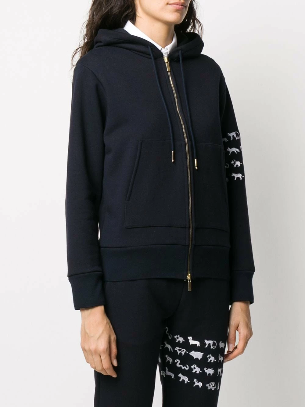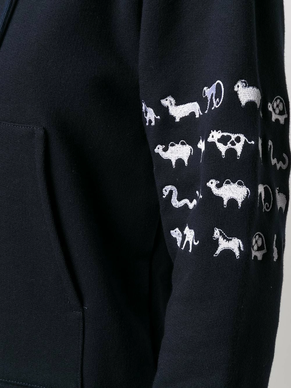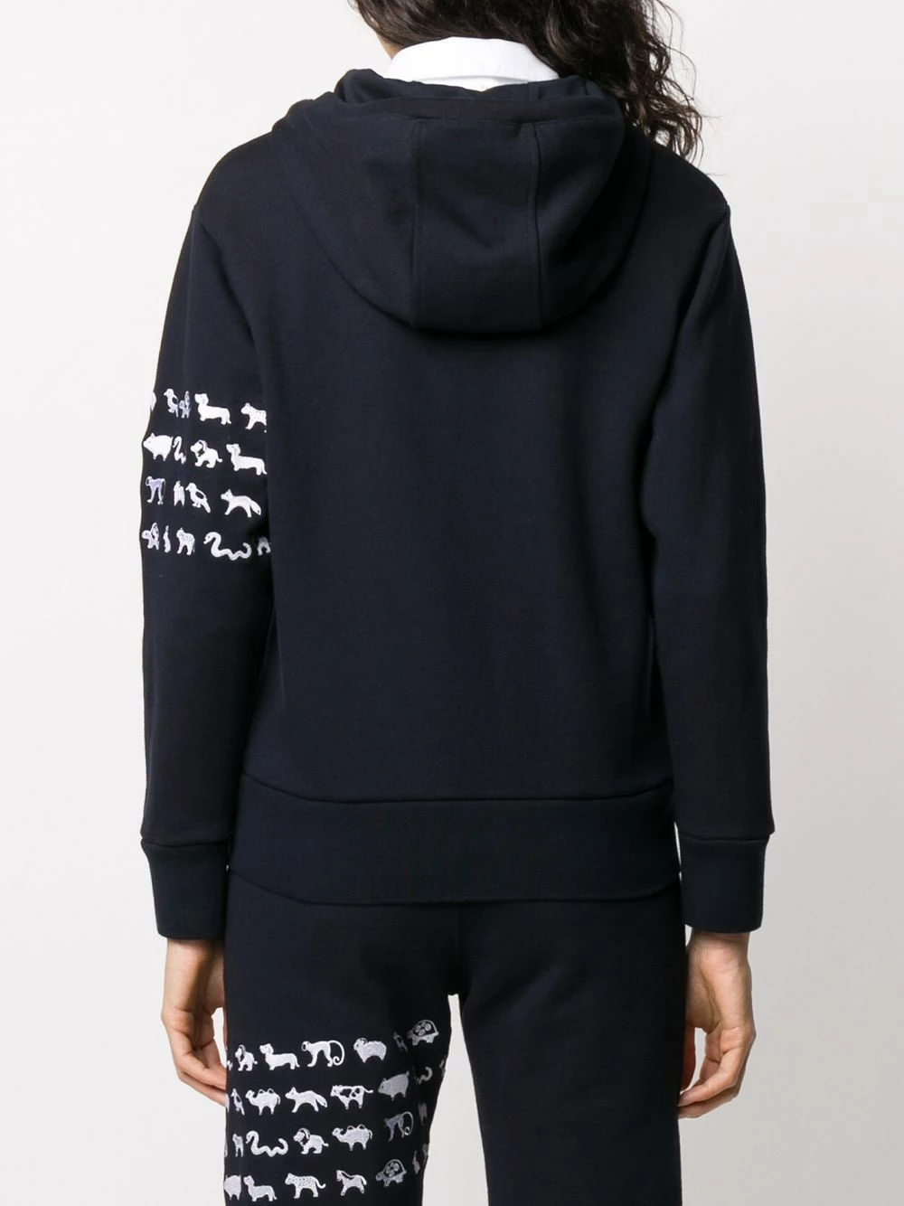 Who knew casual-wear could look so good? Clearly, Thom Browne did. And this piece proves that to achieve that, you need some quirky embroidered animals on the sleeve. Featuring a hood with drawstring tie fastenings, a front zip fastening, two front pockets, long sleeves, a relaxed fit, a 4-Bar stripe and embroidered animals.